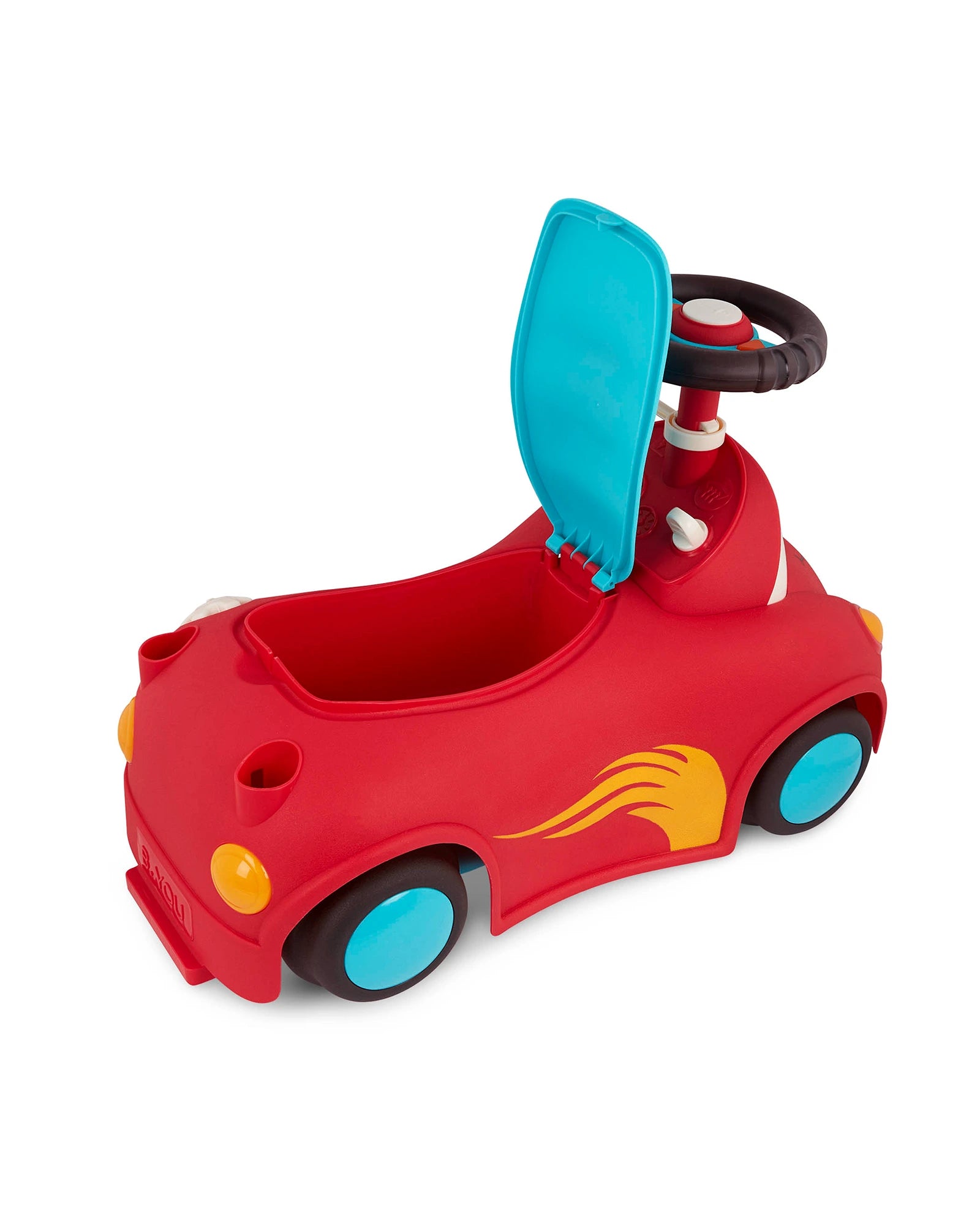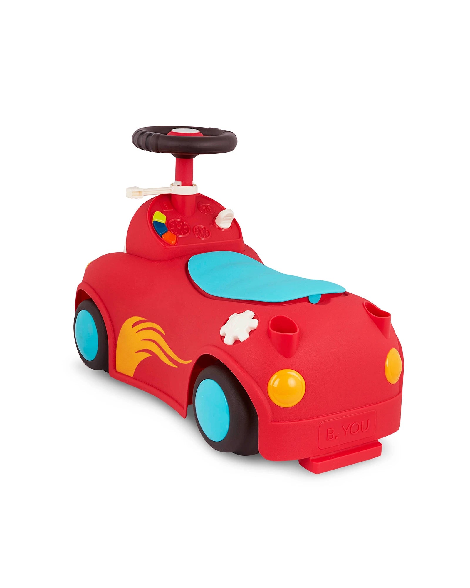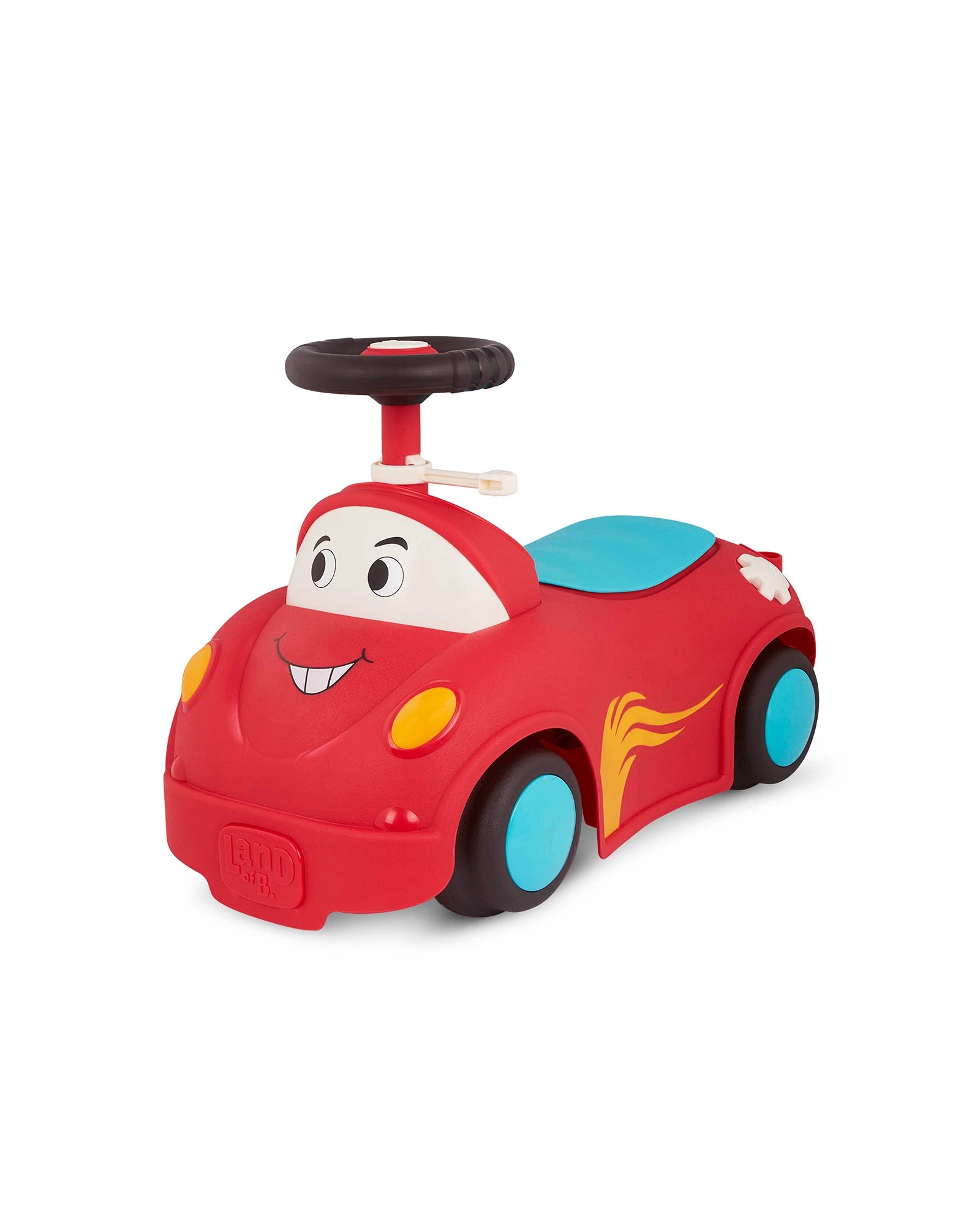 Push, scoot, store, and play with Freddy Zoom from the Rollin’ Riders collection by Land of B.! This ride-on race car features a kid-friendly design, songs, sounds, lights, an easily-removable handle, and secret storage space. Before rollin’ off on an adventure, pack your tiny treasures in the storage space right underneath the seat. Then hop on and ride into fun! As you scoot around the room, press the button on the speedometer to play 1 of 5 fun songs, then pull the gear up or push it down to activate the blinkers and fun sounds. Not only does this colorful ride-on encourage active play, but it can also improve a toddler’s motor skills. 3 AA batteries are required and included. Recommended for children 12 months and over.