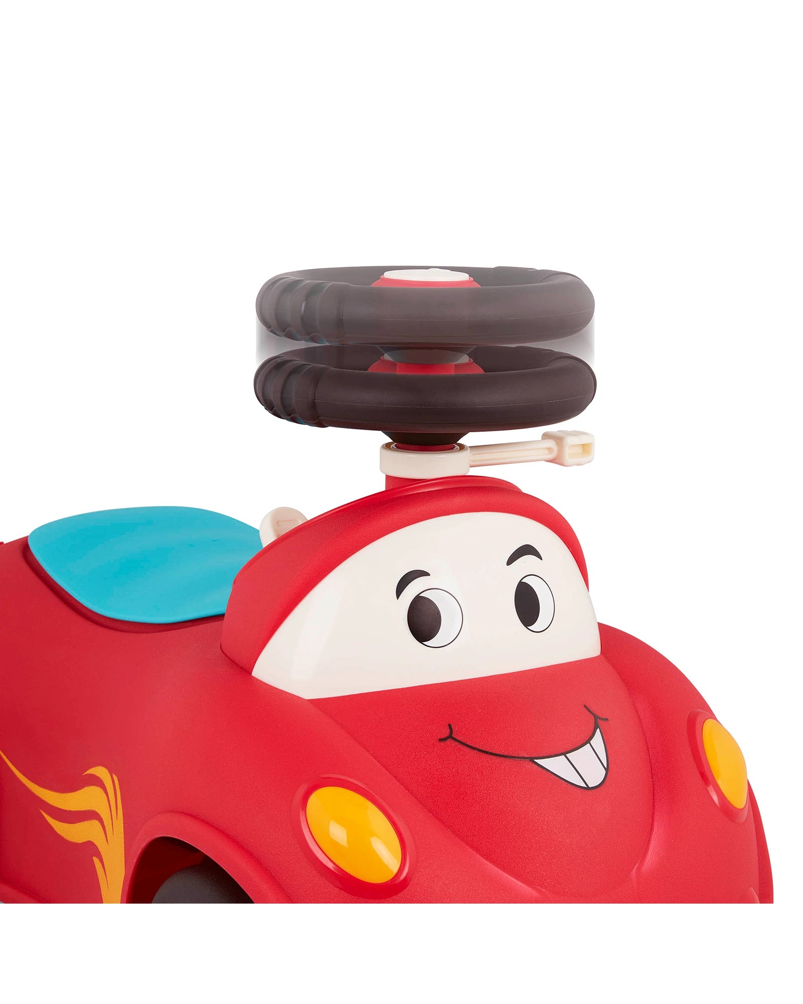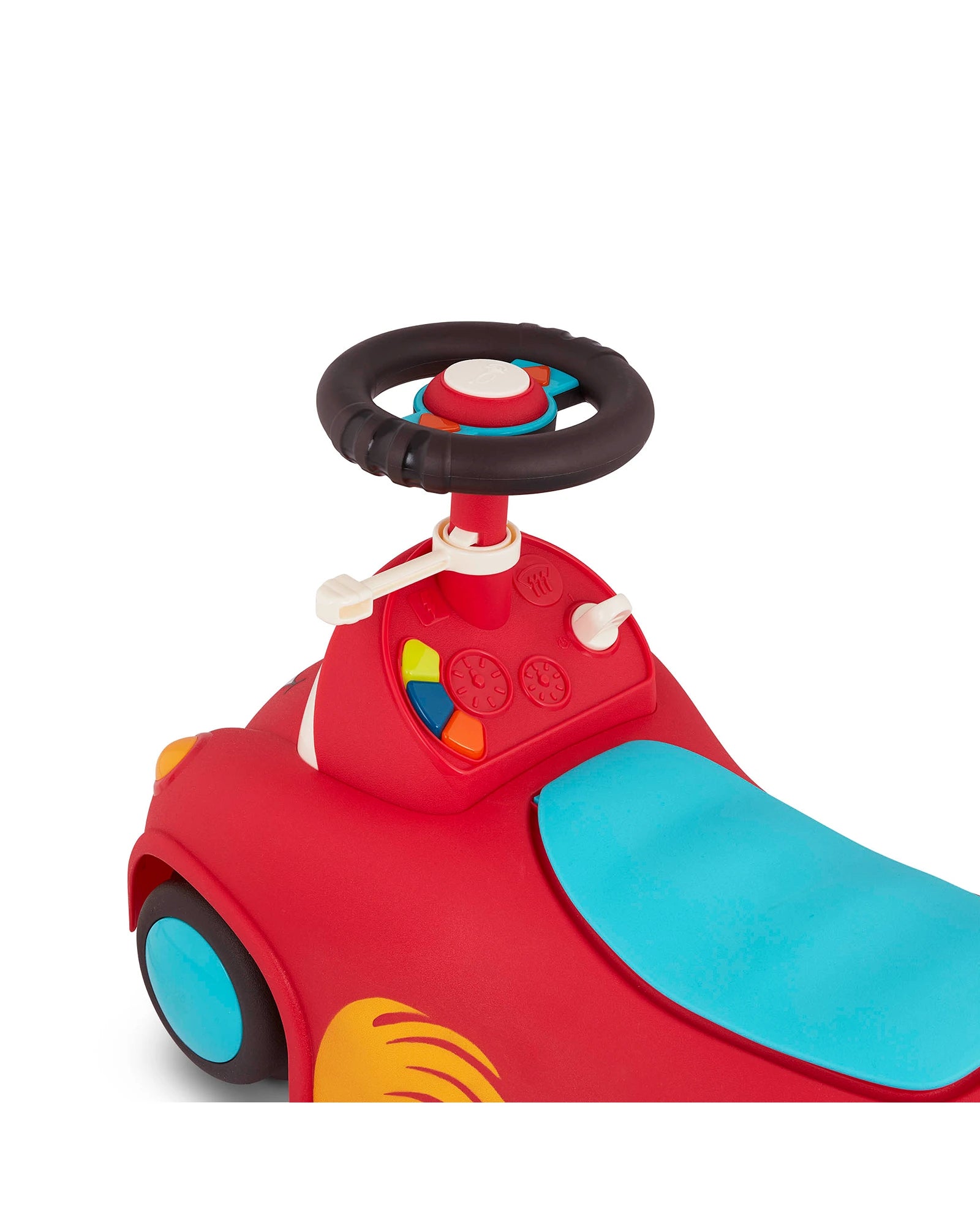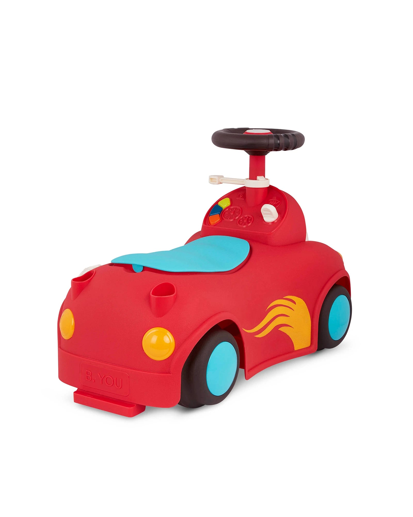Push, scoot, store, and play with Freddy Zoom from the Rollin’ Riders collection by Land of B.! This ride-on race car features a kid-friendly design, songs, sounds, lights, an easily-removable handle, and secret storage space. Before rollin’ off on an adventure, pack your tiny treasures in the storage space right underneath the seat. Then hop on and ride into fun! As you scoot around the room, press the button on the speedometer to play 1 of 5 fun songs, then pull the gear up or push it down to activate the blinkers and fun sounds. Not only does this colorful ride-on encourage active play, but it can also improve a toddler’s motor skills. 3 AA batteries are required and included. Recommended for children 12 months and over.