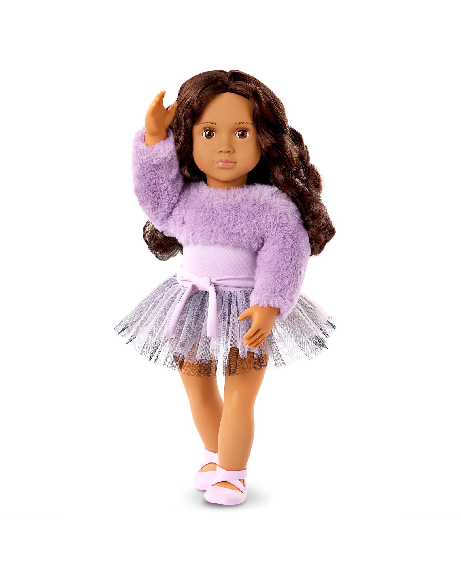 Leap into a world of twirls with Our Generation 18-inch ballerina doll Jovanna! Ready to grace the stage, she wears a lovely lilac leotard with a tie-waist and flouncy tulle skirt. An ultra-soft sweater shrug tops off her chic look, and "en pointe" ballet shoes are perfect for pirouettes! Jovanna has a huggable soft body and lifelike features to delight doll fans during playtime. Her beautiful brown eyes open and close, and her long, wavy brown hair is fun to style in many ways. For kids who love dress-up, her easy-change outfit inspires mixing and matching to create even more cute looks for endless adventures! Our Generation dolls make a great gift for kids ages 3 years old and up (small parts), encouraging them to imagine their own unique stories.