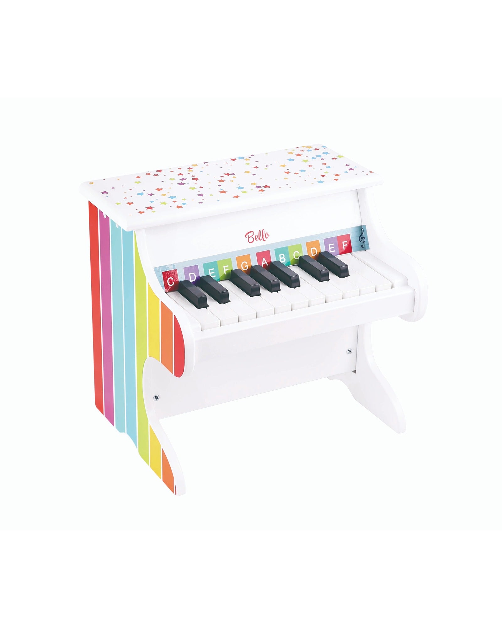 Make memorable melodies and strike a chord as you tap and groove with your own soulful sound. The Bello Carnival piano is a beautiful wooden toy piano in fun, bright colours. Young children can explore musical sounds and cause and effect as they learn early keyboard skills.