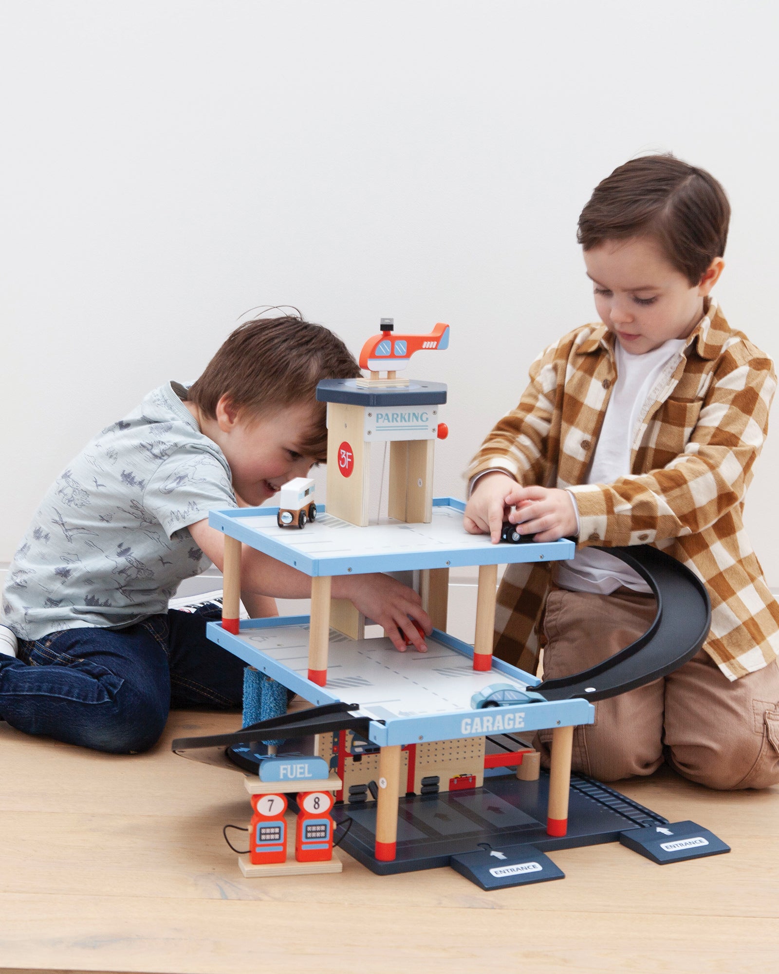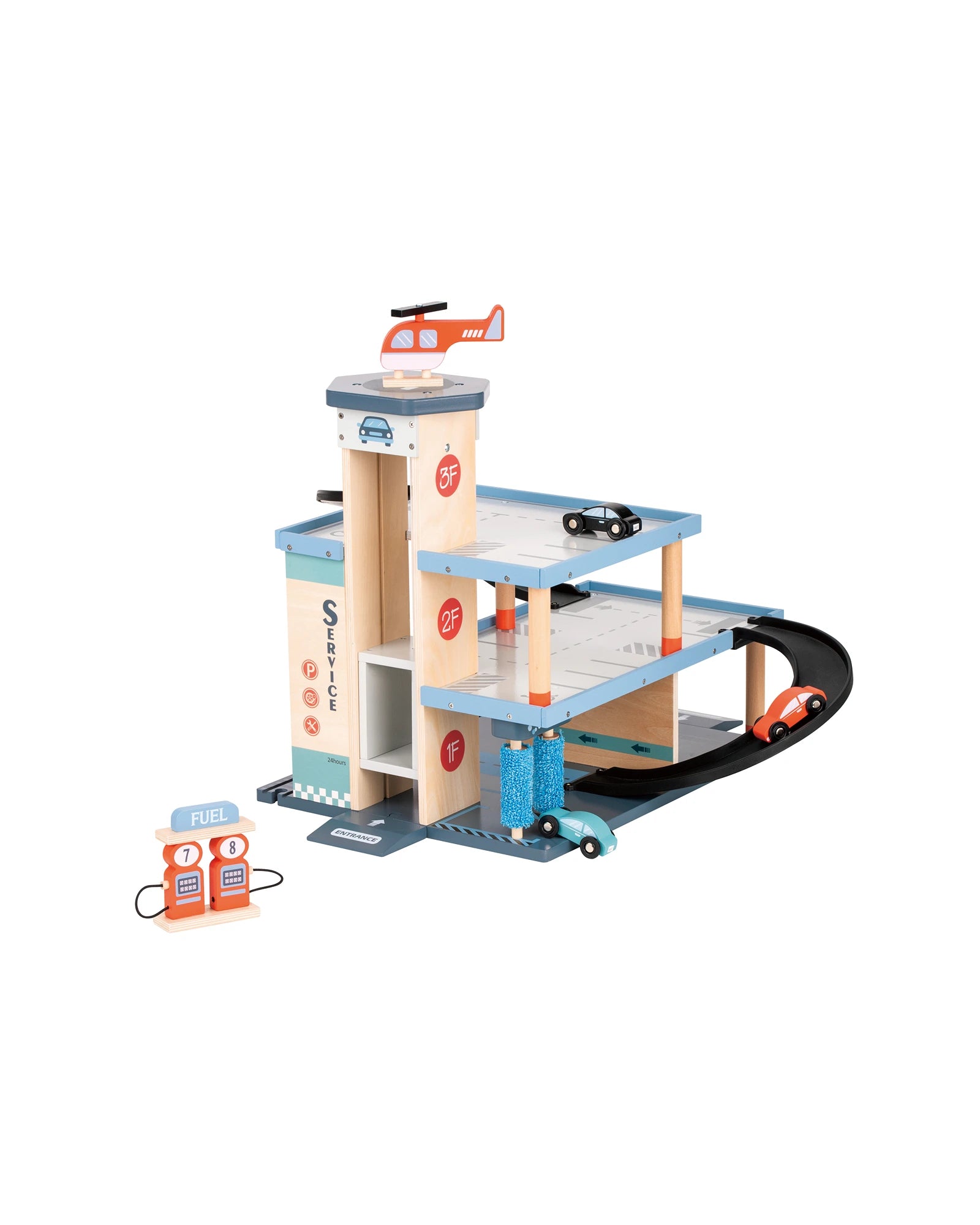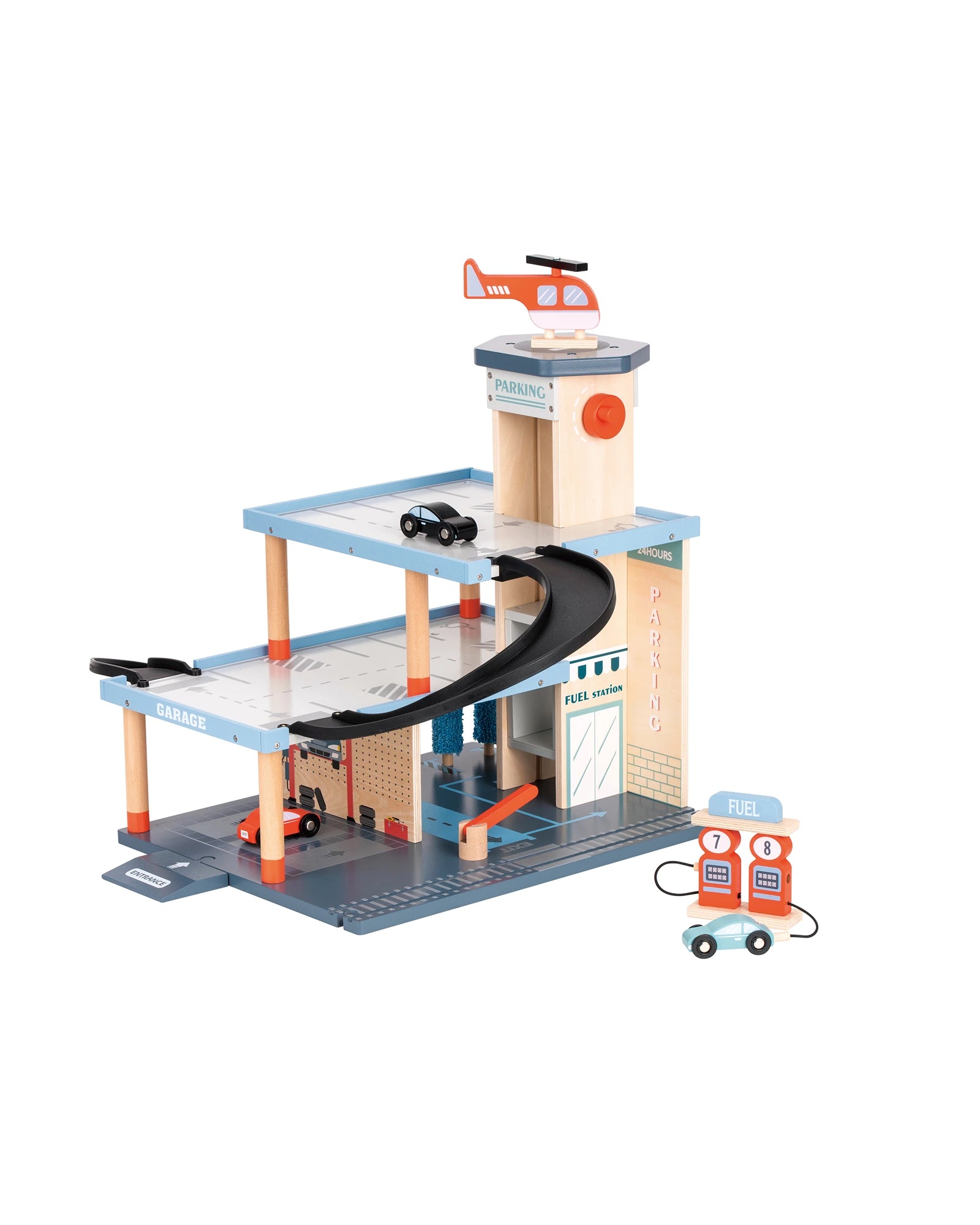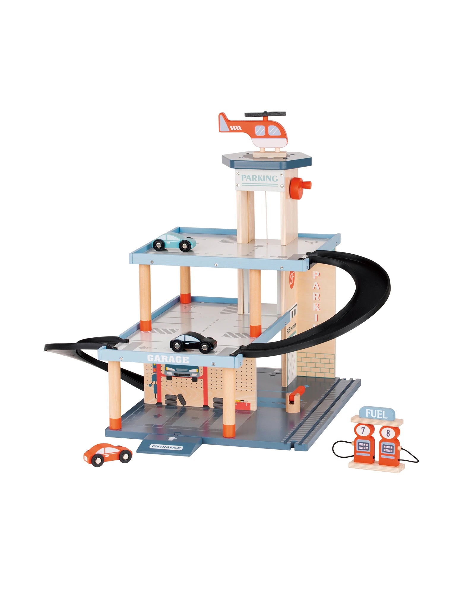 Drive Up, fill up, fix up and take off from your very own multi-storey parking garage. Little car enthusiast will love this City Parking garage with two ramps, a helipad, working elevator, car wash and filling station. Includes 3 cars and a helicopter.