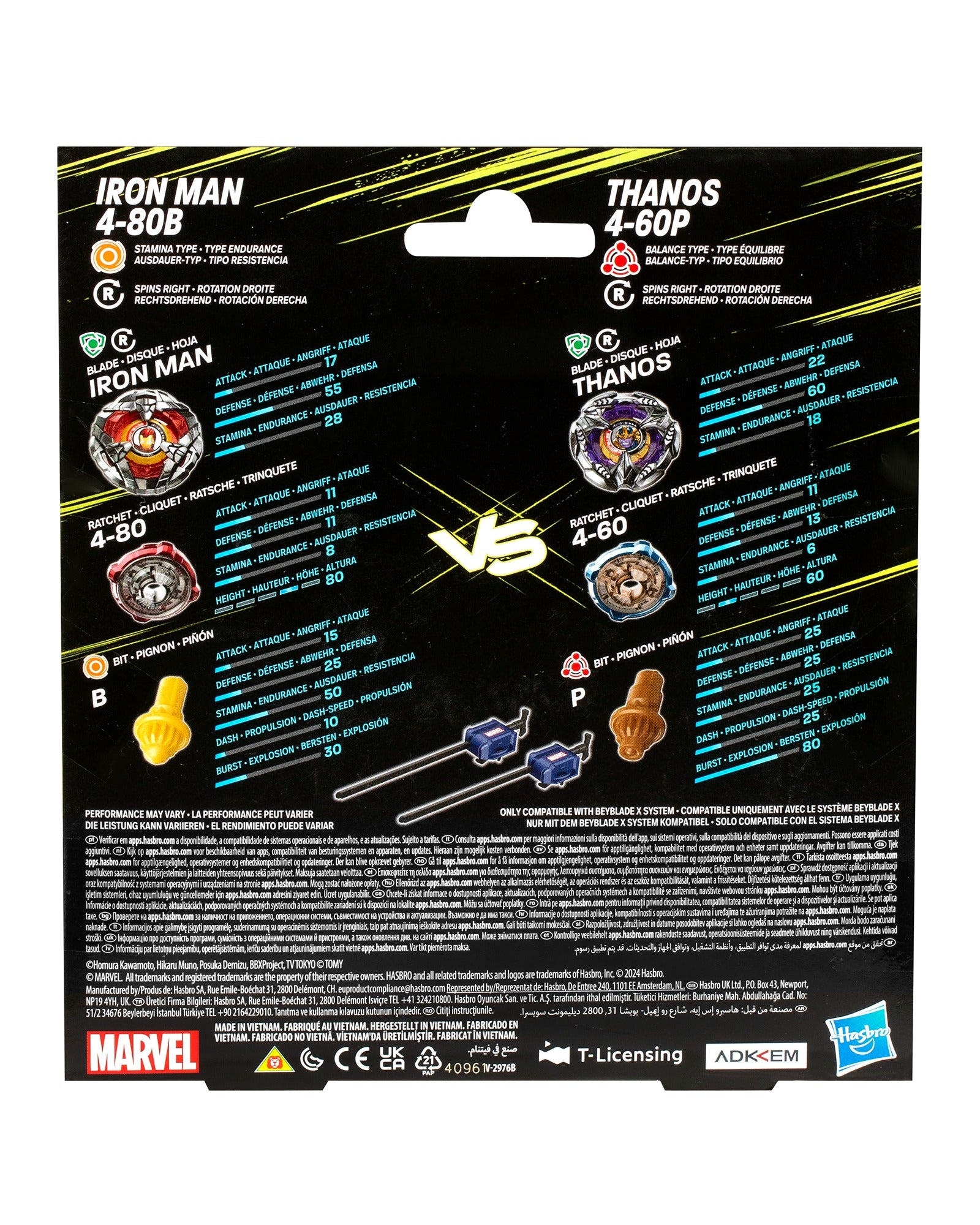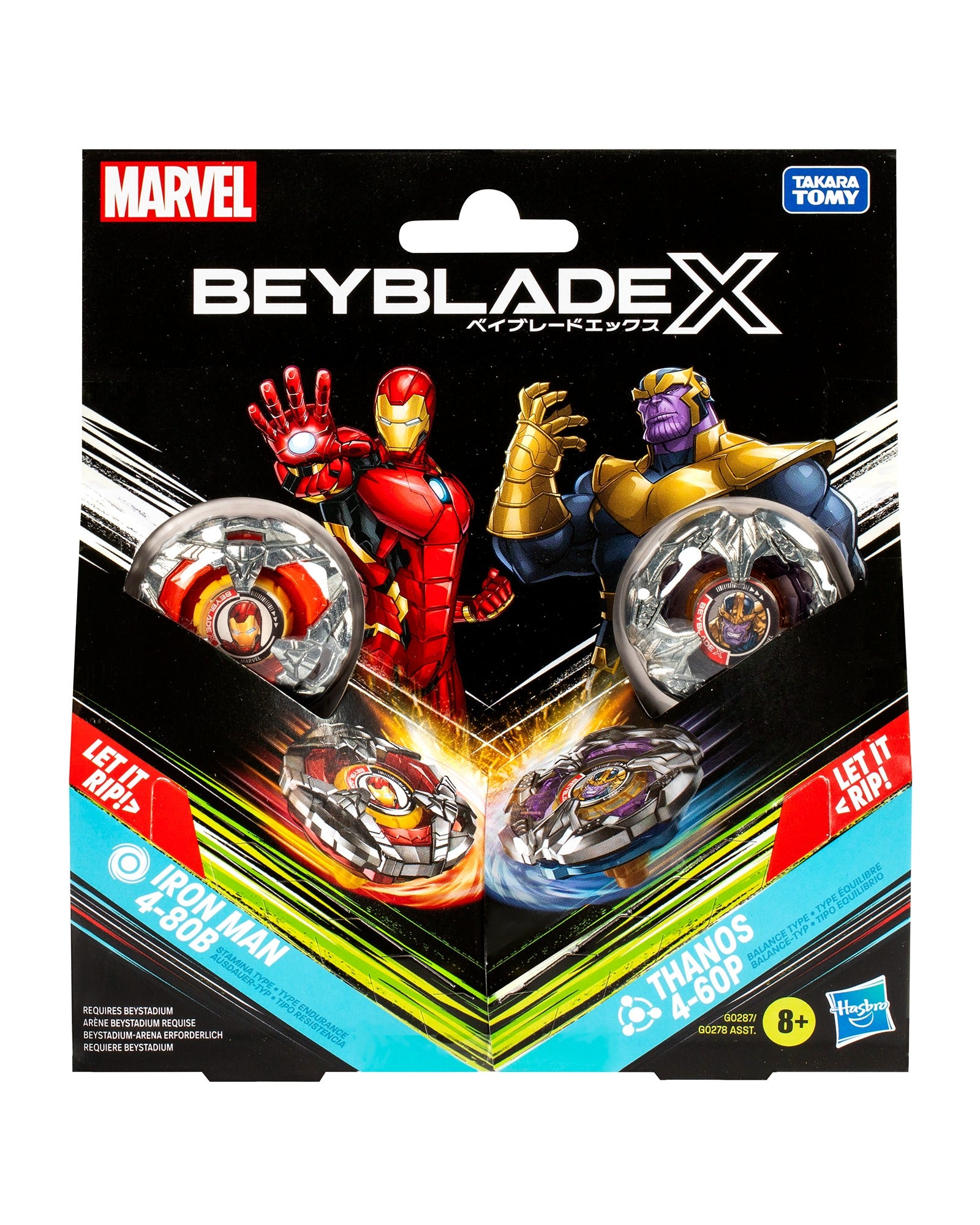 Experience the thrill of the next generation of Beyblade stadiums, launchers and tops: Beyblade X with the Beyblade X Marvel Collab Multipack Set which includes 2 tops and 2 launchers to enhance your collection (Beystadium required, sold separately). Launch right into battle or reconfigure the interchangeable blade, ratchet, and bit of tops in this Marvel Collab Multipack with those of other Beyblade X tops (sold separately) to create your own unsurpassable Bey. Beyblade X features the X-Celerator Gear System innovation to level-up your game. When the gear of a Beyblade X top engages the rail of the Beystadium arena, it can super-accelerate into an Xtreme Dash rocketing it around the stadium for crushing collisions and epic bursts. Bladers launch their tops into fierce clashes against their opponent’s scoring points with each confrontation – first to score 4 points wins. Hasbro Beyblade toys with authentic Takara Tomy die-cast metal tops make great kids gifts for boys and girls ages 8 and up. HASBRO and all related trademarks and logos are trademarks of Hasbro, Inc.