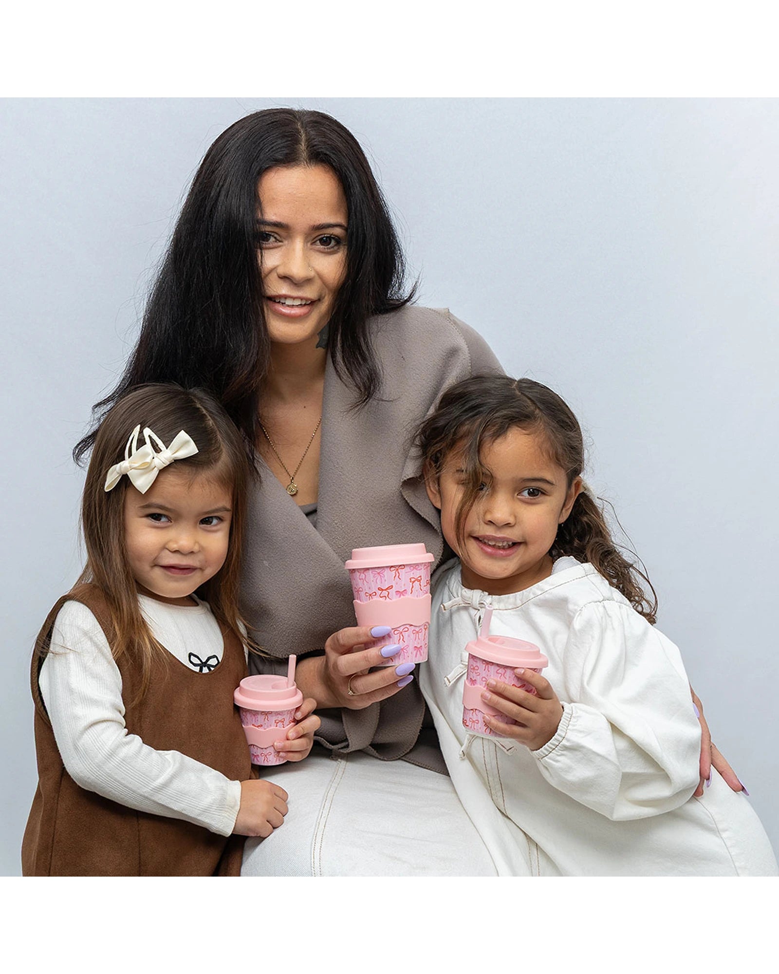 This cup is sprinkled with adorable bows on a sweet pink background. Bamboo based cup with a silicone lid and complete in a cute gift box. Straws sold separately.