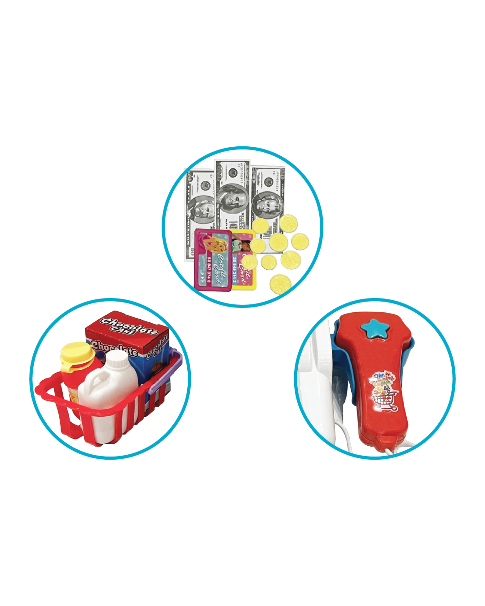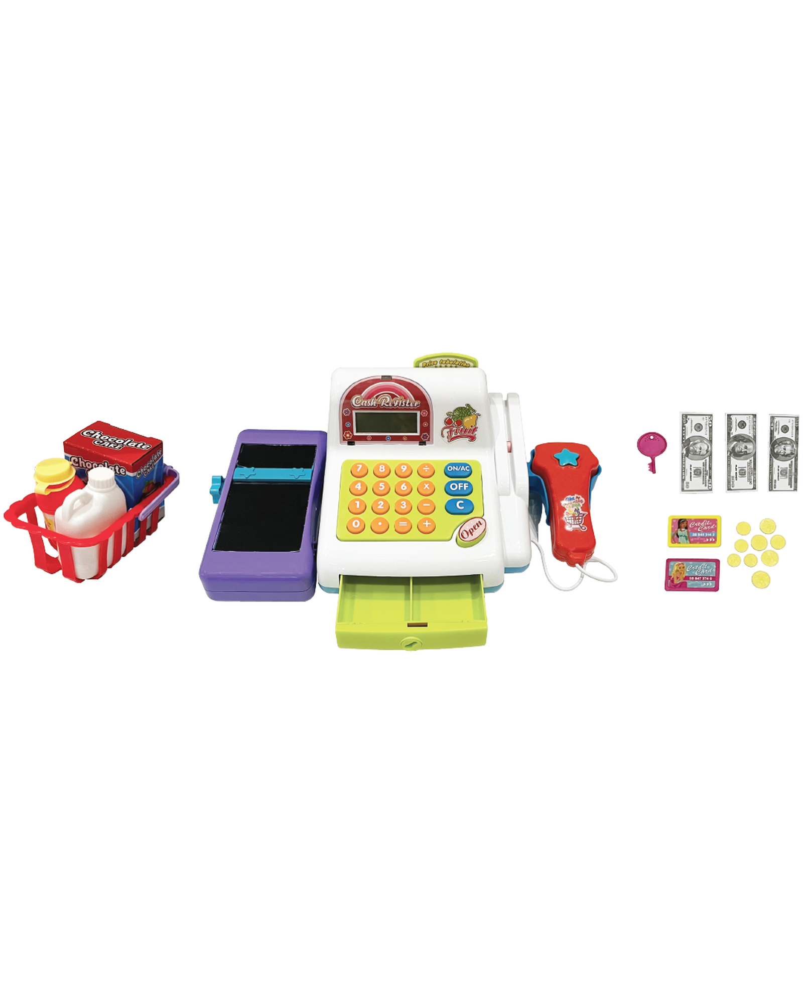This electronic cash register set has everything a child needs to open their own shop! Includes: Product scanner Credit card and swipe slot Draw that opens and closes Pretend microphone to price check! Play money Grocery items and basket Conveyer belt and next customer divider Realistic sounds