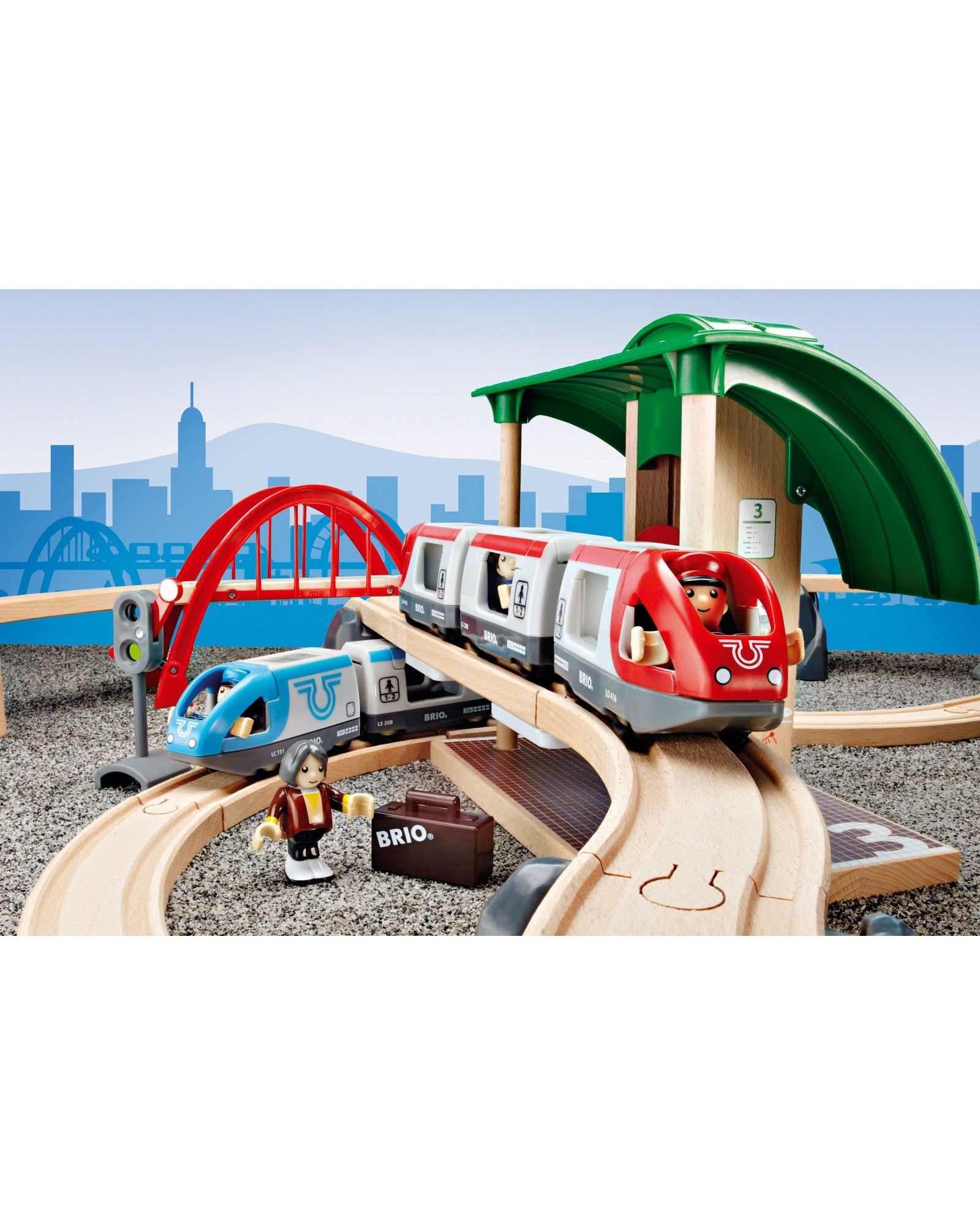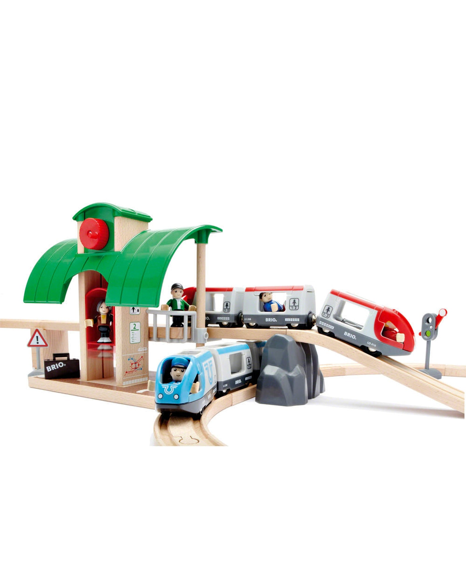 Connect from one train to another with this exciting railway set full of play! The blue line has a battery powered train that takes passengers to the modern station where it meets up with the red line train. The lift goes and up and down using the crank, taking passengers to their platforms. The trains have plenty of tracks and switches to ride on for a fun playscape. Let the imagination decide the destination.