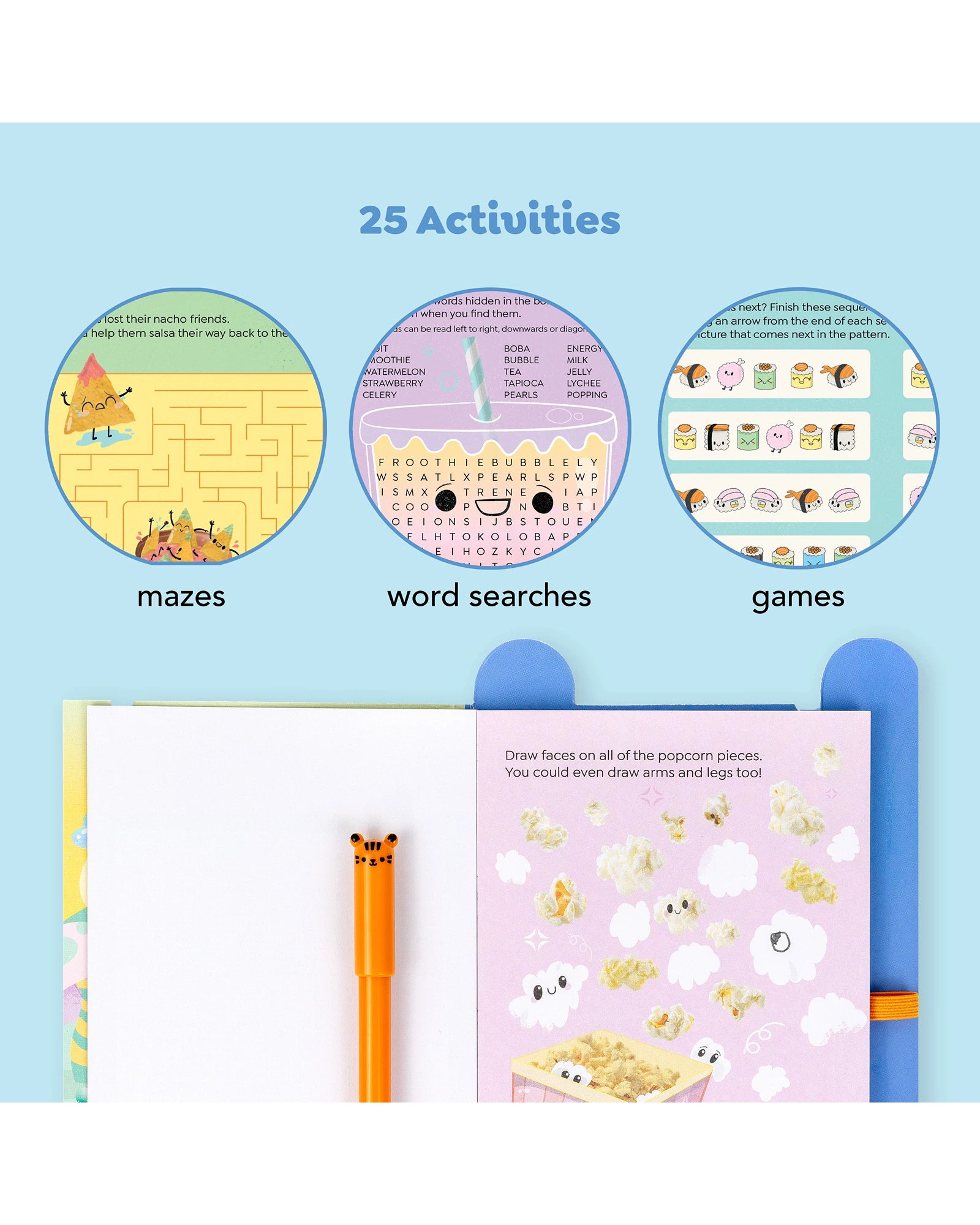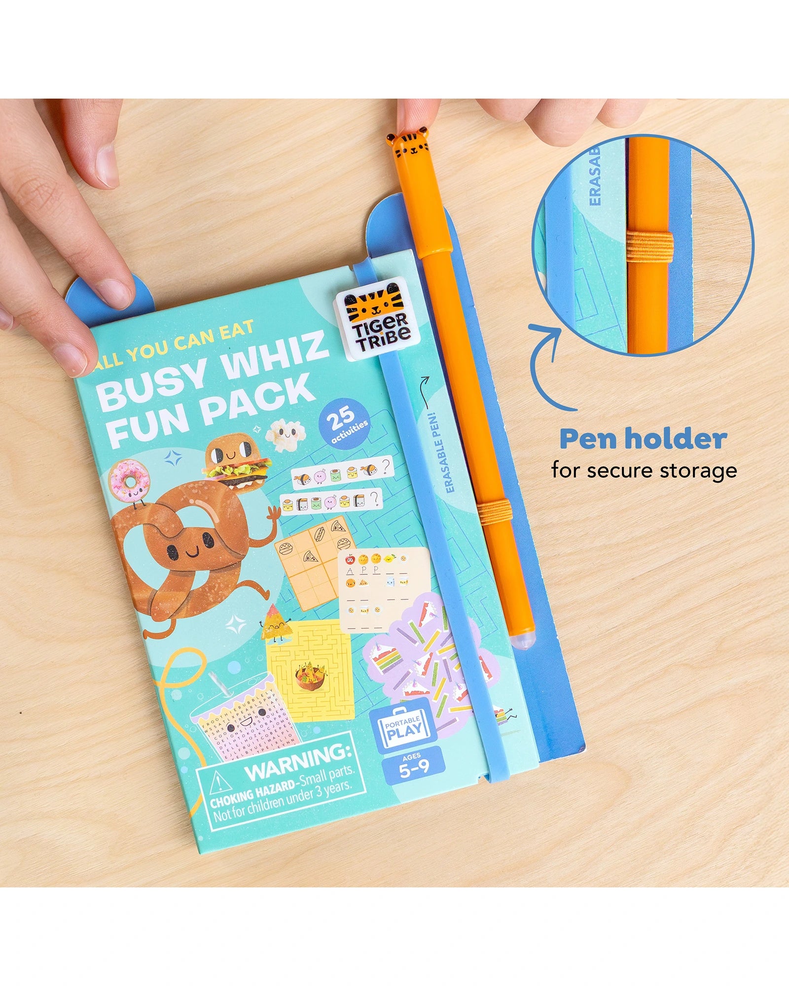 Tiger Tribe’s Busy Whiz ‘All you can eat’ - keep kids busy when it counts — in cafés, waiting rooms, long journeys or rainy days. This compact, lightweight food-themed activity set is packed with mazes, games, word searches and code-breaking challenges, and comes with a nifty erasable pen for repeated play. Includes: 25 activity pages, 5 solution pages, 1 erasable pen, 1 sticker sheet, storytelling scene inside cover