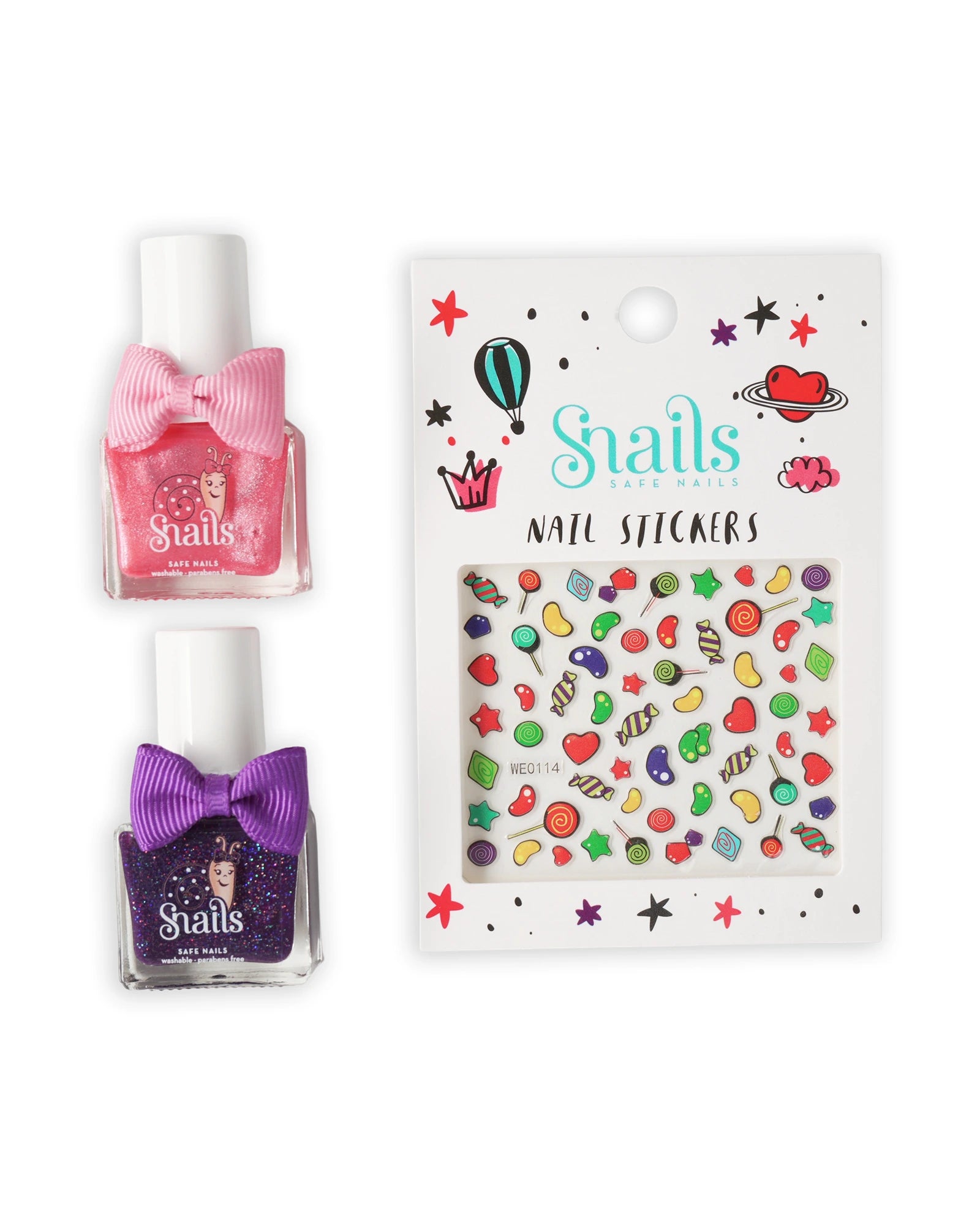 Indulge in a sweet style with the Snails & Friends Candy Carnival! This delectable collection features two luscious, washable nail polishes in delicious shades. Complete the look with an assortment of adorable candy-themed nail stickers, adding a sprinkle of sweetness to every manicure. It’s the perfect treat for creative hands!