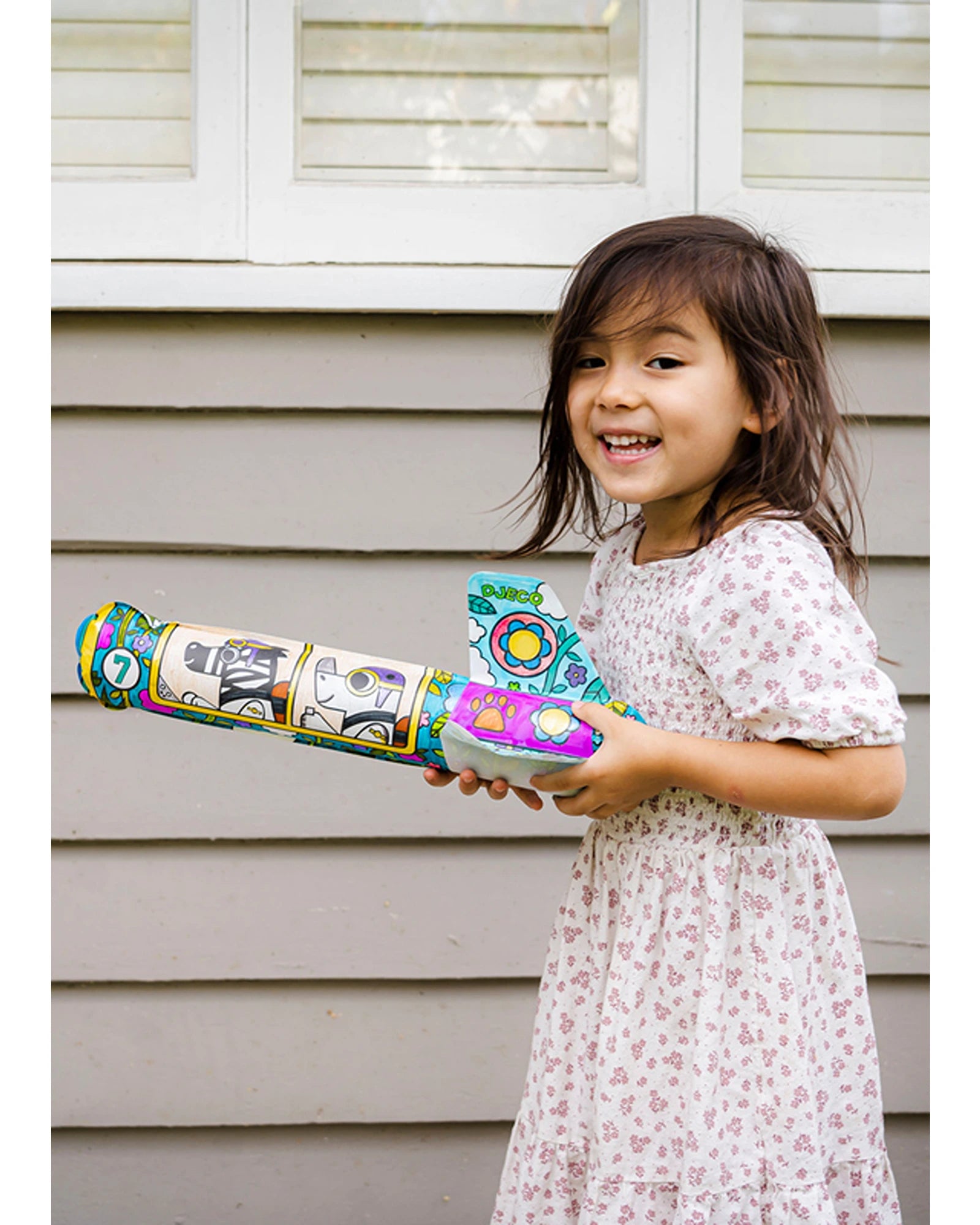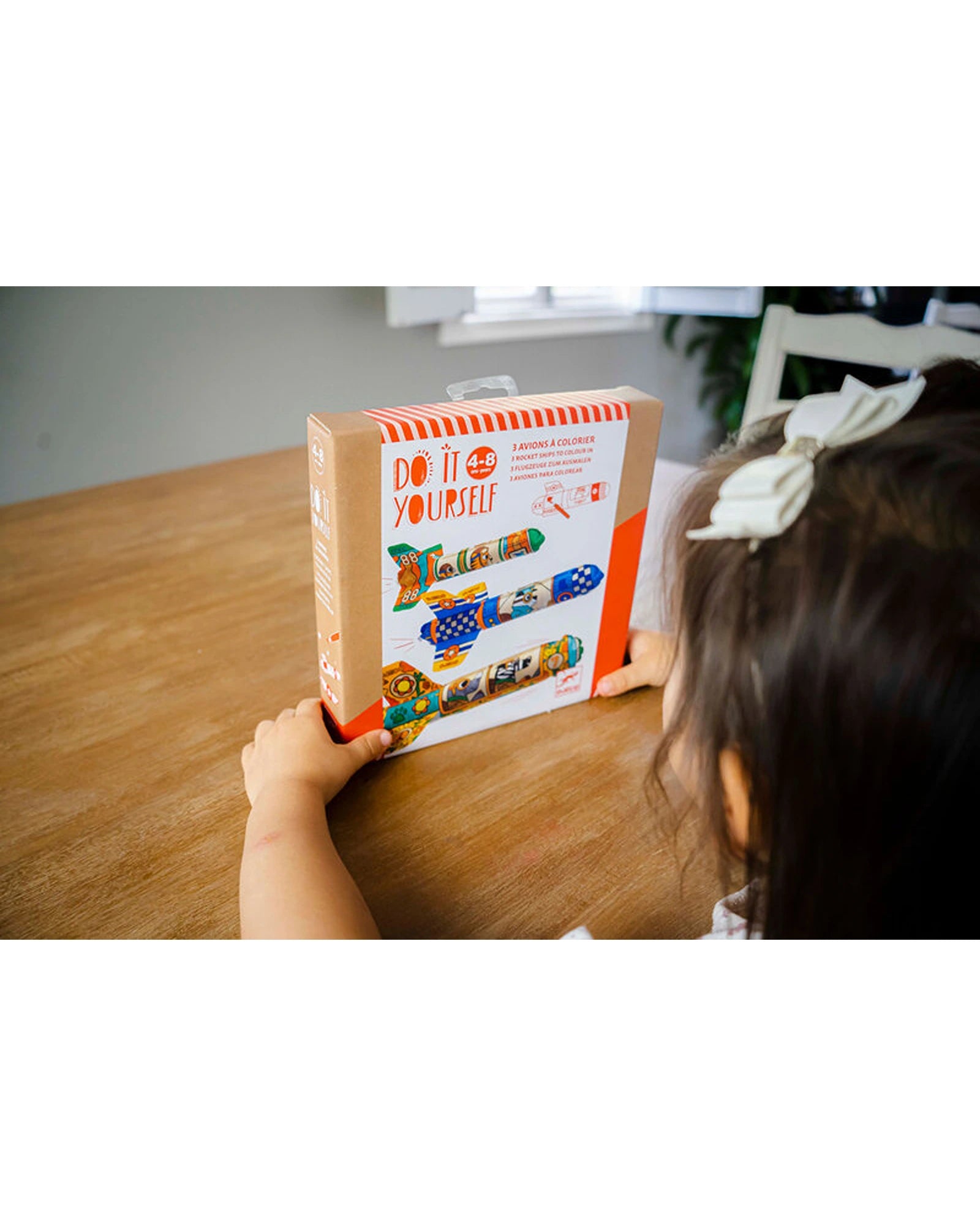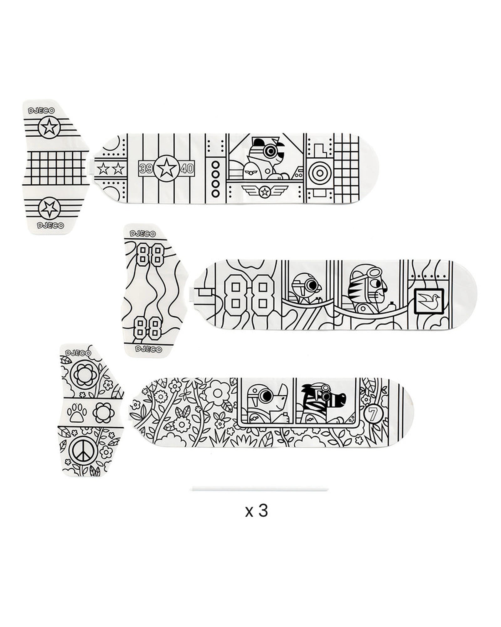 Get ready to take to the skies. A creative kit with 3 inflatable planes to colour. The planes are easily coloured with felt pens (not included), inflated with the straws provided, then fly through the air!