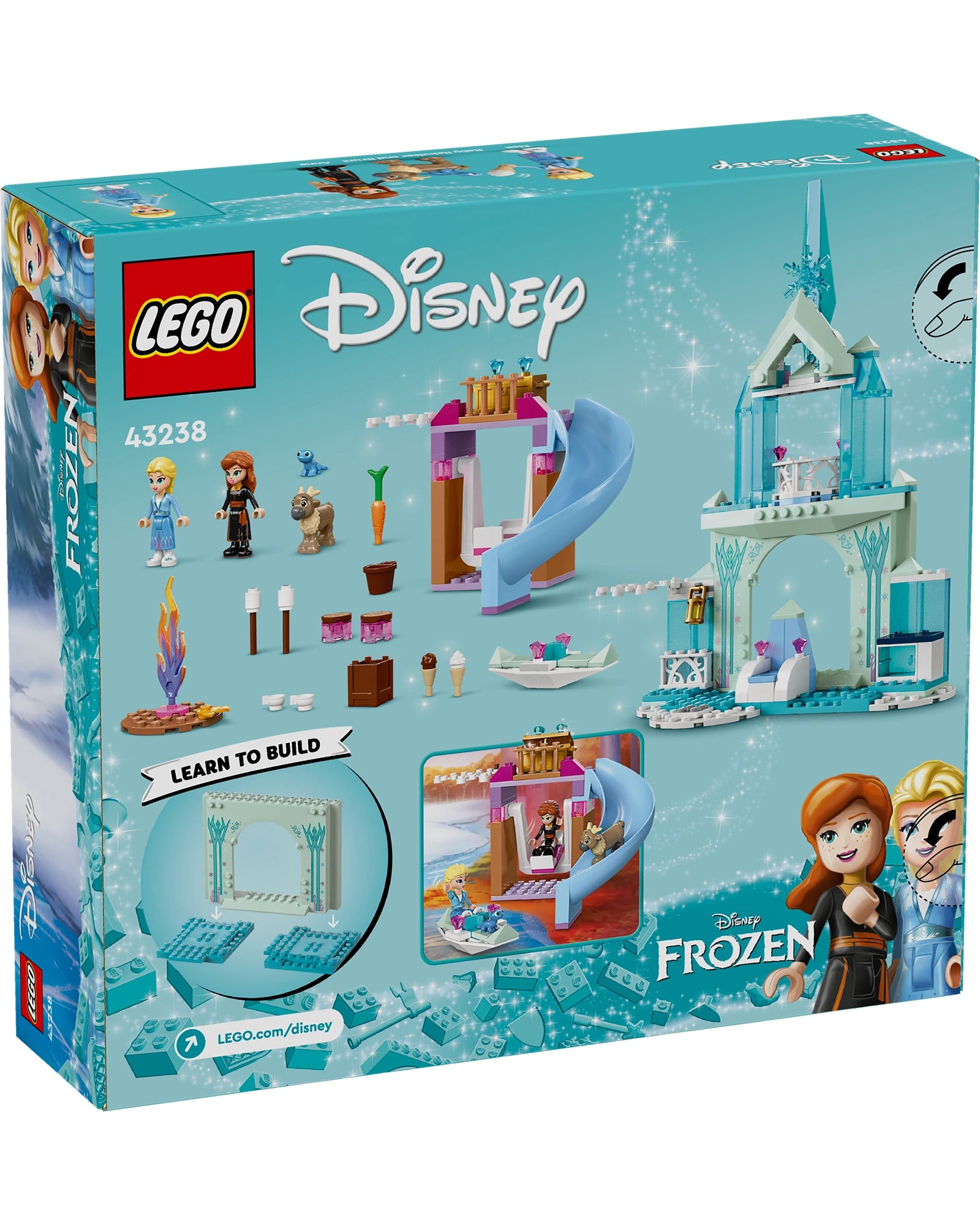 Unlimited palace play awaits kids aged 4 and up as they learn to build with this LEGO® ǀ Disney Frozen Elsa’s Frozen Castle (43238) building toy. Inside is a castle with a kitchen, a fireplace, swing and slide area, a campfire, small ice canoe and lots of story starters. It includes Elsa and Anna LEGO ǀ Disney mini-doll figures plus Bruni and baby reindeer LEGO ǀ Disney animal figures.