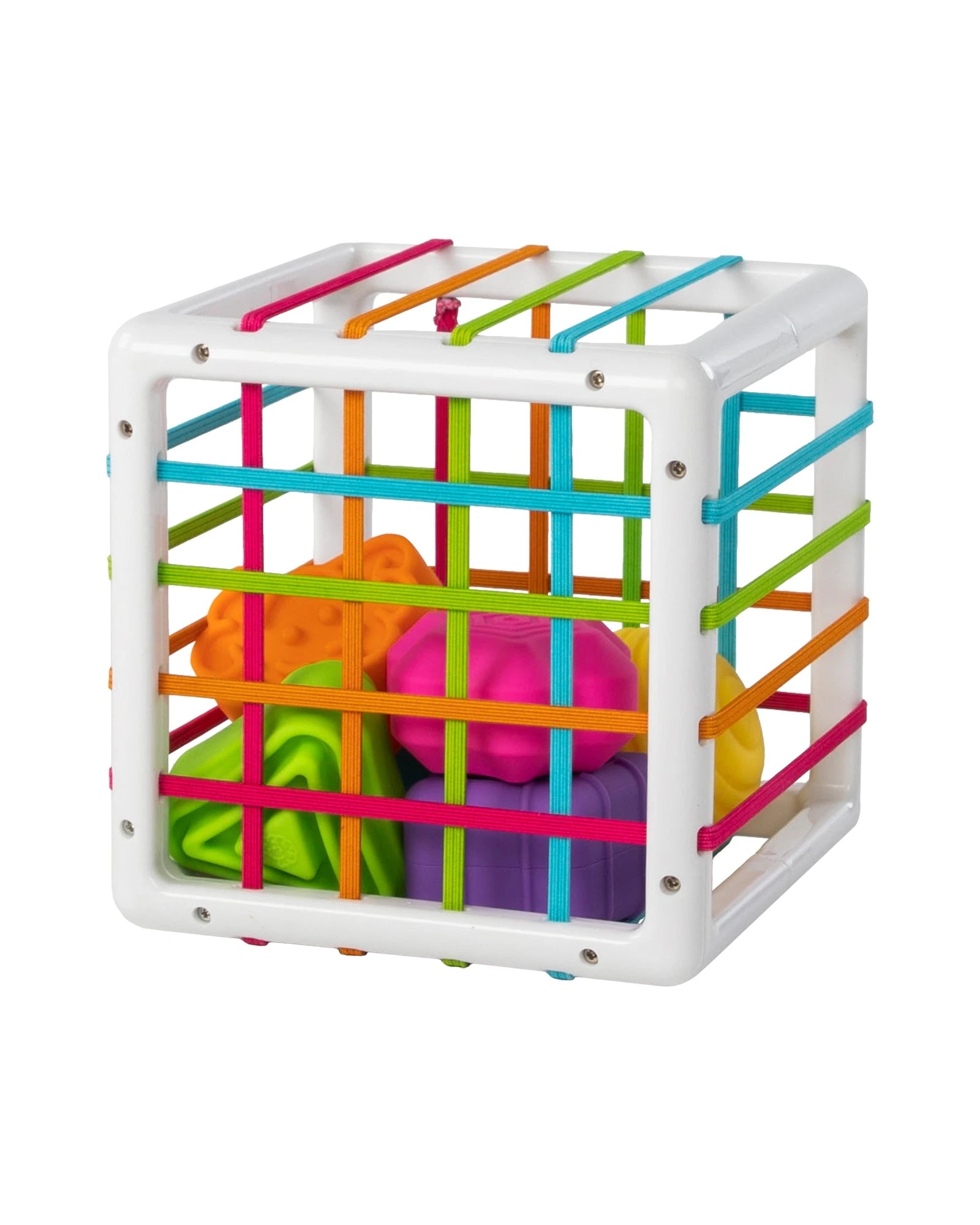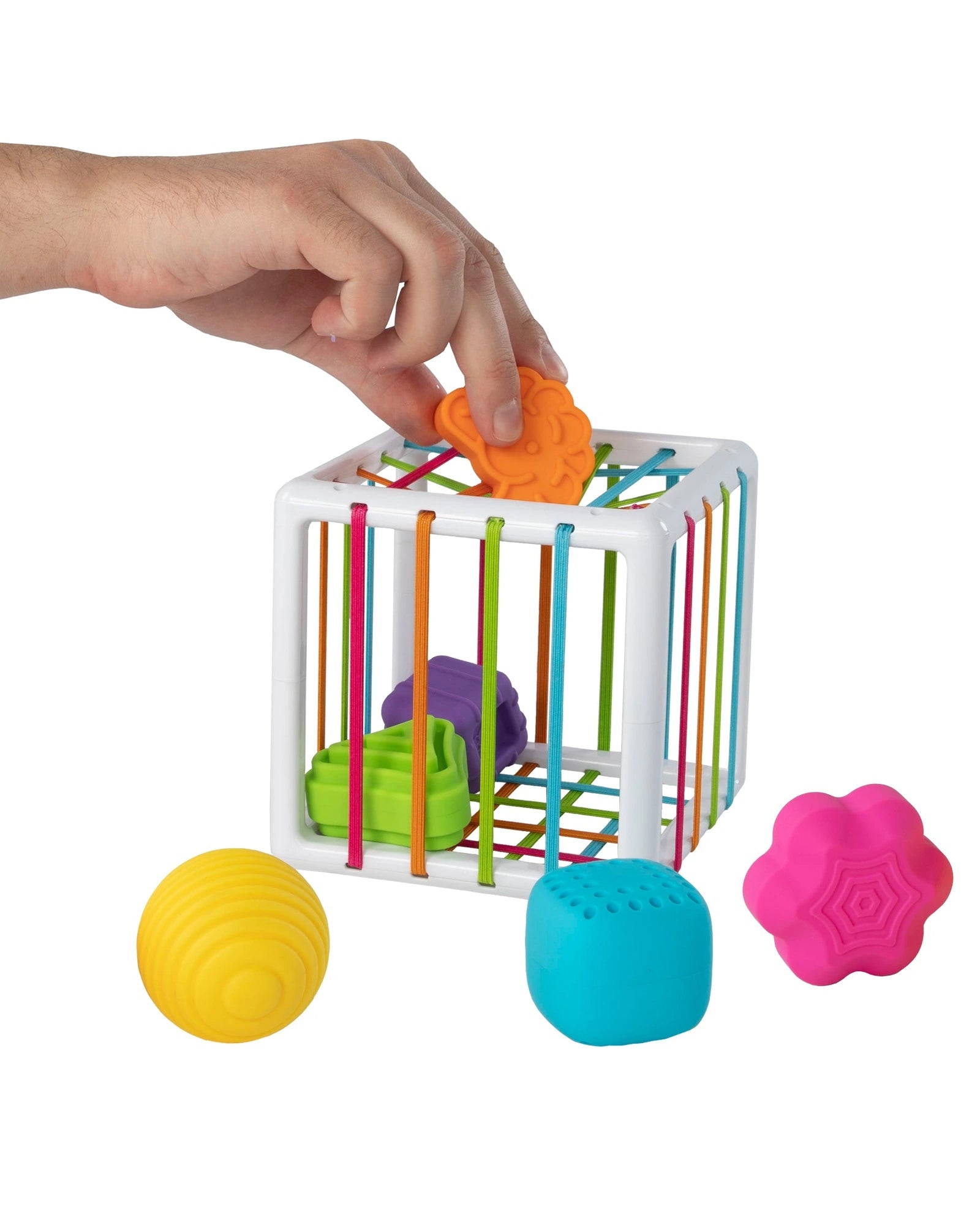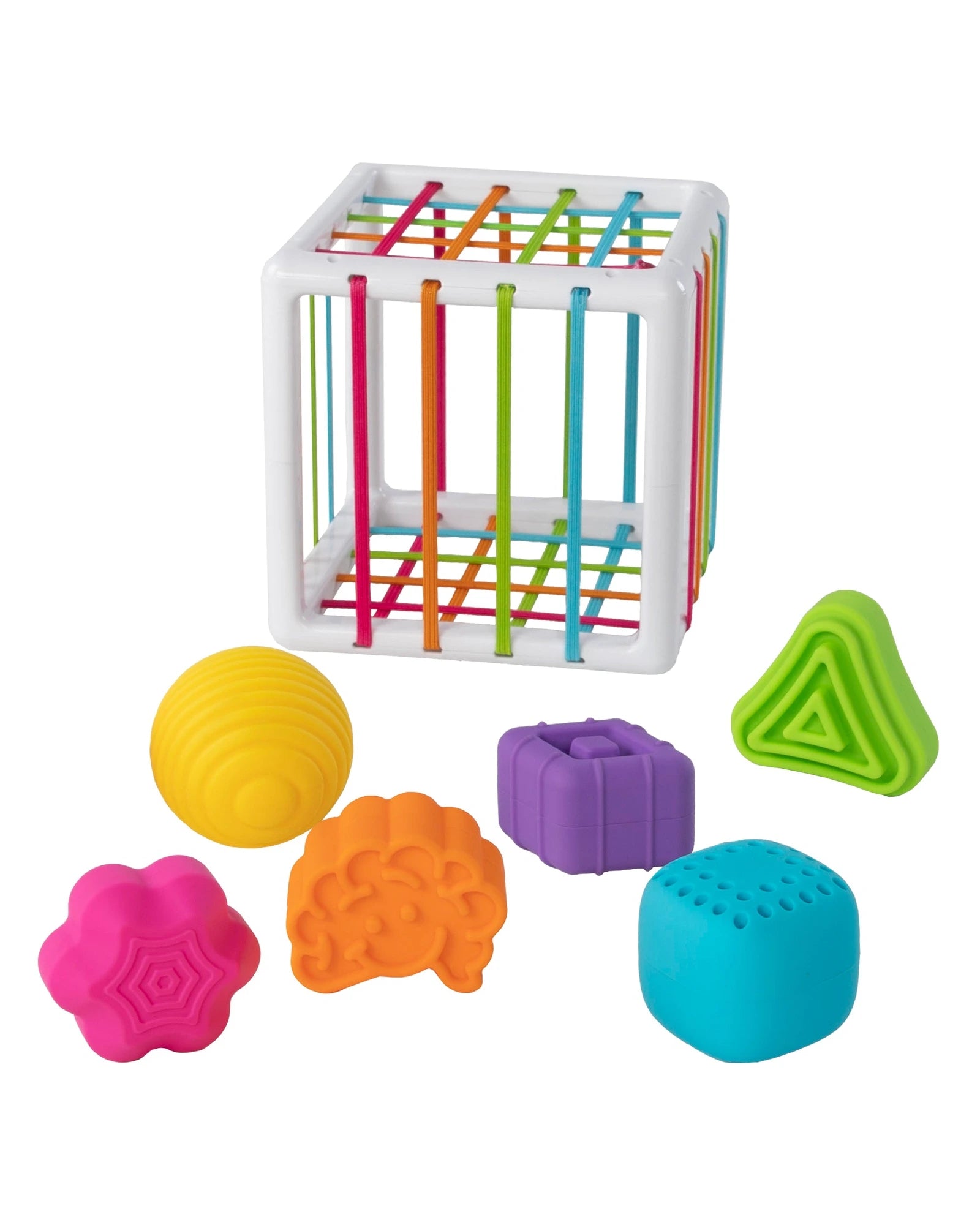- 6 chunky, uniquely textured shapes fit through the elastic bands of the cube