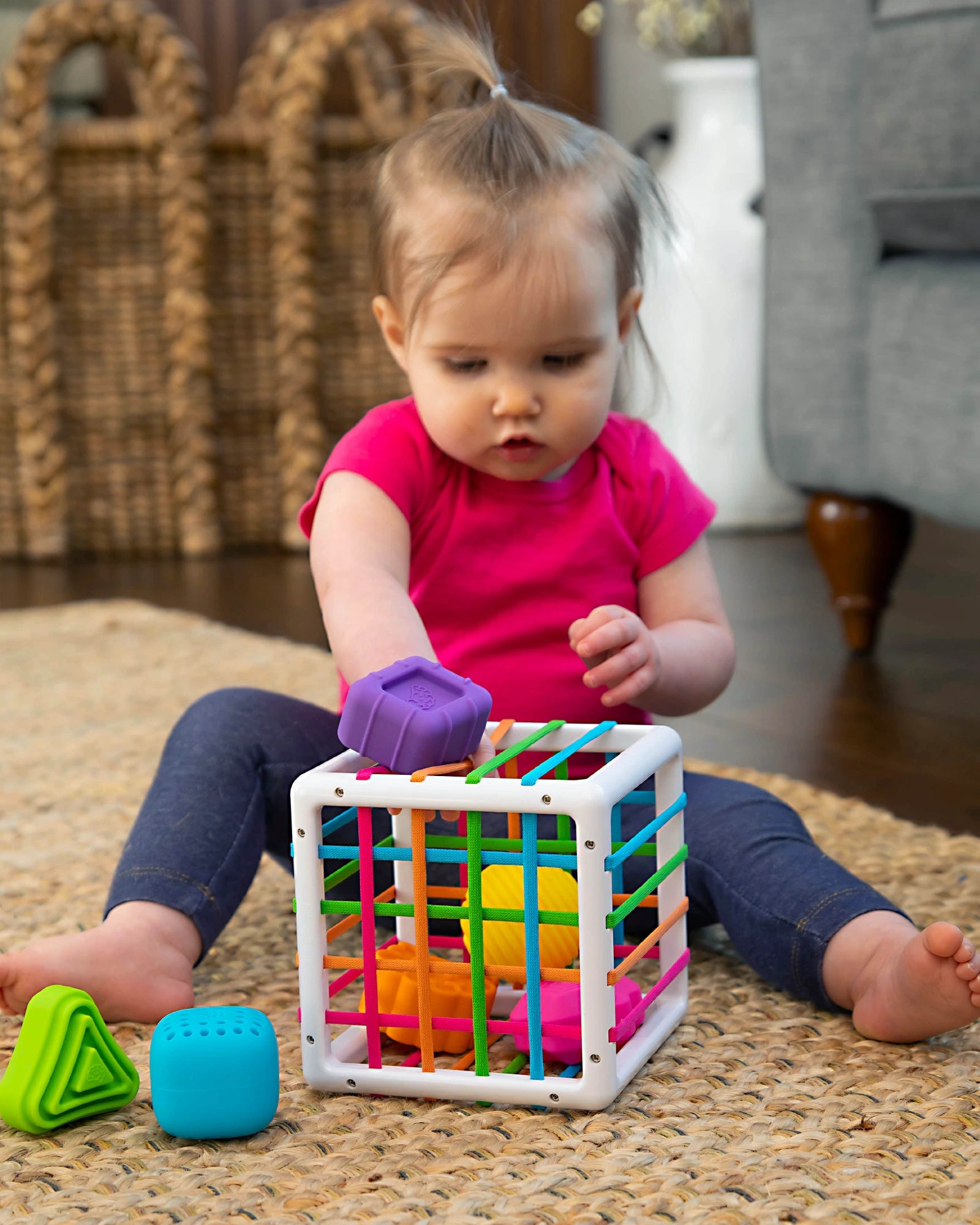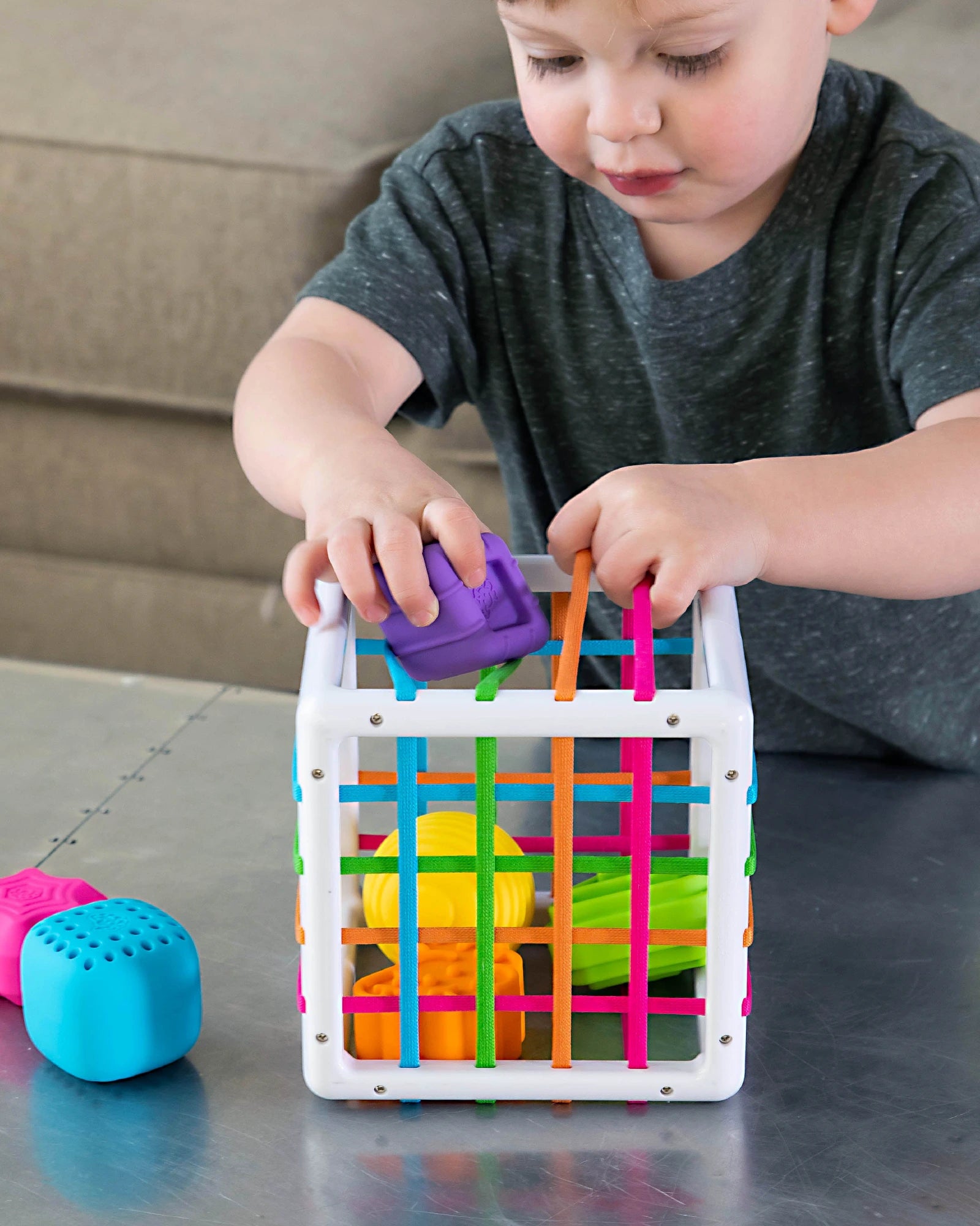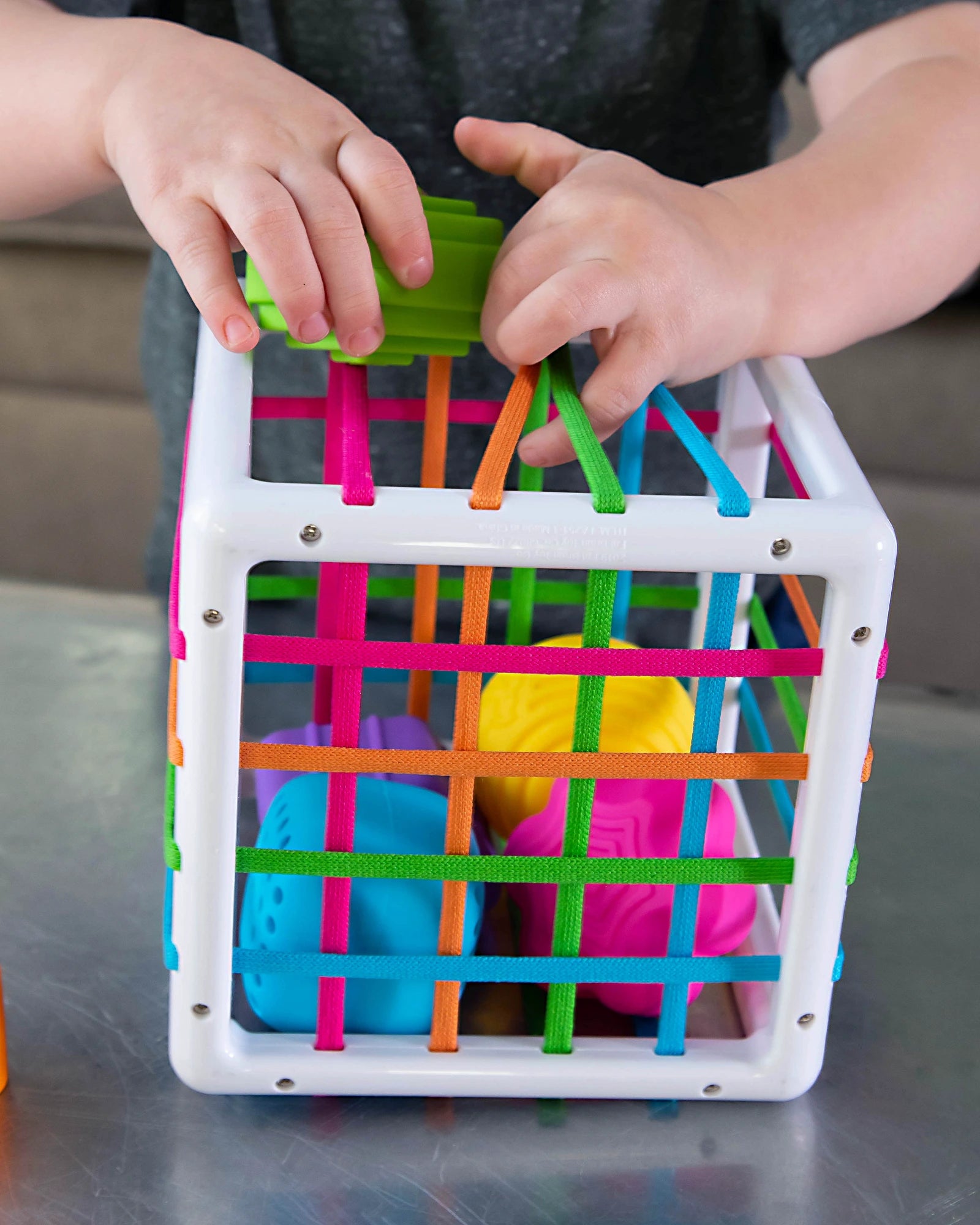 - 6 chunky, uniquely textured shapes fit through the elastic bands of the cube