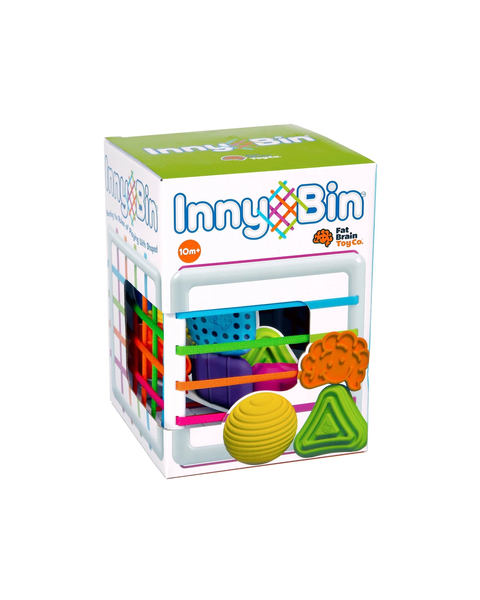 An incredibly unique shape-exploration experience! The six chunky shape blocks are each designed with fascinating textures that are sure to thrill the fingers. There's a cube, a diamond, a sphere, a triangle, a flower, and the happy Fat Brain logo... But the best part? As kids push the shapes through the elastic bands of the cube, curiosity is sparked and young minds can't help but explore, experiment, and discover. It's beautifully simple and amazingly mind-expanding! Play freely with InnyBin.