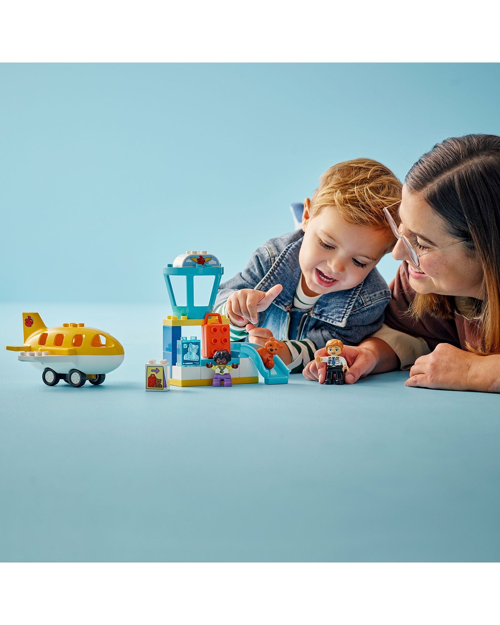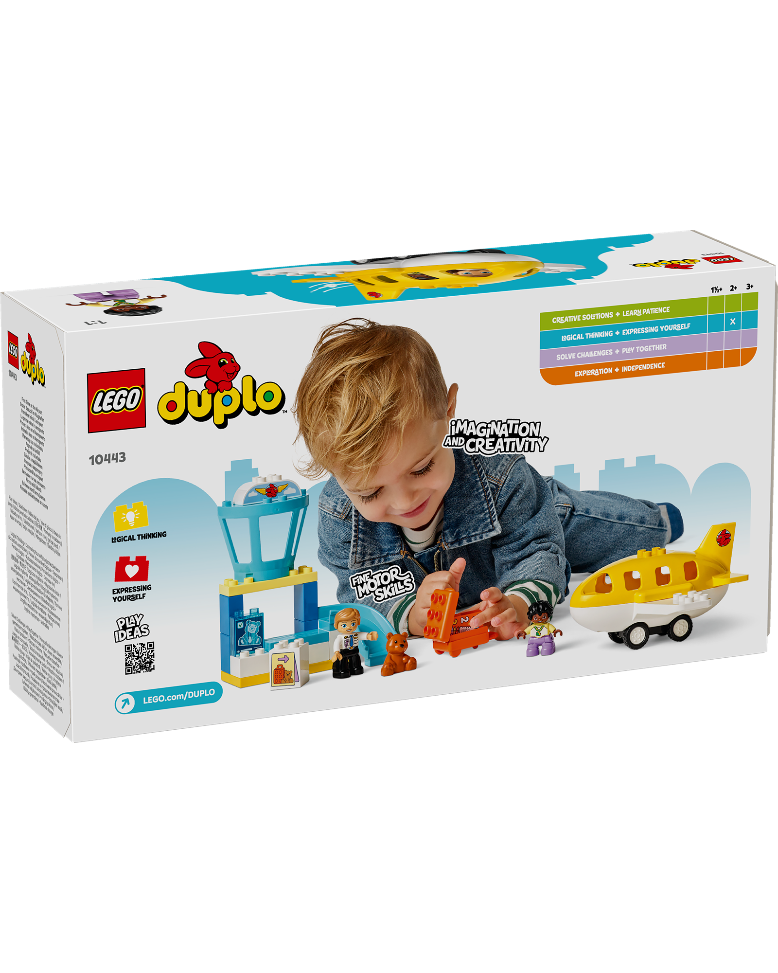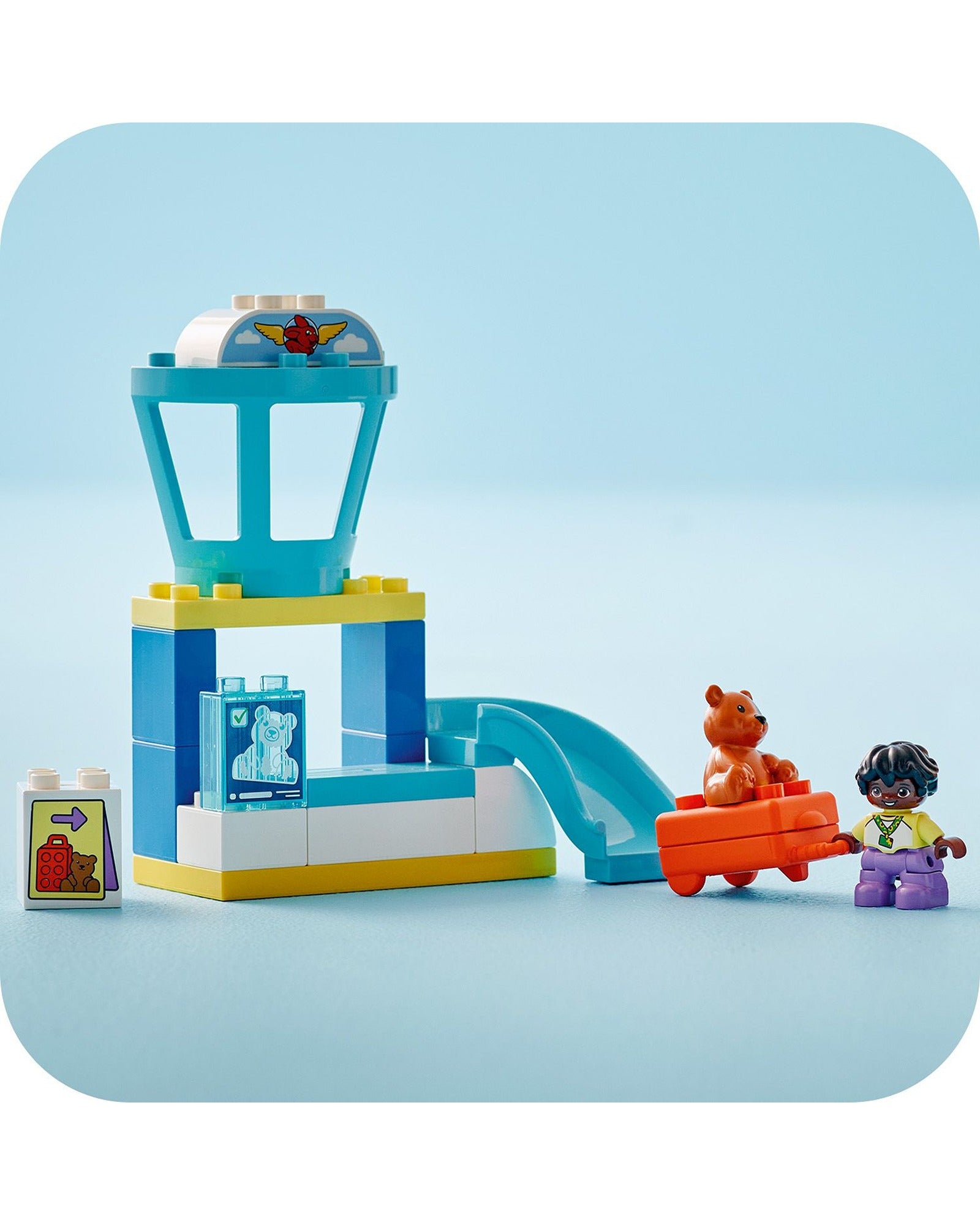 This LEGO® DUPLO® airport playset has lots of features to spark imaginary play. It includes a security desk where toddlers can pretend-play scanning the suitcase and pushing it down the chute, an air traffic control tower and a movable airplane toy that fits the teddy, child and pilot figures.