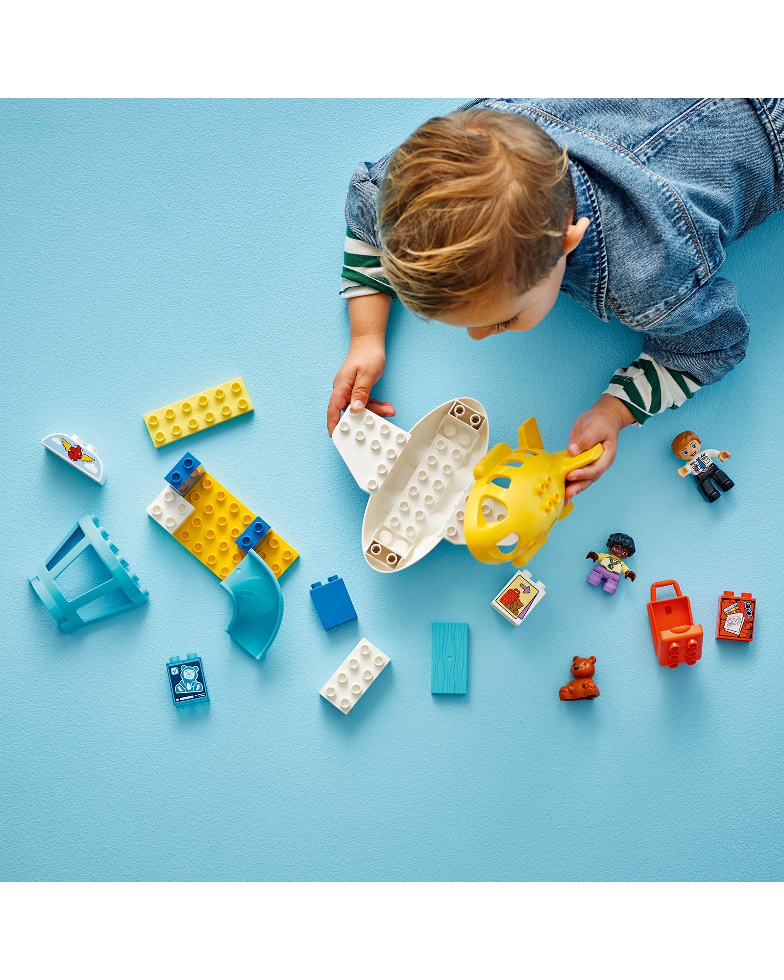 This preschool learning toy is packed with learning activities. The included emotions wheel lets families discuss feelings about going to a busy airport or plane travel. Toddlers hone their fine motor skills as they pack the hinged toy suitcase and put the figures in the airplane. This logical-thinking toy will get them using their creativity as they work through each step of the journey to become the hero of their own LEGO DUPLO adventure. Contains 23 pieces.