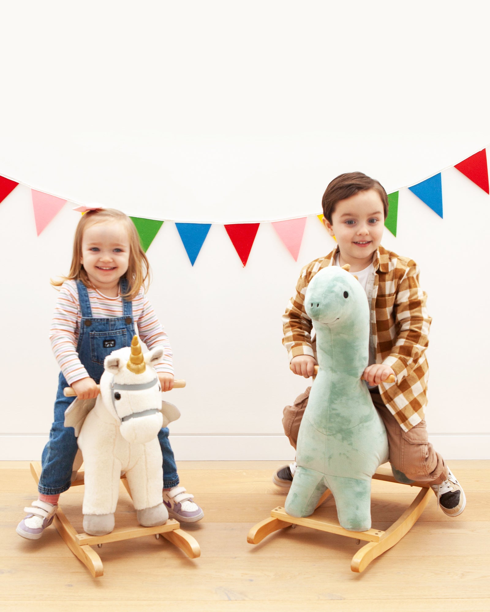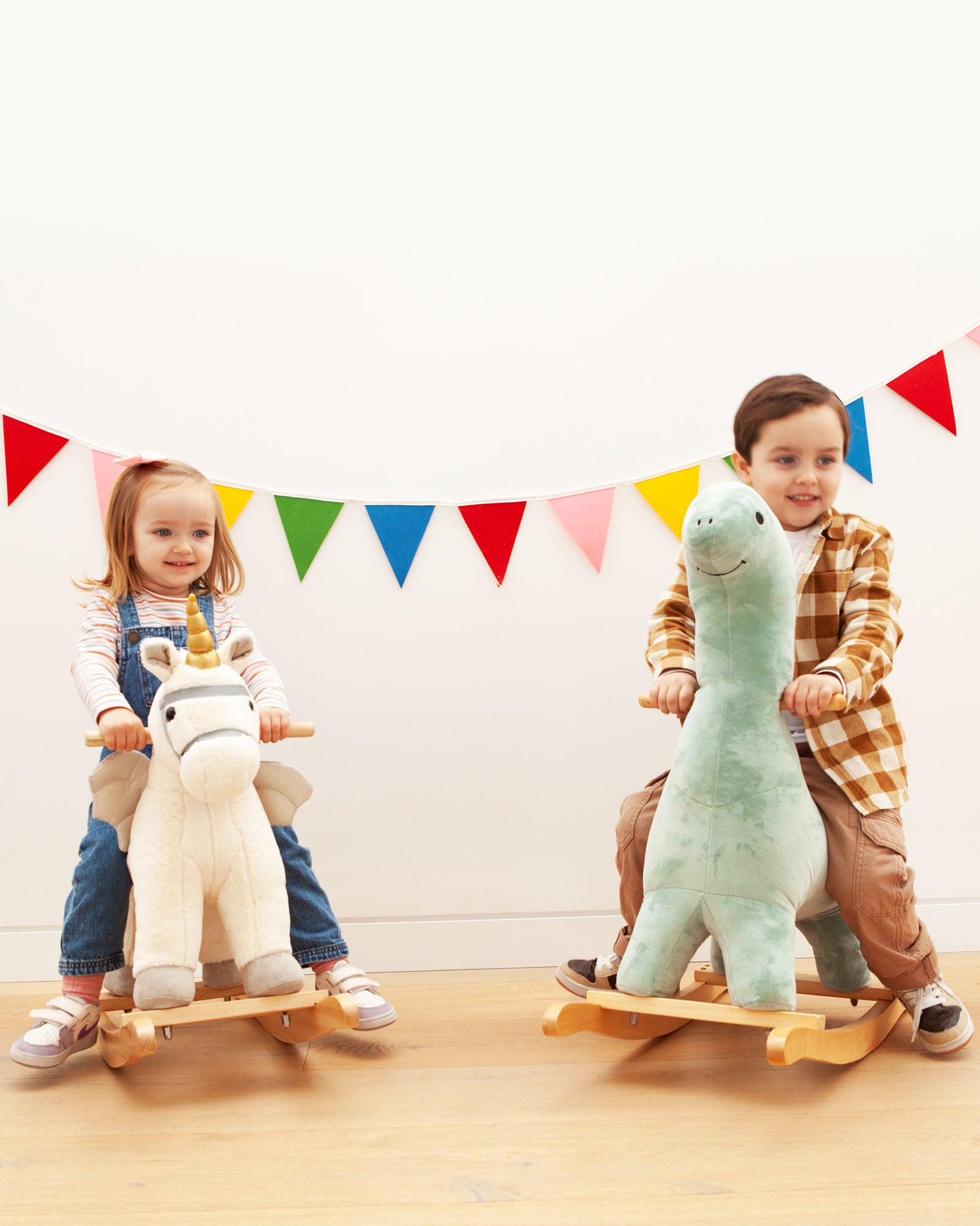 Your little one will love this super soft and huggable plush Stegosaurus Rocker. Solid wood rockers ensure a smooth, gentle ride and wood handles make steady grips.