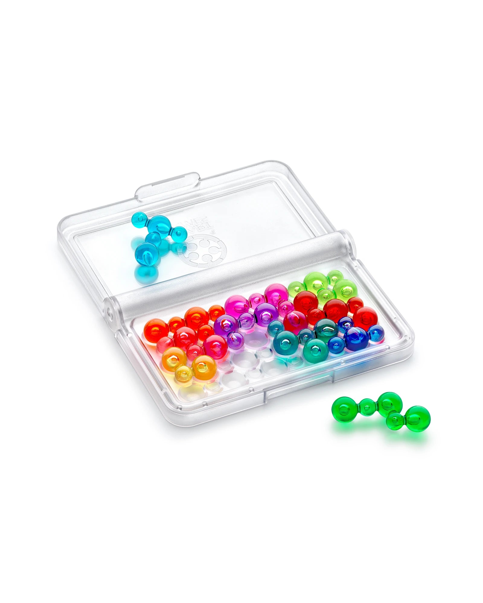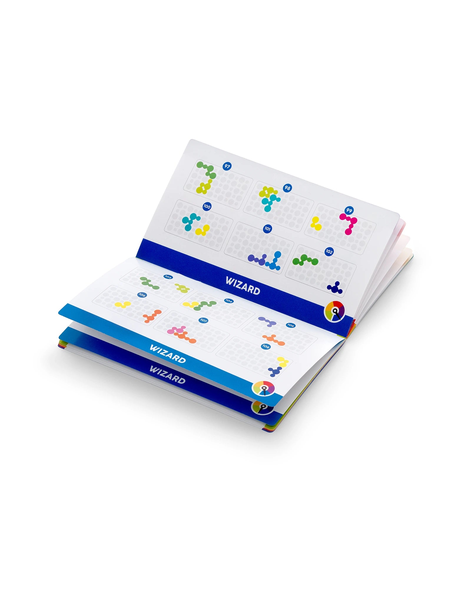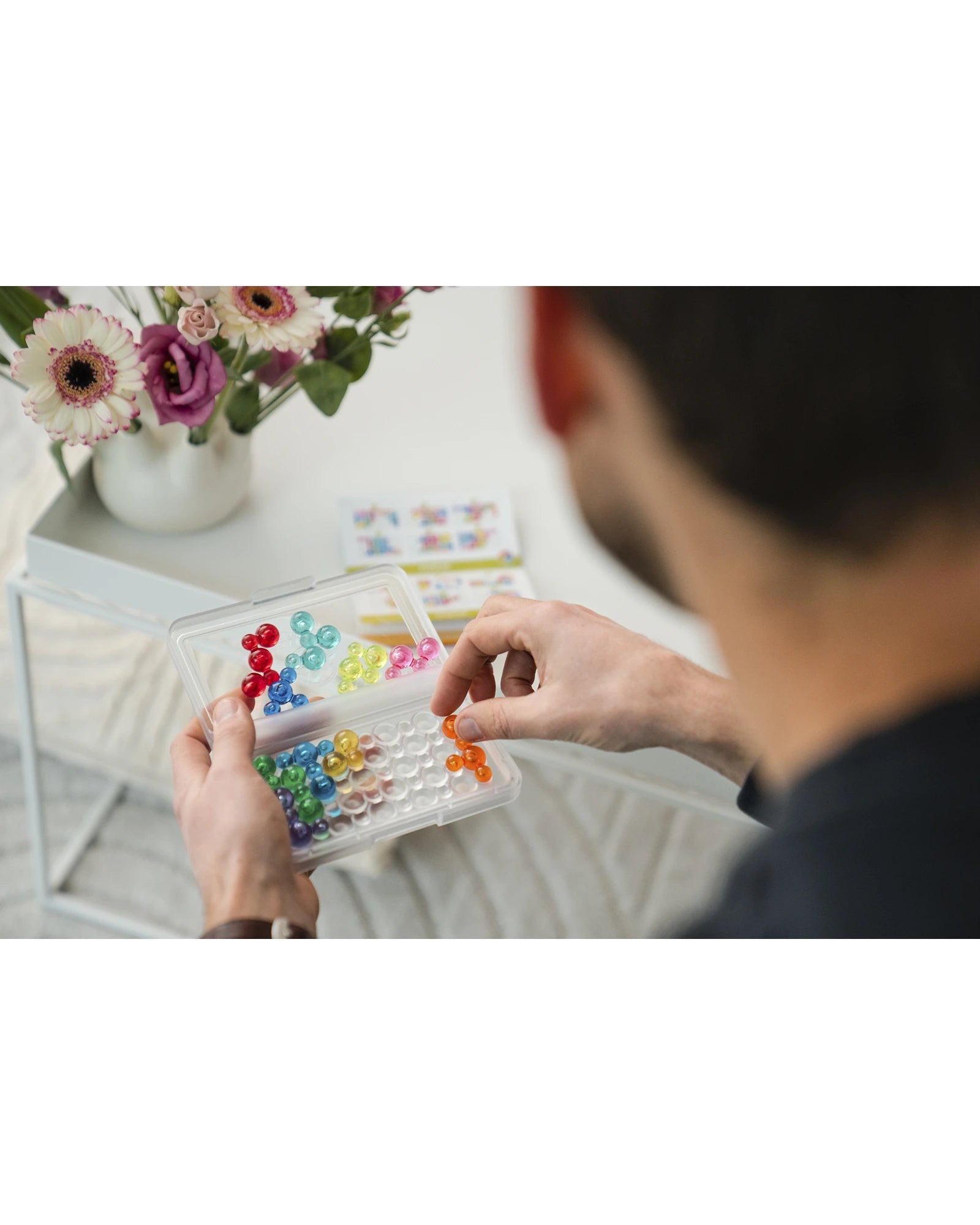 Test your brainpower with IQ Bubbles! This addictive puzzle game challenges players to fit all the colourful, transparent bubble pieces onto the travel-friendly gameboard/case. With 120 challenges to solve – from Starter to Wizard – IQ Bubbles is great for kids and adults! Compact game board with lid, 11 translucent puzzle pieces, booklet with 120 challenges and solutions, leaflet with game rules