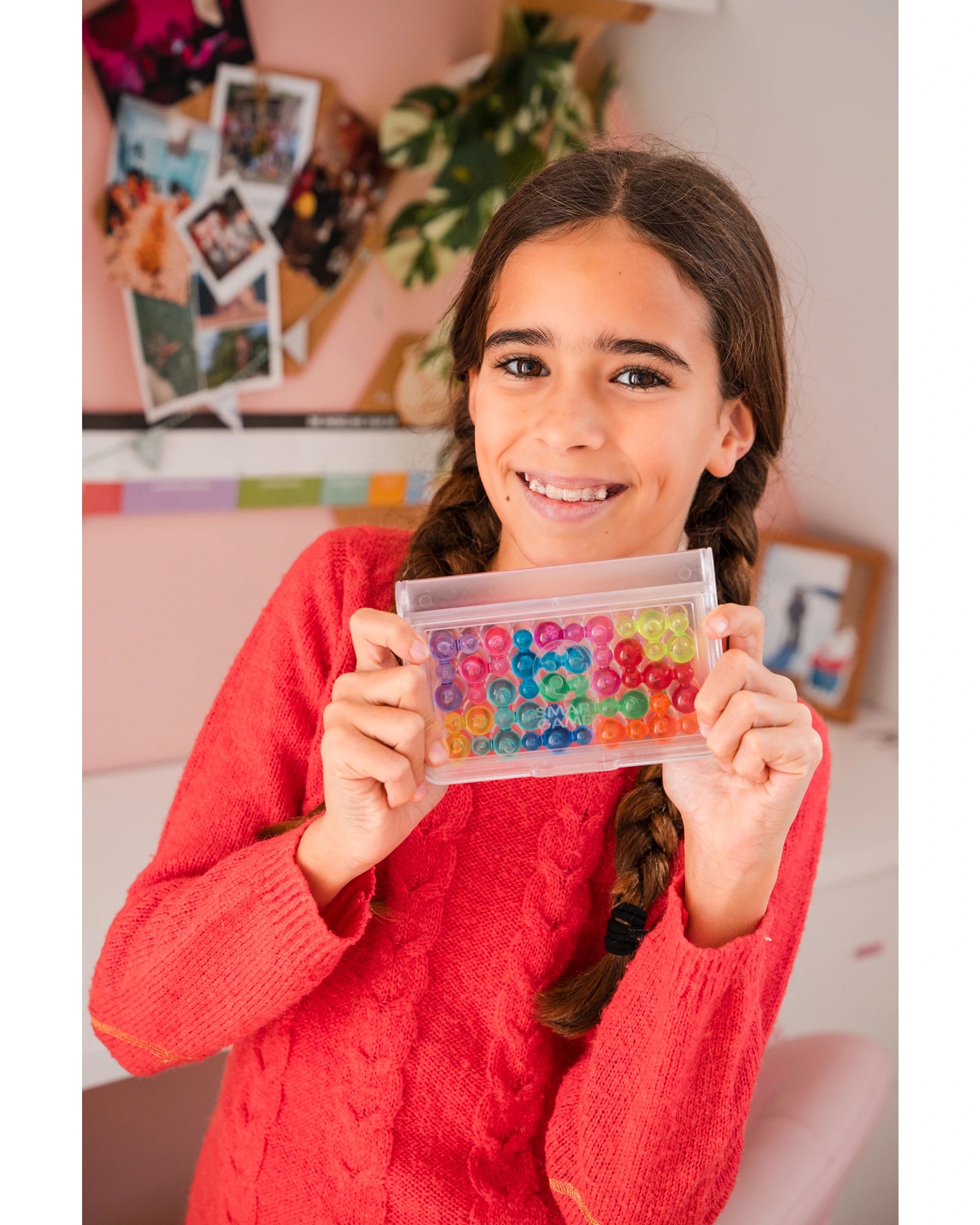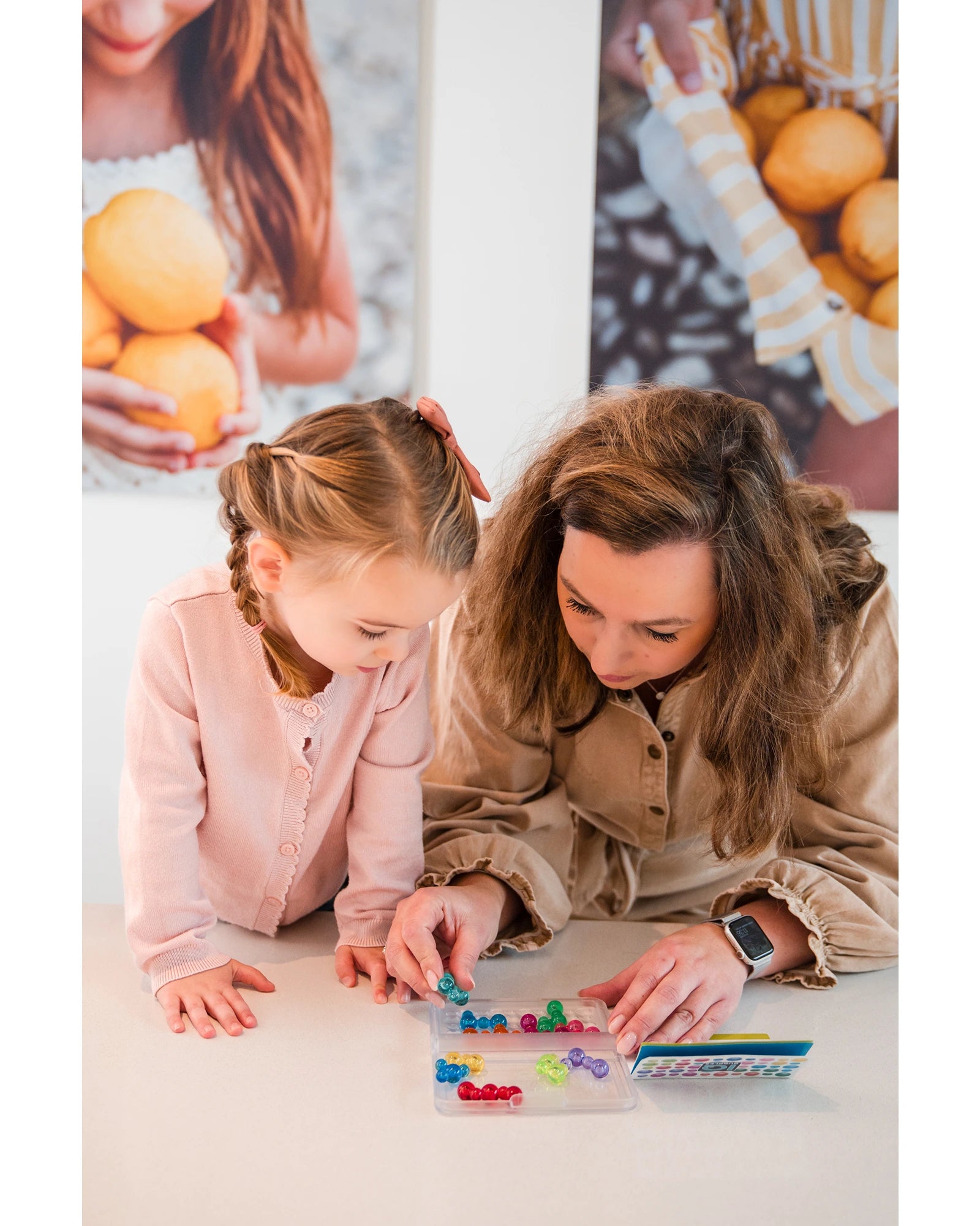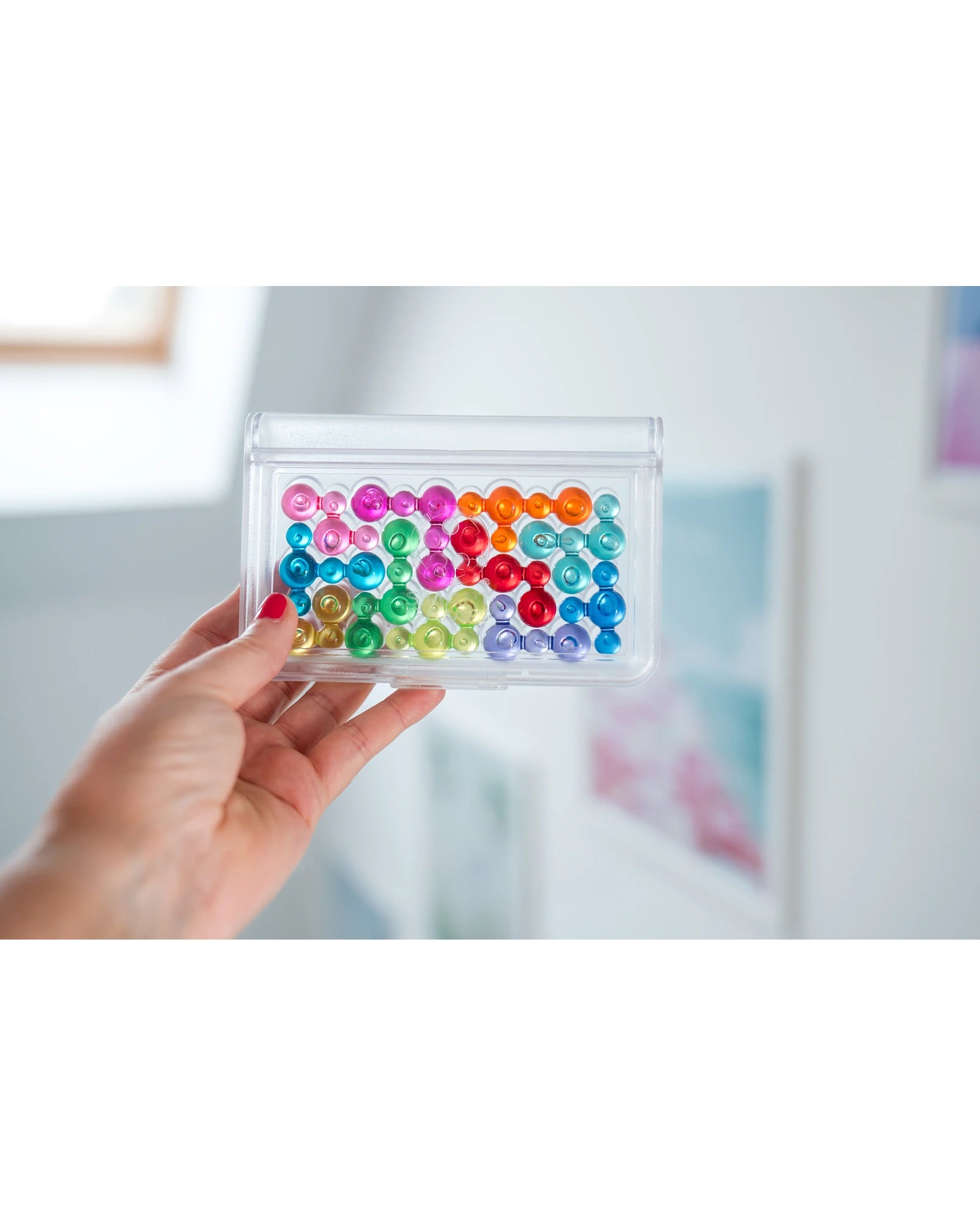 Test your brainpower with IQ Bubbles! This addictive puzzle game challenges players to fit all the colourful, transparent bubble pieces onto the travel-friendly gameboard/case. With 120 challenges to solve – from Starter to Wizard – IQ Bubbles is great for kids and adults! Compact game board with lid, 11 translucent puzzle pieces, booklet with 120 challenges and solutions, leaflet with game rules