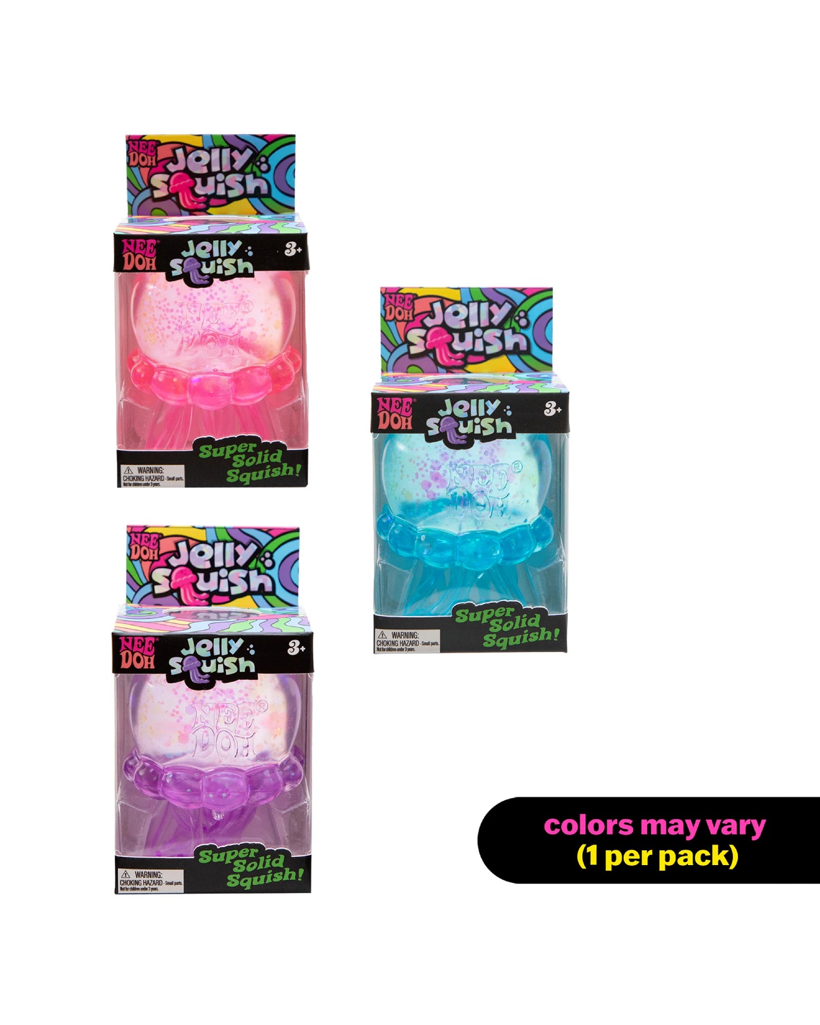 The Scylling NeeDoh Jelly Squish comes in 3 assorted colours (blue, pink, purple); it's squeezy, stretchy, squishy fun with a rhythmic jellyfish vibe.
