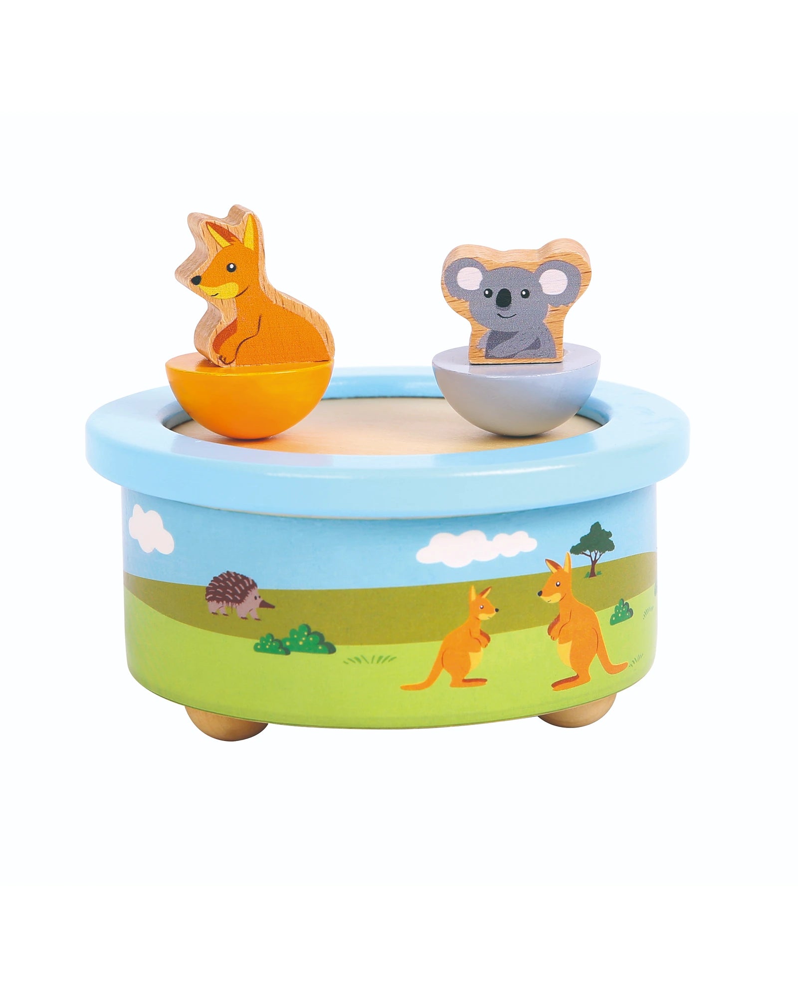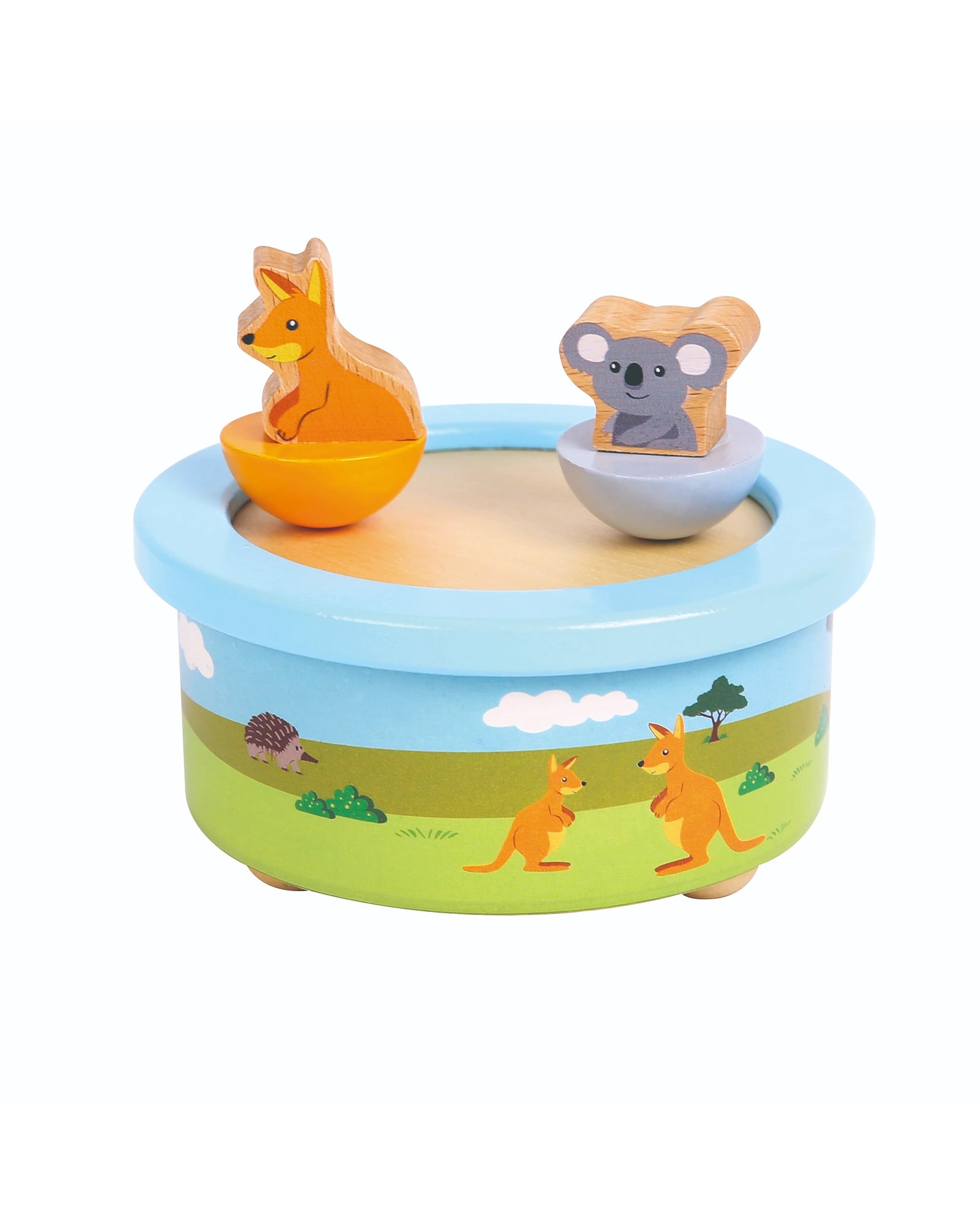 A gorgeous Australian animal wooden music box. Wind up and watch the koala and kangaroo spin round and round to a delightful Waltzing Matilda tune. Each box is hand crafted from wood and painted with non-toxic paint.