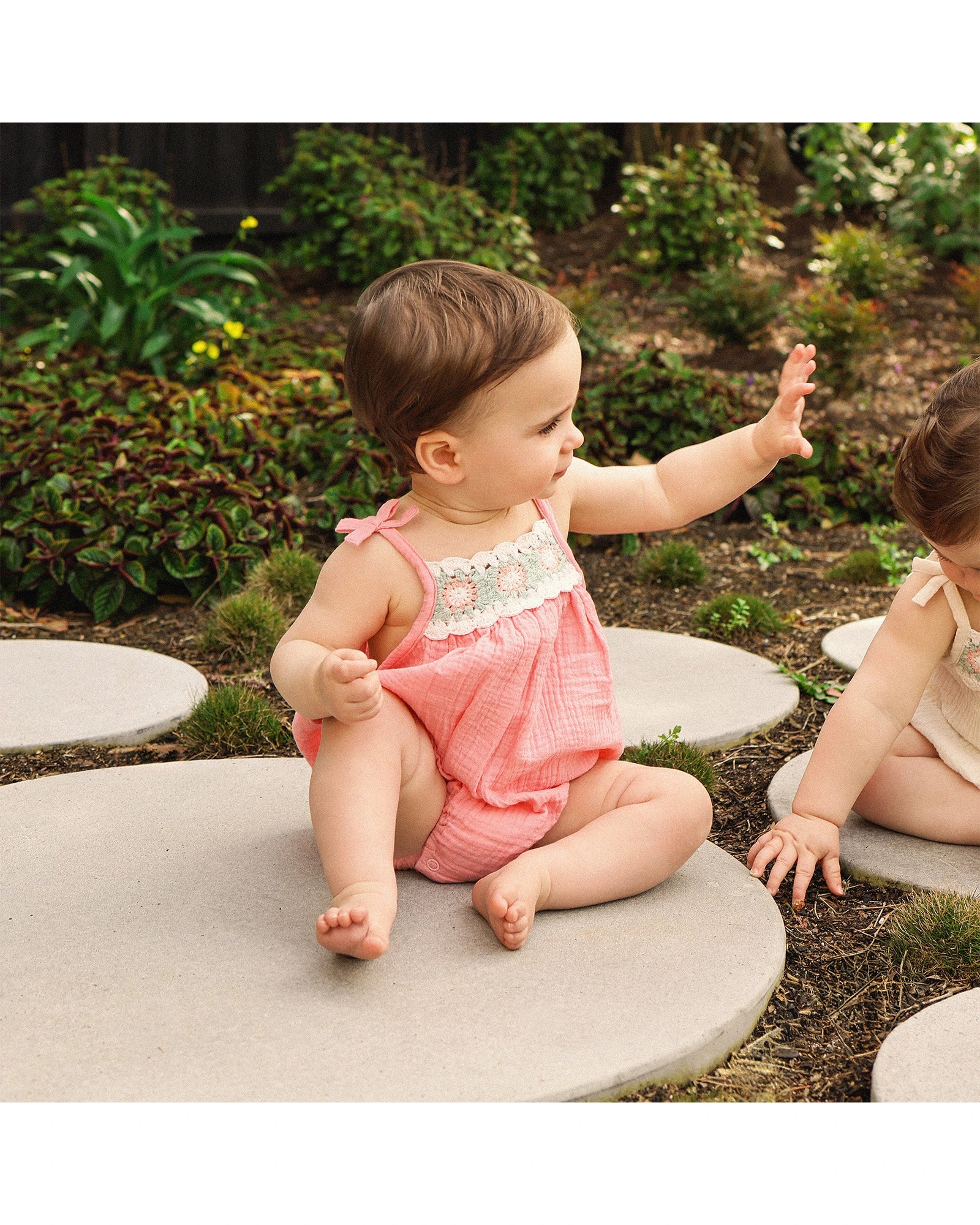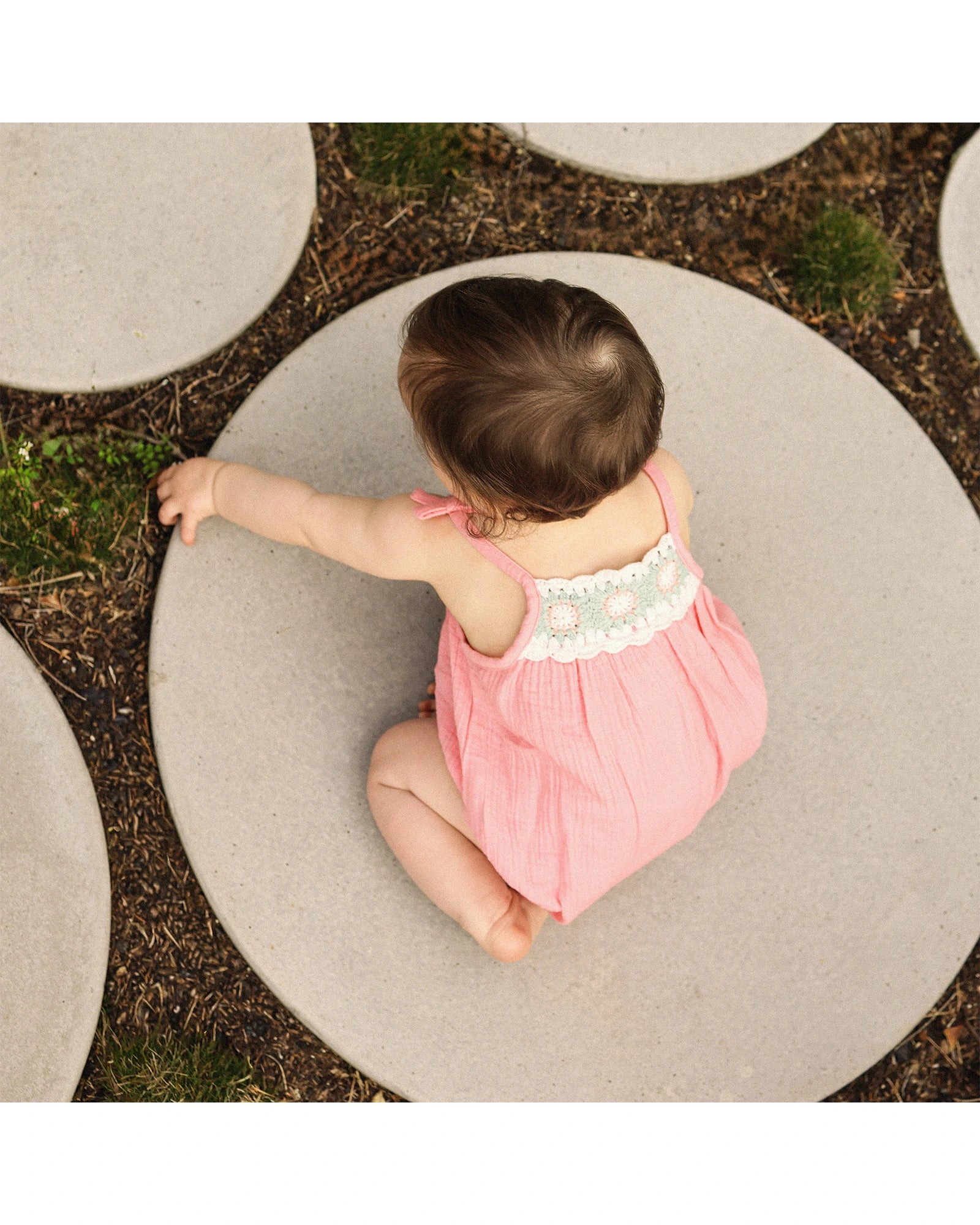 Our Crochet Woven Romper features a vintage style crochet bodice and a lightweight organic cotton muslin base. Soft and breathable for warm summer days, it’s designed with a relaxed fit and handy crotch snaps for easy changes. A sweet and timeless piece for sunny days or dressed up for special outings!
