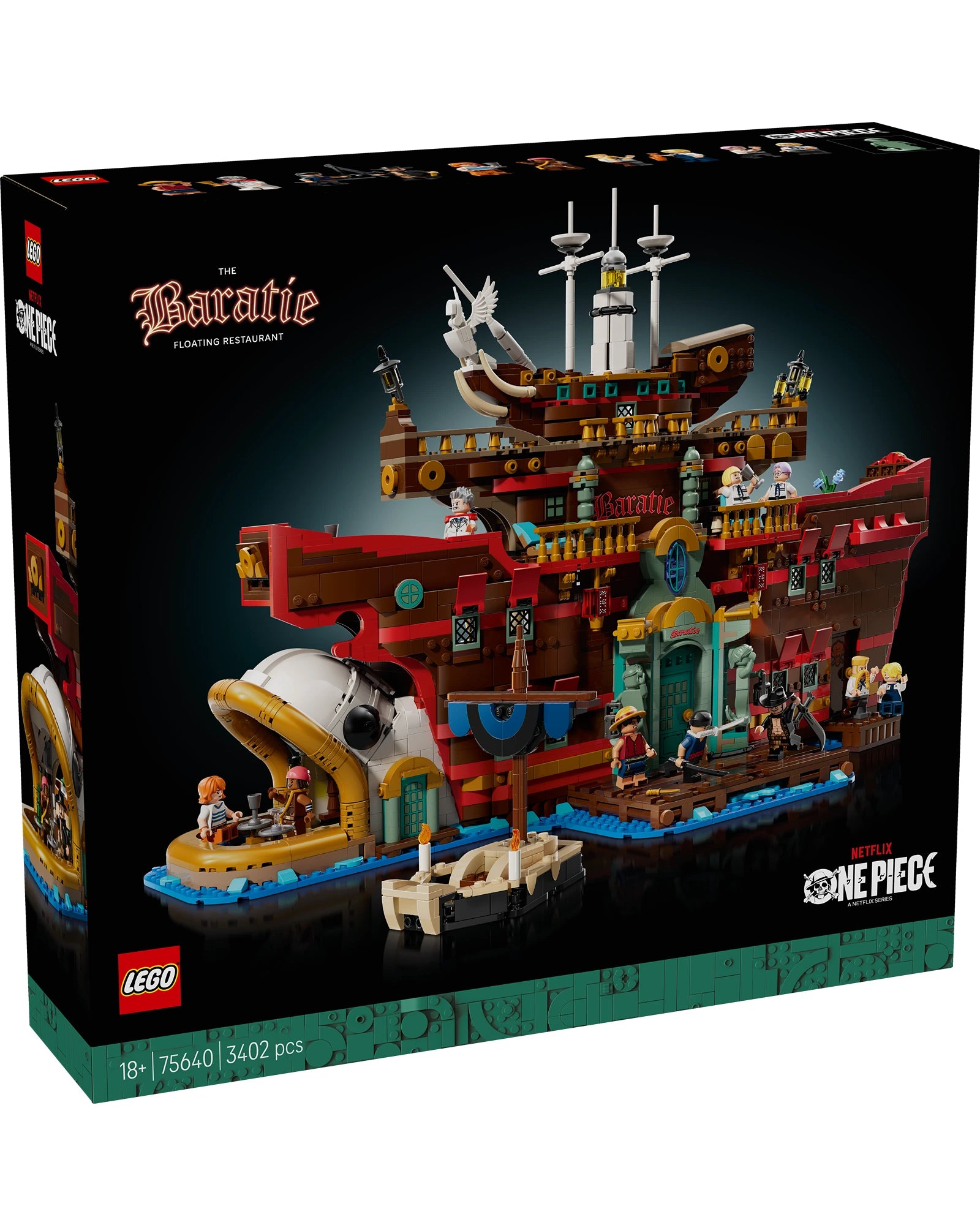 LEGO® ONE PIECE The Baratie Floating Restaurant (75640) recreates the iconic setting of many ONE PIECE adventures. A great gift for adult fans of the ONE PIECE Netflix live action show, the model is packed with authentic details and an iconic cast of minifigures from the show. This impressive ship-shaped display piece contains many accessible rooms within its interior, including kitchen and dining areas, Zeff’s quarters and the treasure room. Classic scenes can be reproduced with the 10 LEGO minifigures: Luffy, Zoro, Nami, Usopp, Sanji, Zeff, Garp, Helmeppo, Koby and Mihawk. This kit also contains authentic accessories, including 5 'Wanted' posters. The LEGO Builder app lets users zoom in, rotate models in 3D and track progress as they build. The extensive LEGO Sets for Adults range offers model-builders an immersive and rewarding experience. Contains 3,402 pieces.