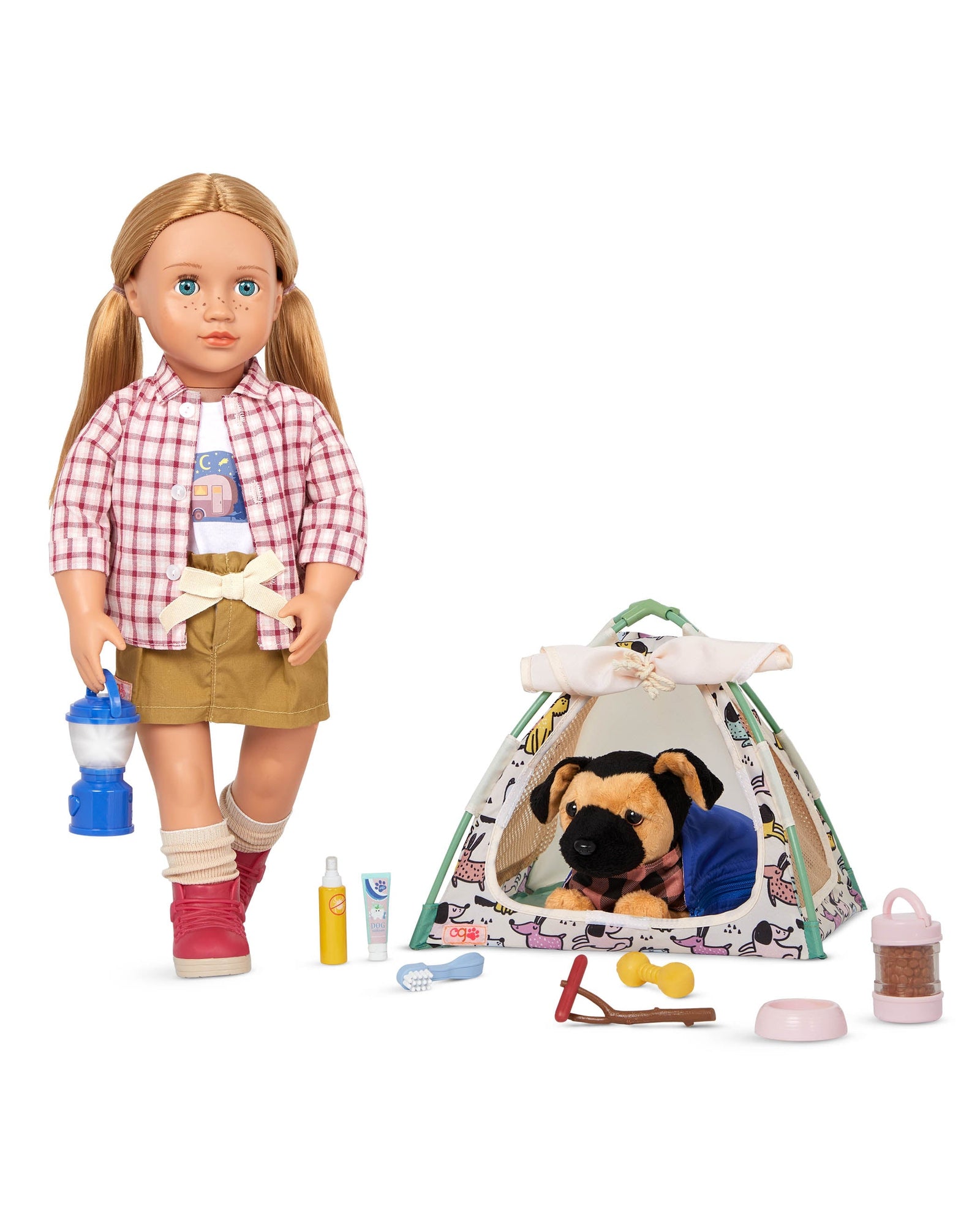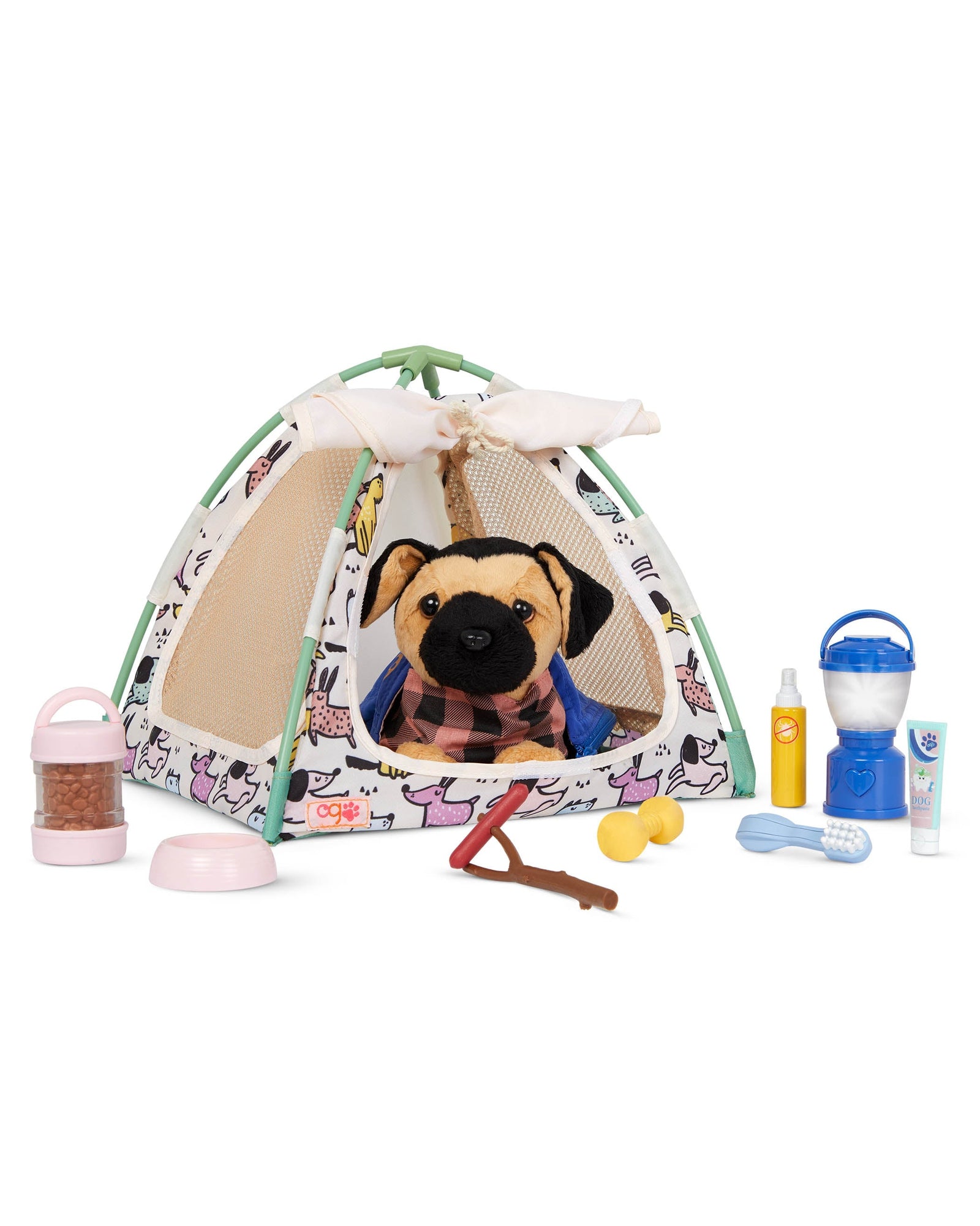 Your favorite puppy pals can now join their 18-inch doll campers or embark on fun solo adventures with the Our Generation Camping Tails set! Featuring a super cute tent for 6-inch pets, your doll besties and their loyal pals can camp out (or camp in!) side by side and enjoy starry nights together. Easily assemble the tent with the included poles to set the scene for a perfect campsite and tie-open the tent door so your pups can scamper inside.