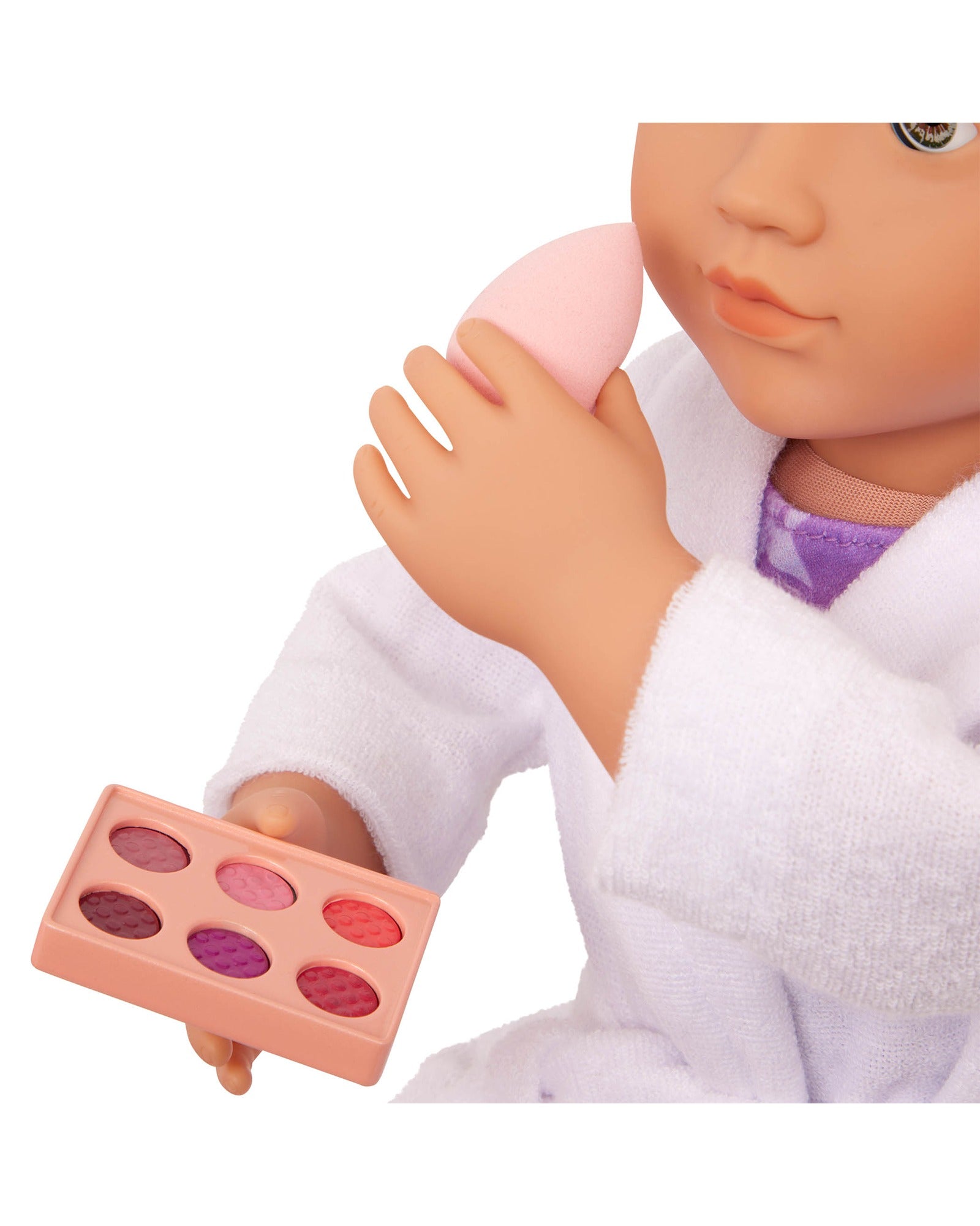 Light up imagination and create stunning styles with the Our Generation Fabulous Fun Vanity Set for 18-inch dolls! This charming vanity table and chair set are designed in pretty pink with golden details. Plus, it comes with pretend make-up accessories like a tube of mascara, lip gloss, an eyeliner pencil, a compact, an eyeshadow tray, foundation, lotion, a jar of eye cream, and a tube of cream for kids to give their dolls stylish makeovers. Plus, kids can pretend to apply the make-up with 3 brushes, an eyebrow comb, and a make-up sponge. The vanity table features a real mirror with plenty of counter space, a storage compartment, and a pull-out drawer to neatly store and display all items. And it's perfectly sized to turn playrooms and doll bedrooms into a dream glamor station. Compatible with most 18-inch dolls and accessories. Our Generation accessories make a great gift for kids ages 3+ (small parts), encouraging them to create their own unique stories. Our Generation dolls sold separately.