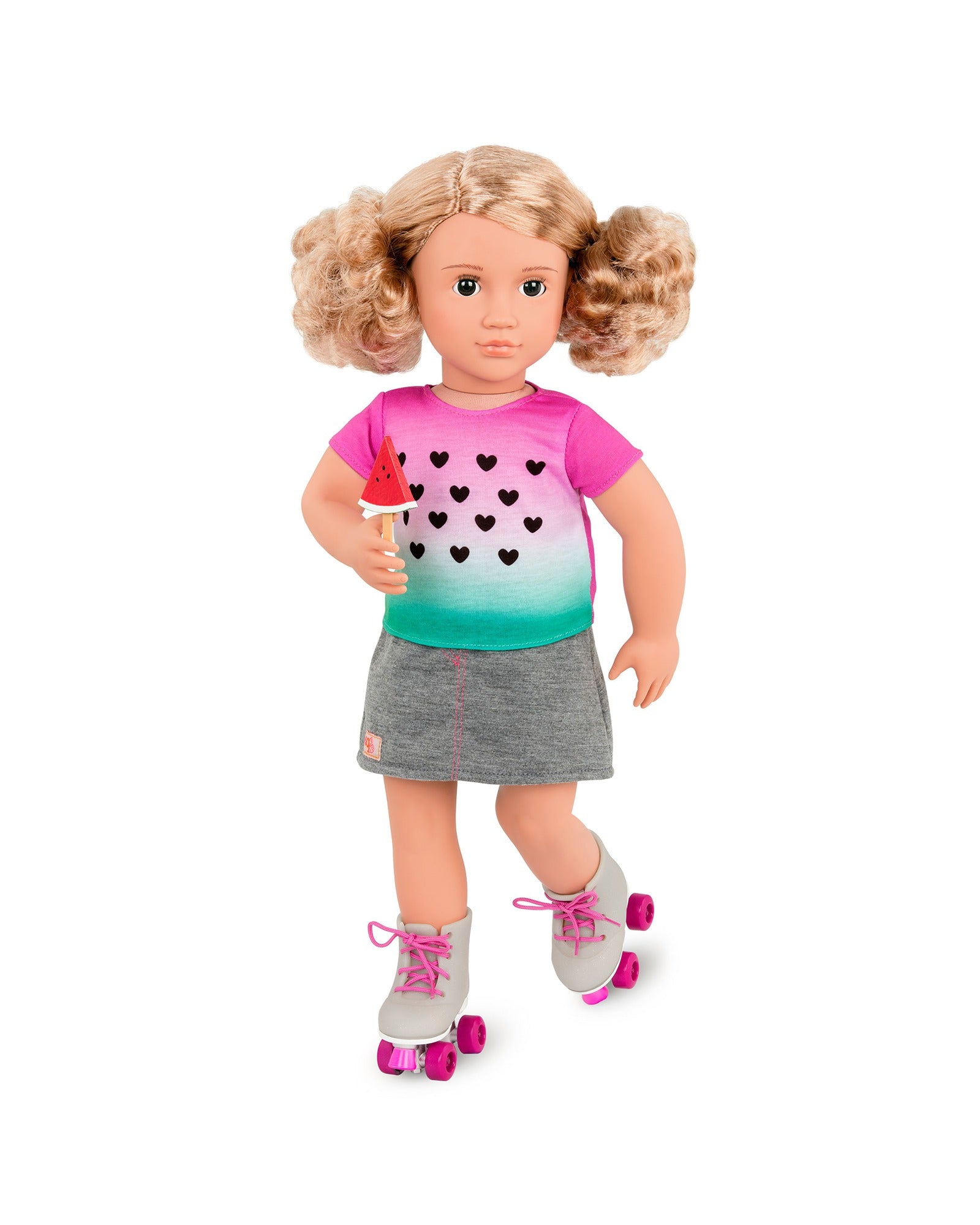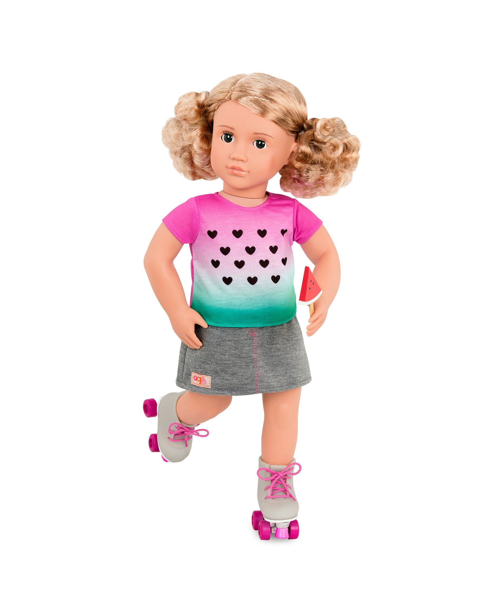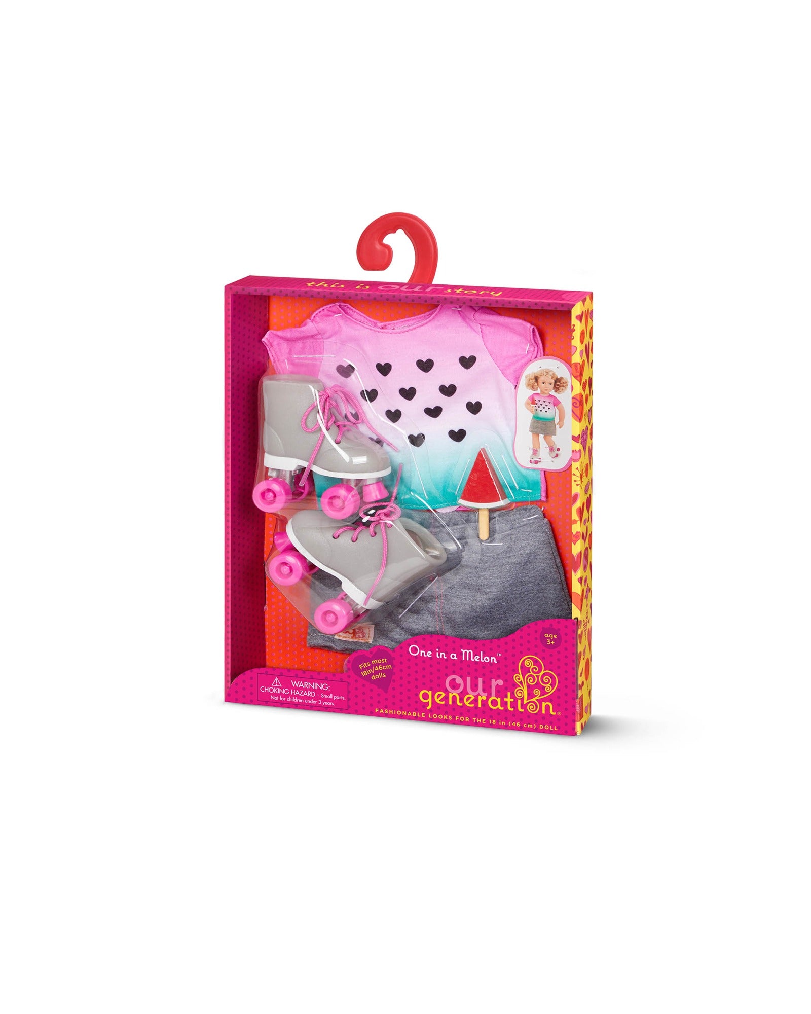 Roll into sweet style and fun adventures with the Our Generation One in a Melon outfit for 18-inch dolls! This colourful clothing set features a cute watermelon-print top with mini hearts as watermelon seeds, a stylish skirt, and a yummy treat for dolls to enjoy on the go. It also comes with adorable roller skates that really roll! When it's time for dress-up, this 18-inch doll outfit has easy-open closures to quickly put on and remove. So kids can mix, match, and create more stylish looks as they explore imagination and self-expression. Our Generation 18-inch doll clothes make a great gift for kids ages 3+ (small parts), encouraging them to create their own unique stories. Compatible with most 18-inch dolls, doll clothes, and accessories. Dolls sold separately.