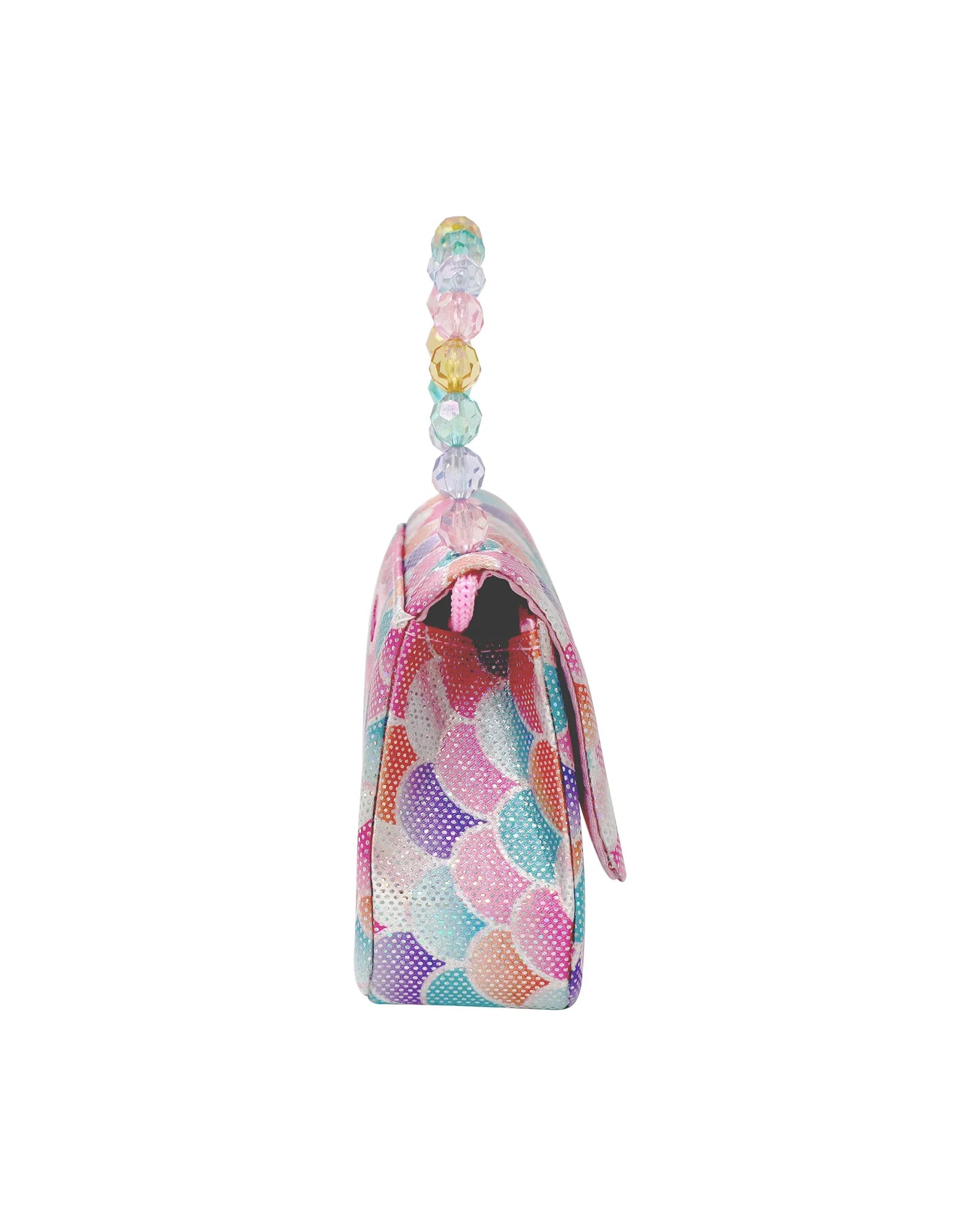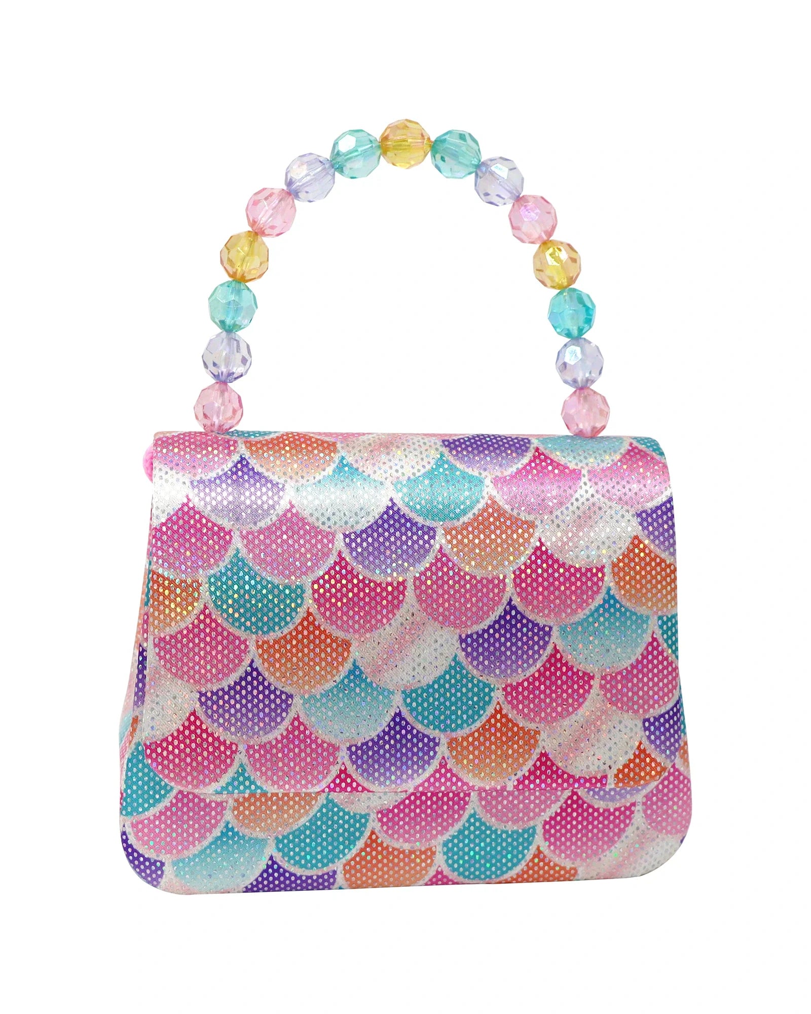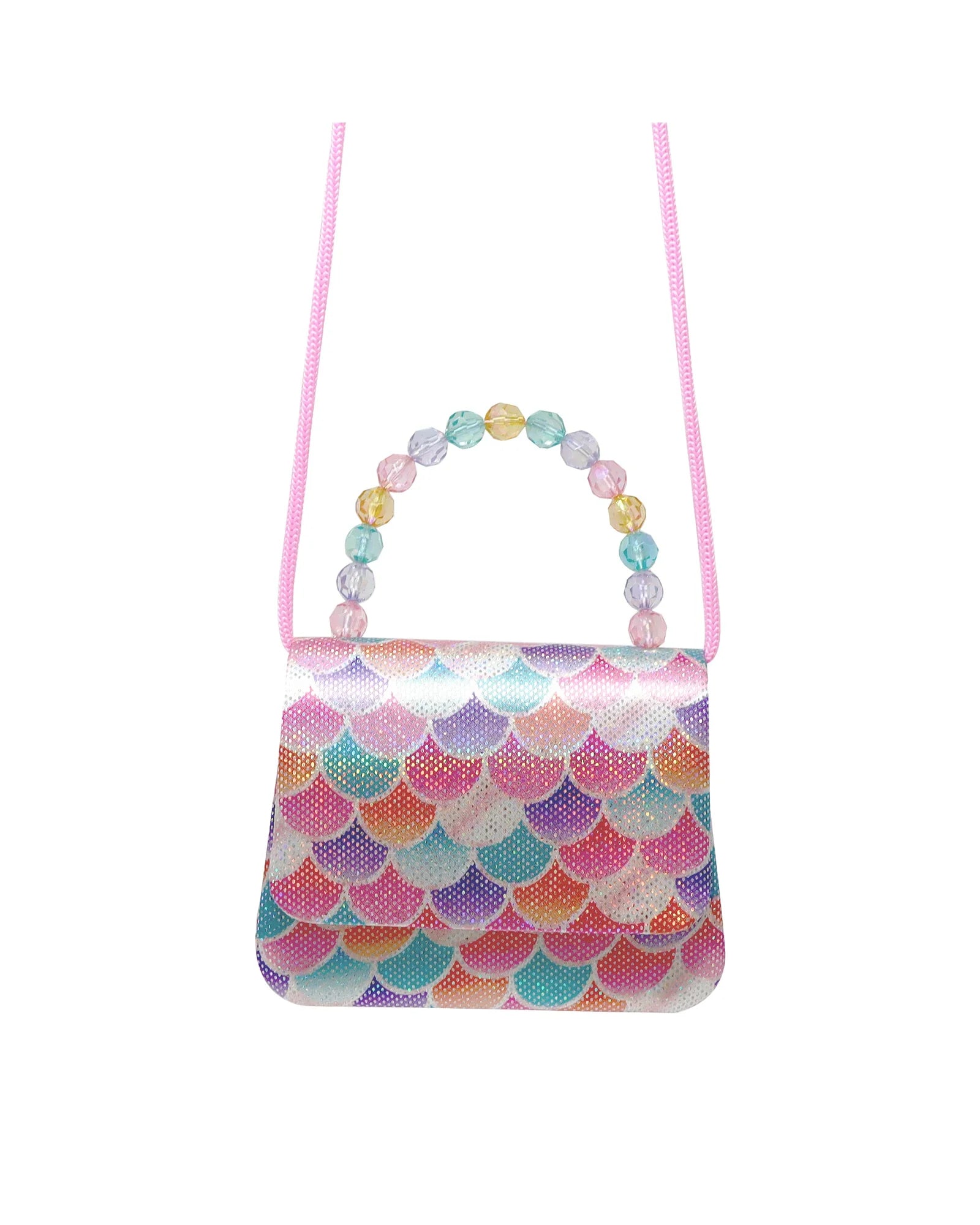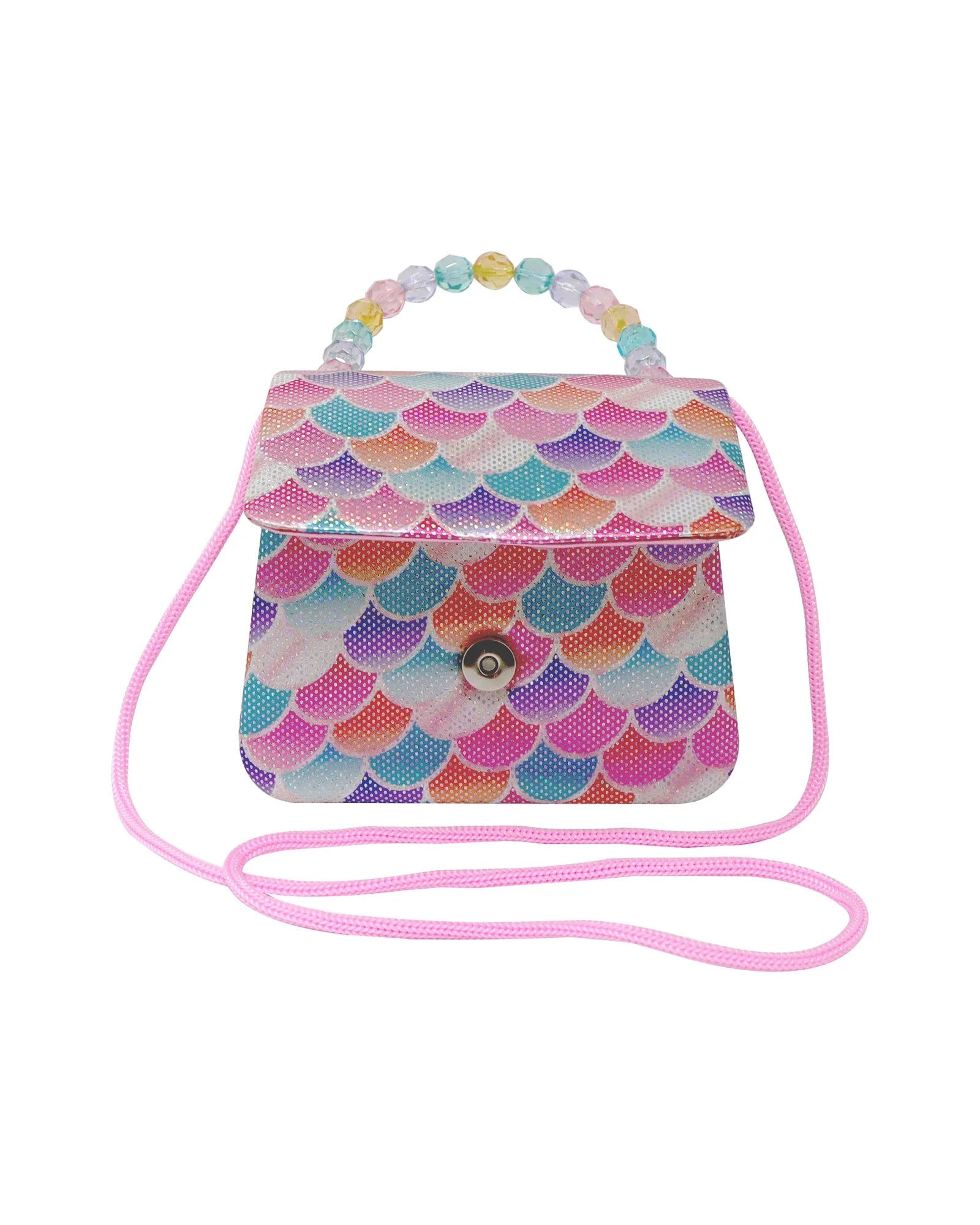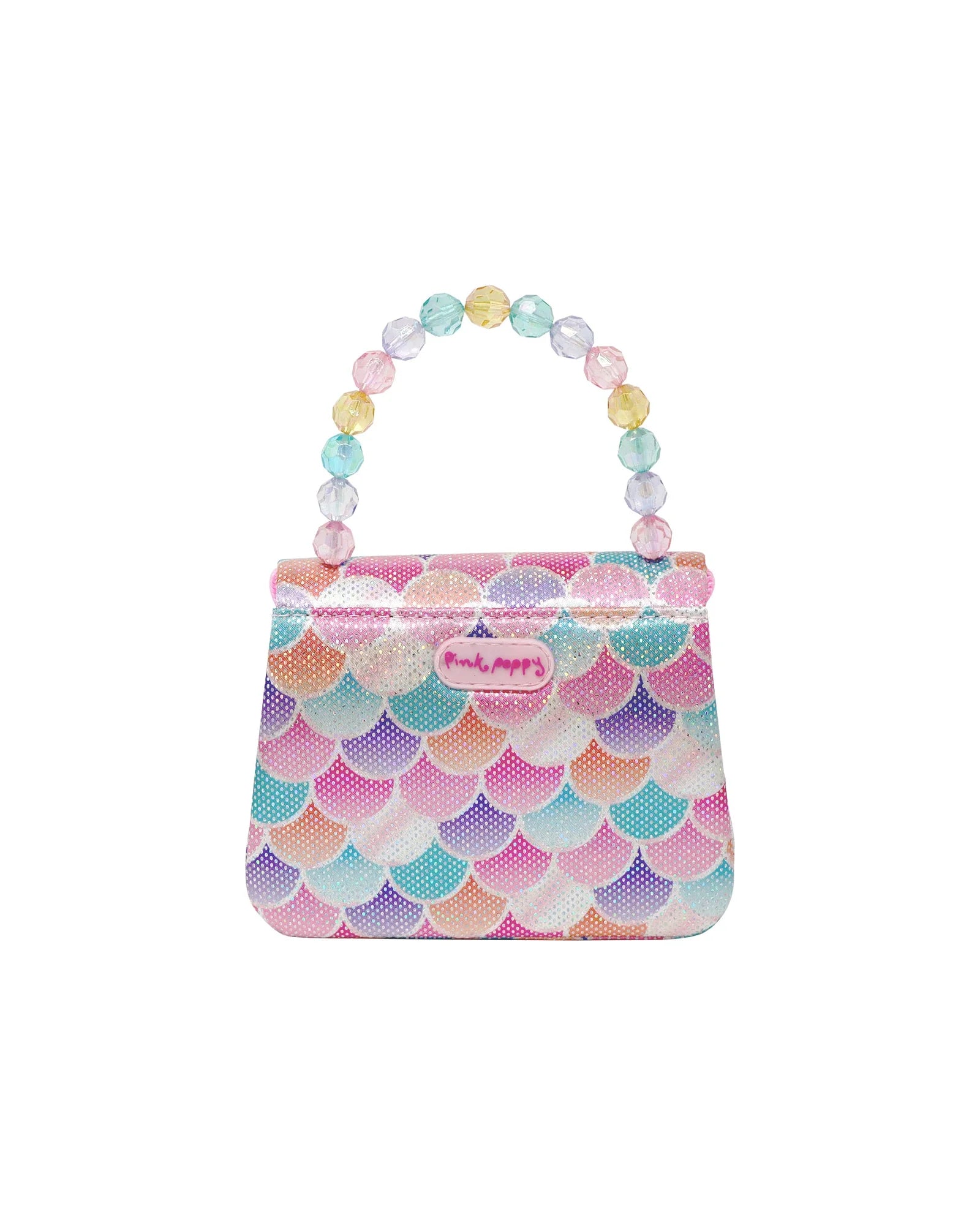 This Iconic Pink Poppy's Shimmering Mermaid Scale Hard Handbag is decorated in shiny fabric with fun mermaid scale prints. Features a magnetic stud for easy closure and an additional cord shoulder strap for hands-free play.