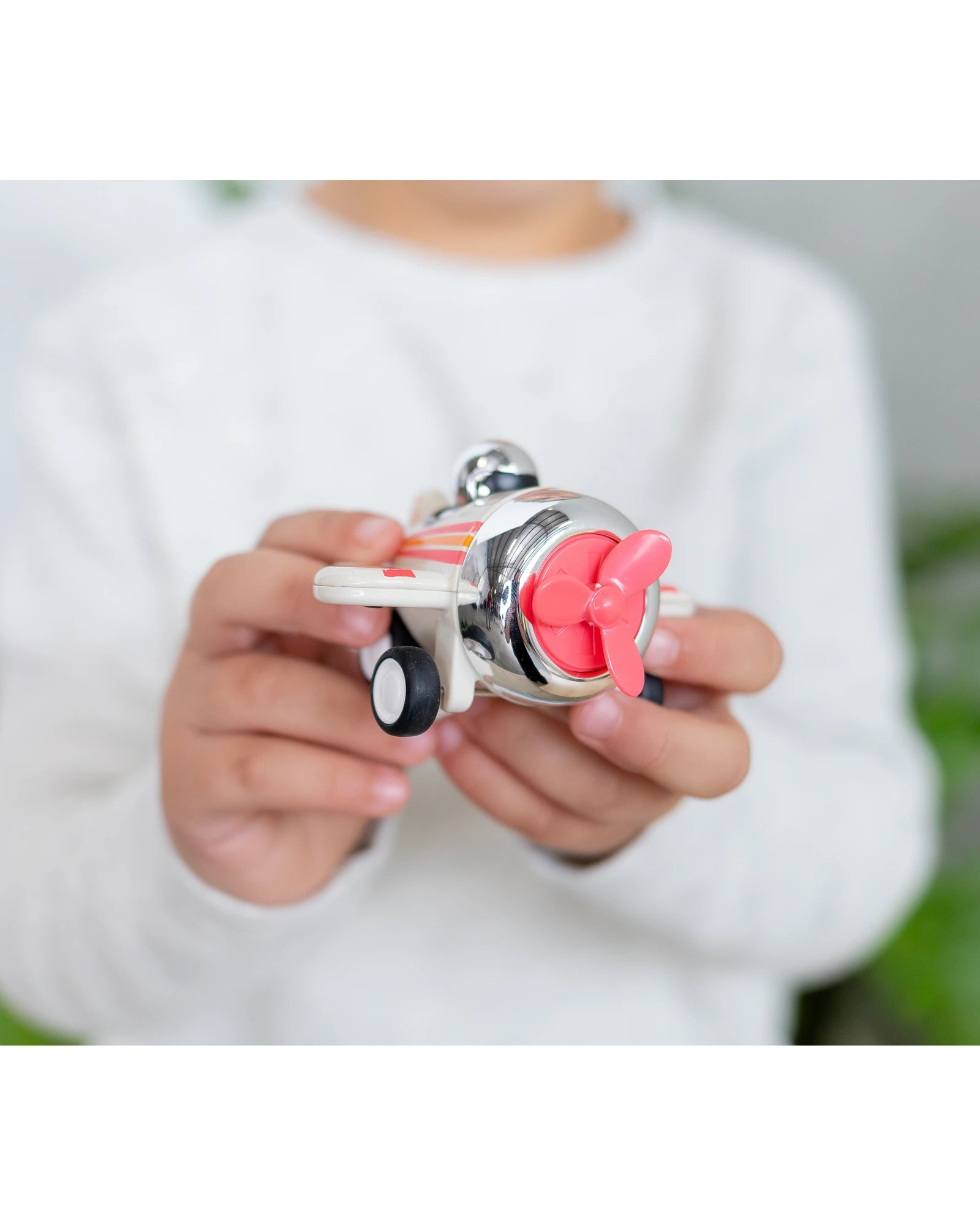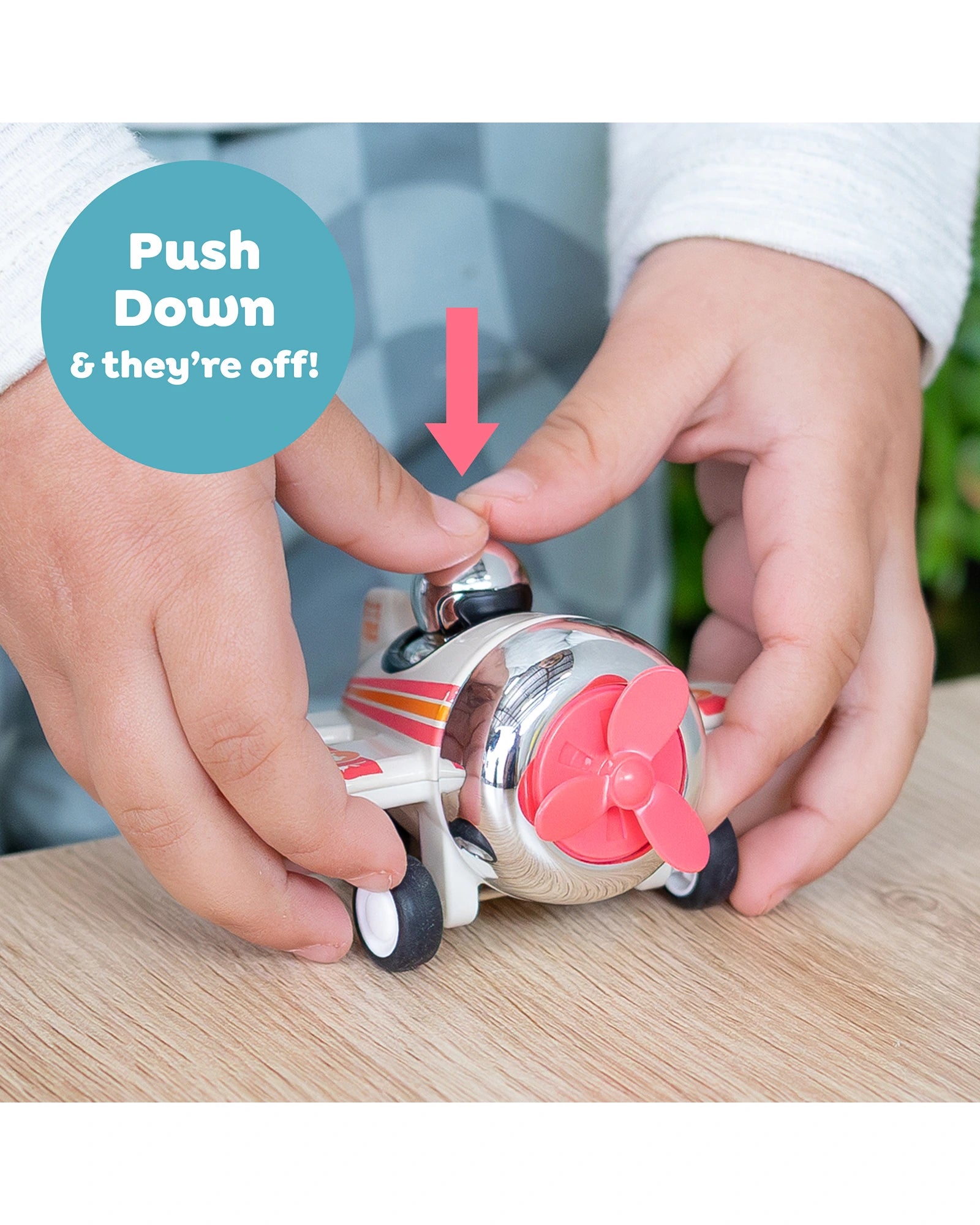 Hey, presto! Tiger Tribe's fun battery-free retro mini racing planes are ready to roll (not fly!) Kids will have a hoot with these nimble little planes, activating the forward momentum with a simple push-down, and they're off - taxiing down whatever runway you can find! In three fun and collectable designs - Swoop (Red), Lofty (Blue) and Drifter (Cream).