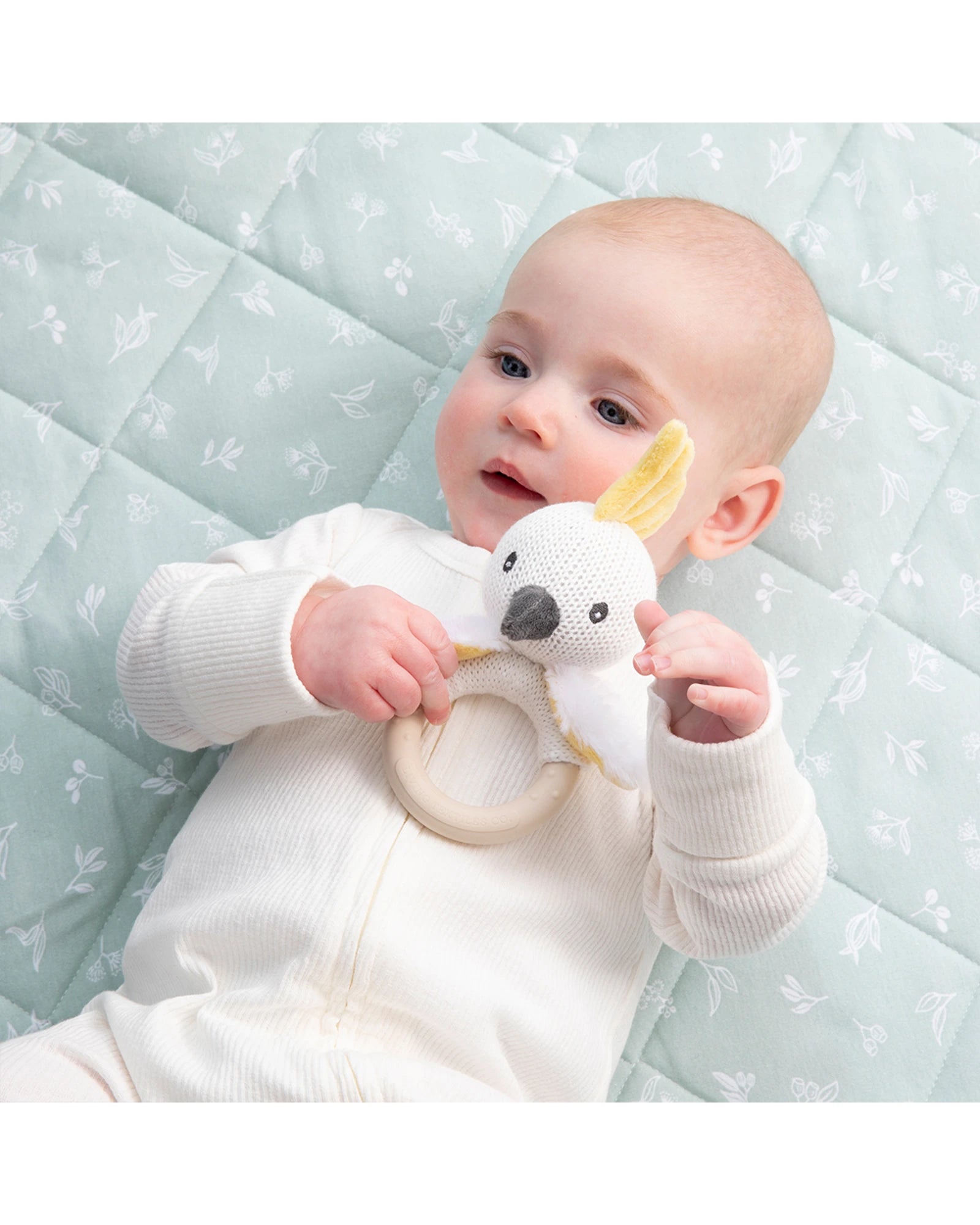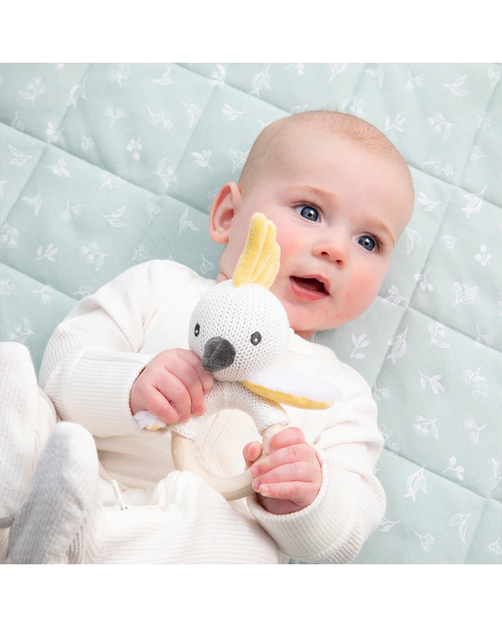 Delight and soothe your little one with our charming Cockatoo Rattle. Crafted from soft cotton knit with a handmade feel, it features a gentle jingle and a BPA-free silicone teether ring - perfect for tiny hands and growing gums.
