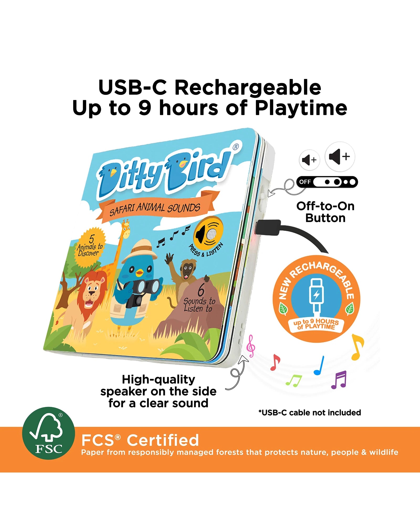 Let’s go on a jungle safari with a ditty bird to discover the sounds of African wild animals. A gentle touch of the ‘sound dot’ on each page will trigger real-life sounds of five favorite animals along with a song in Lingala!