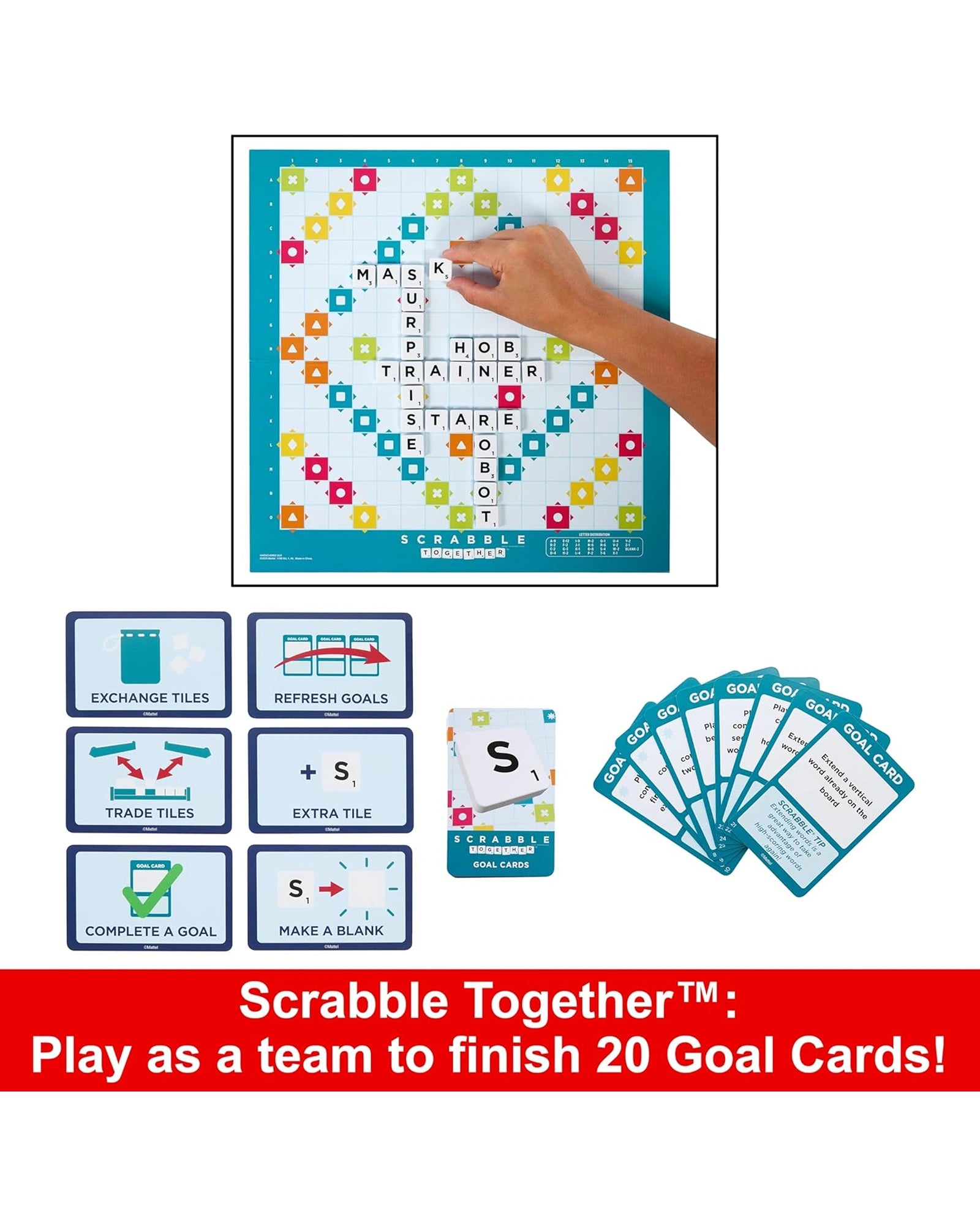 Experience Fun Beyond Words with the Scrabble® board game, now featuring two games in one! Players can enjoy the classic Scrabble® crossword game they know and love building words and angling for Double Letter and Triple Word scores or they can flip the board and try Scrabble Together™, a quick, casual game where players cooperate to complete word challenges. These two games spell FUN for longtime and new players alike!