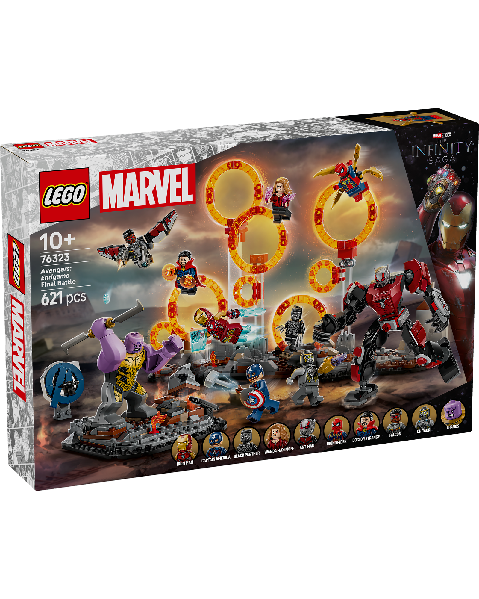The authentically detailed LEGO® ǀ Marvel Avengers: Endgame Final Battle (76323) buildable playset is filled with iconic Super Heroes, including Iron Man and Black Panther minifigures, plus cool features and accessories to inspire endless creativeadventures for boys and girls aged 10 and up who love build-play-and-display toys and Super Hero fun. Recreating the epic showdown from Marvel Studios’ Avengers: Endgame, this buildable playset features sling ring inter-dimensional portals and 9 minifi gures: Captain America (with shield), Iron Man MK85 (with sword and shield), Chitauri (with arm-mounted shooter), Ant-Man, The Scarlet Witch (with flame elements), Doctor Strange, Iron Spider (with 4 movable ’legs’ on his back), Black Panther and Falcon (with 2 stud shooters). A large Thanos LEGO figure, a fully jointed Ant-Man mech, 2 rock-explosion functions and endlessly versatile reconfigurability ensure Super Hero action on an epic scale. Set contains 621 pieces.