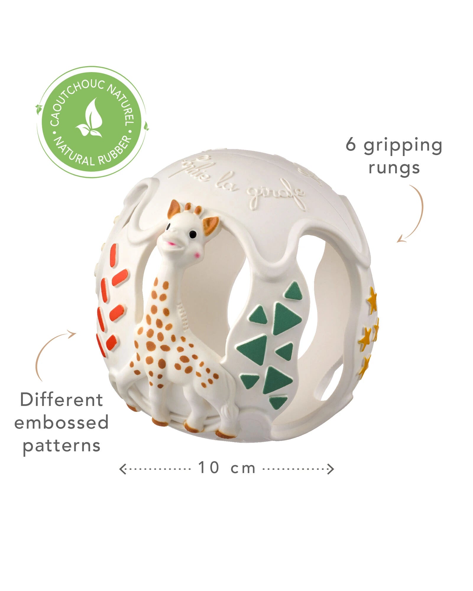 Made from 100% natural rubber, this sensory and teething ball is perfect for developing baby's grip and tactile awakening: several raised patterns (stars, triangles, circles, etc.), hollow areas, more or less wide bars and the silhouette of Sophie the giraffe in relief. Lightweight and easy to grasp by little hands, baby has fun grabbing and handling it!