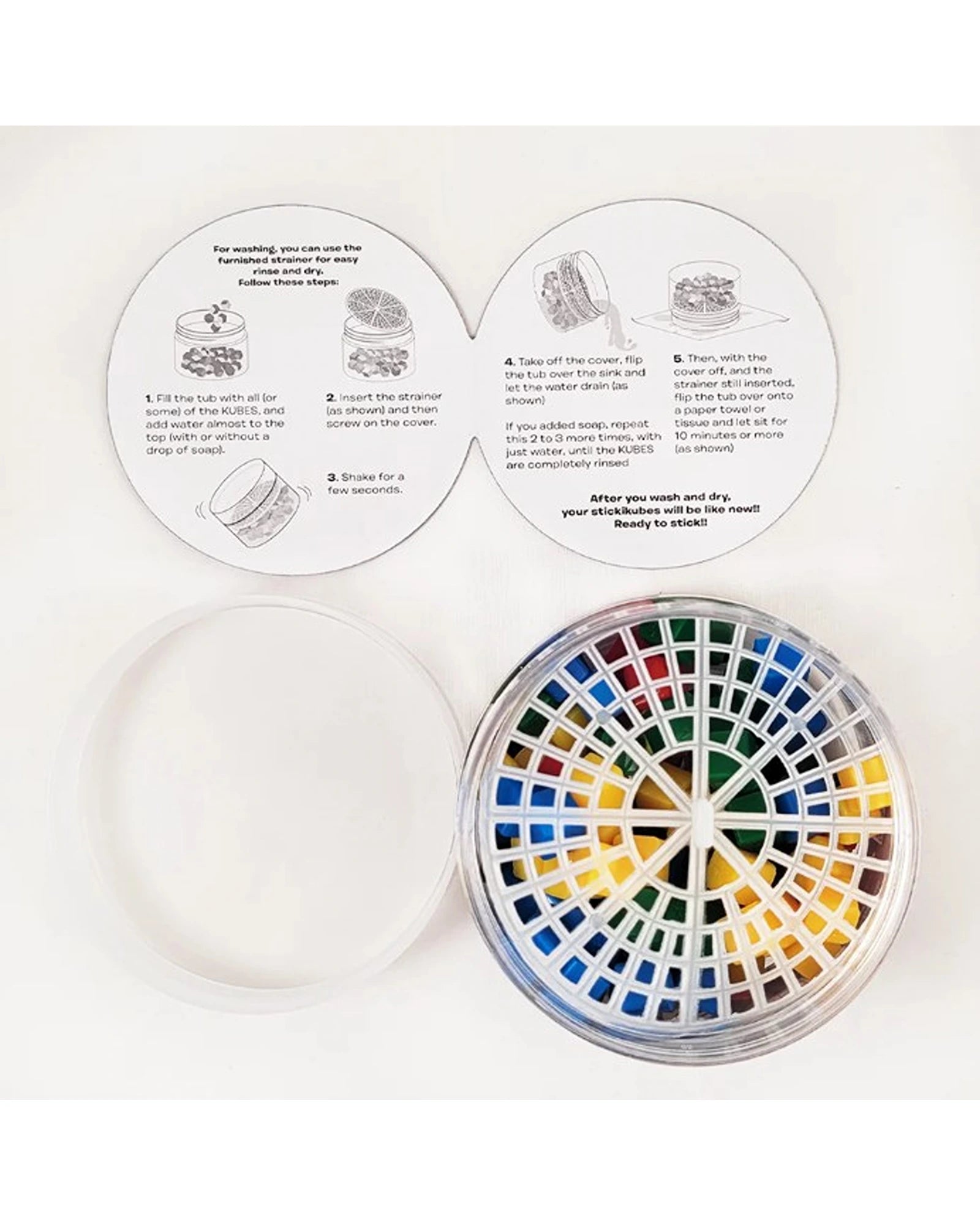 Includes 125 StickiKubes in 4 classic bright colours: Blue, Red, Yellow, and Green. Comes in a reusable plastic tub with built-in strainer for quick cleaning and easy storage.