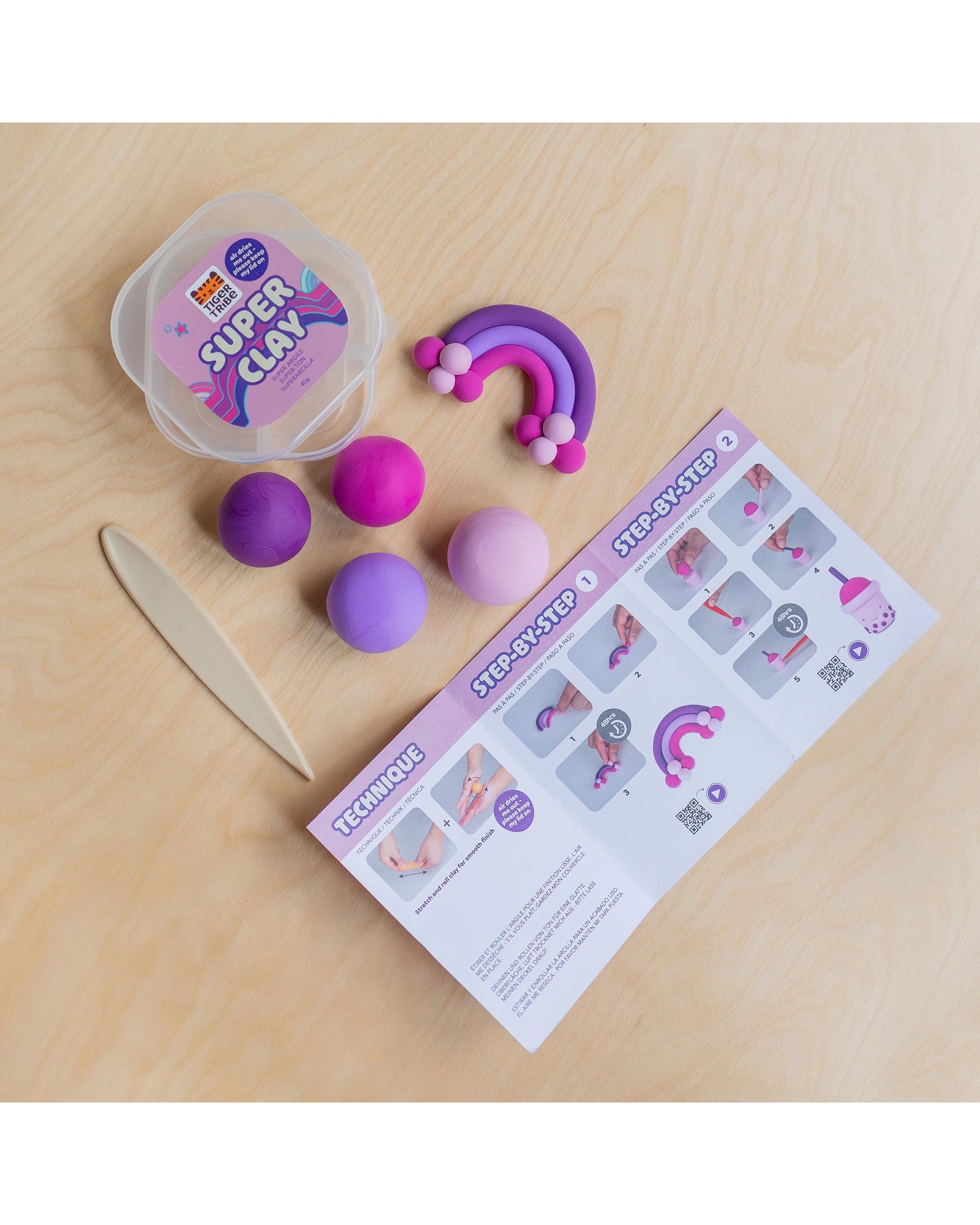 Tiger Tribe Super Clay brings big ideas to life with soft, lightweight, air-drying clay. Super Clay – Twilight invites kids to roll, knead and sculpt vibrant colours to create two fun characters —rainbow and bubble tea— using step-by-step visual instructions, or to shape whatever their imagination comes up with. No oven needed — just air-dry for play or display. Non-toxic and easy to use, this clay is perfect for sensory play and helps early learners build hand strength and fine motor control — ideal for developing writing and drawing skills. Comes in a resealable container to keep the fun mess-free and fresh.