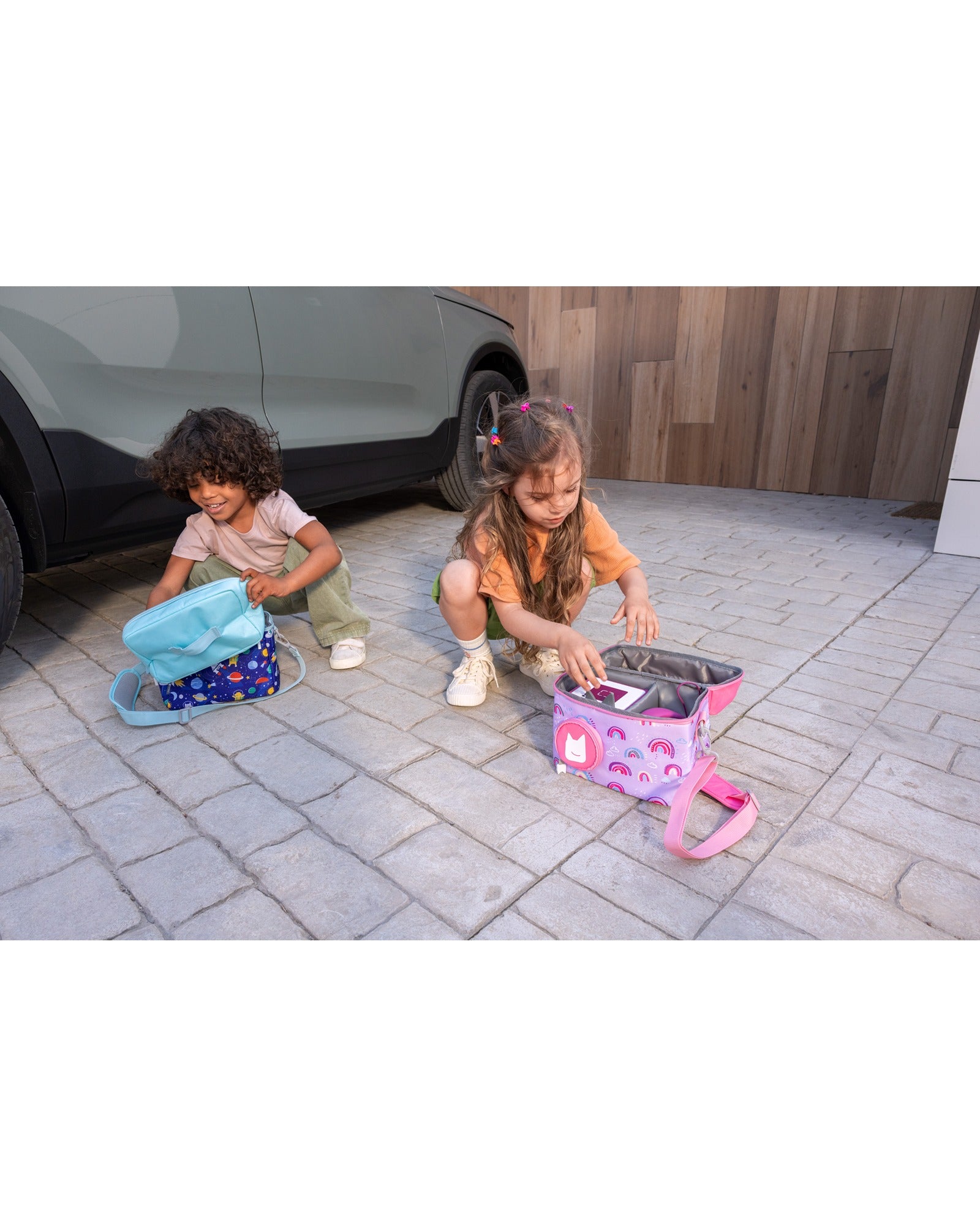 The Listen & Go Bag is available in 2 designs. Fly through the galaxy with the blue Stargazing bag or discover the fairy world with the pink Over the Rainbow bag!