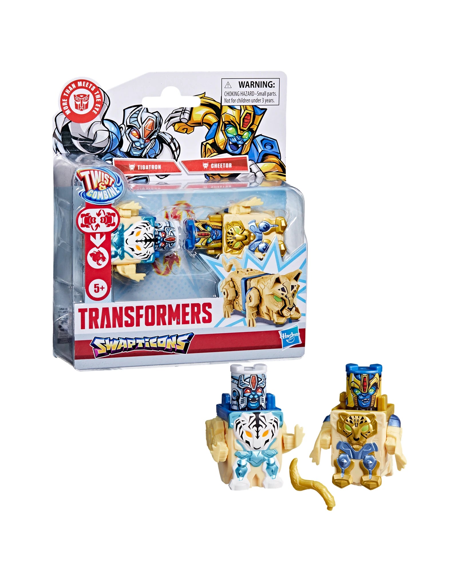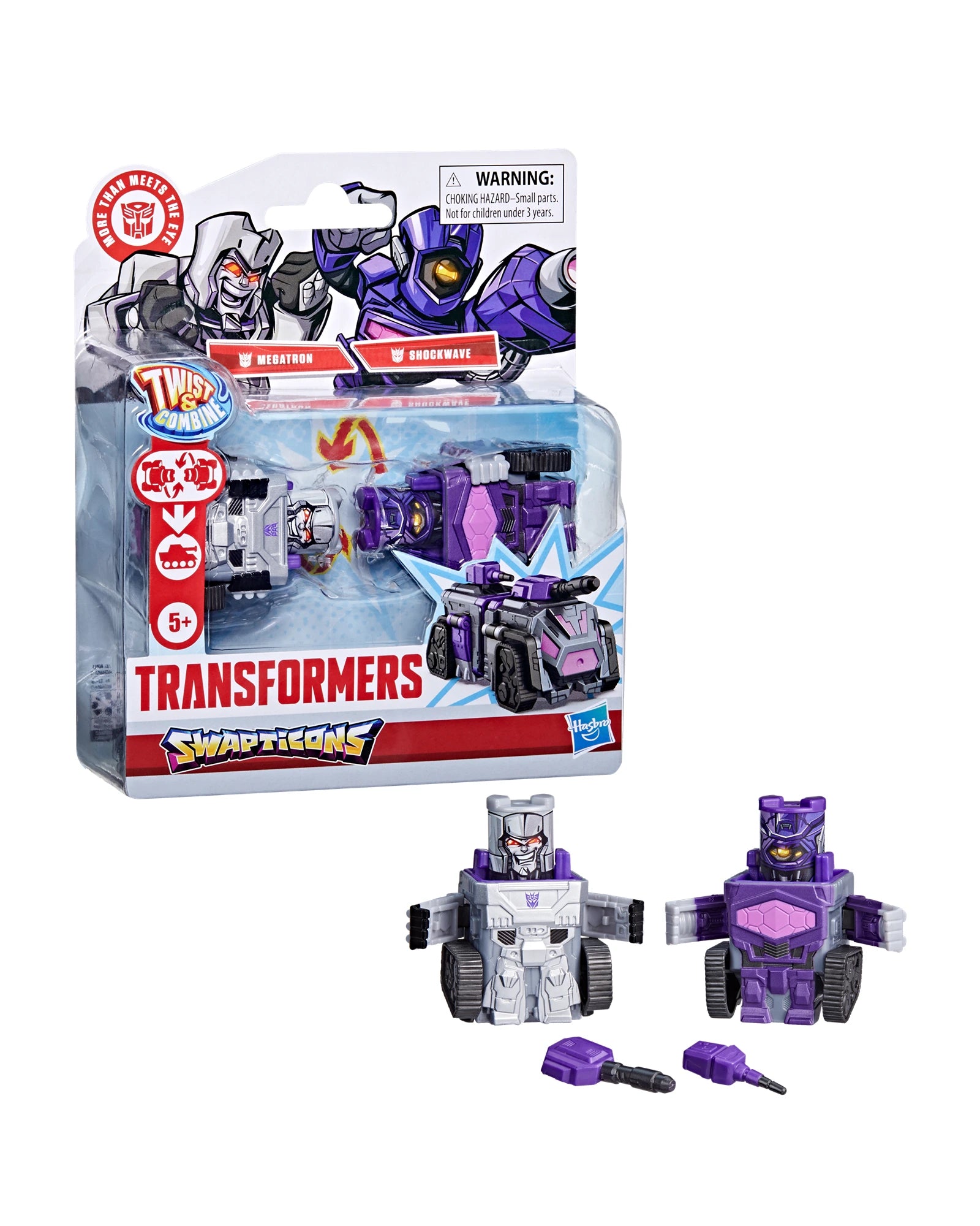 Match, twist, combine, and repeat with Transformers Swapticons! These stylized small action figures twist together into unique alt modes. Twist again to release! These Transformers toys are perfect for fidgety fun, and since each figure is just 2 inches (5 cm) tall, they also make awesome travel toys. Look for more Swapticons action figure sets (each sold separately, subject to availability) and marvel at the imagination possibilities! Twist together 2 Autobots or 2 Decepticons and imagine a powered-up hero or villain alt mode, or mix them up for super Cybertronian chaos! These interactive toys for kids make fun stocking stuffers, Easter basket stuffers, or small gifts for boys and girls ages 5 and up. TRANSFORMERS and HASBRO and all related trademarks and logos are trademarks of Hasbro, Inc.
