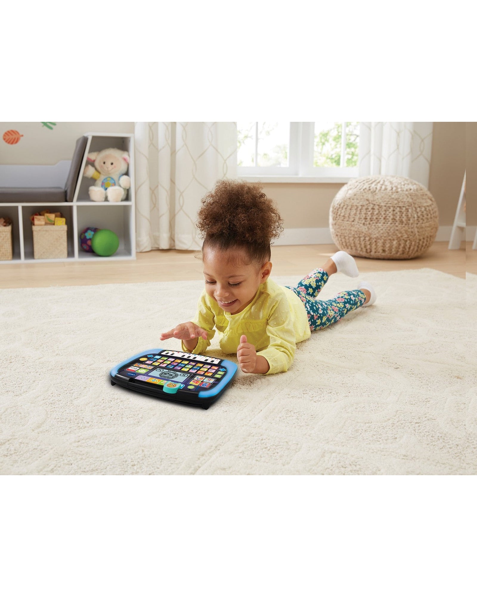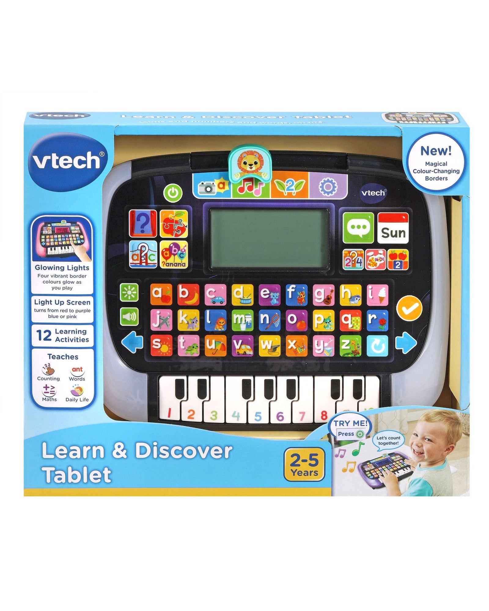 - Add early maths skills with number, order and counting games; explore days of the week and daily activities. - Enhance language skills with four letter games that teach letters, words and spelling. - Meet the friendly lion and answer his questions about animal sounds and more. - Play music and sounds with piano keys and letter buttons; change the LED screen from red to purple, blue or pink, and watch the tablet glow.-